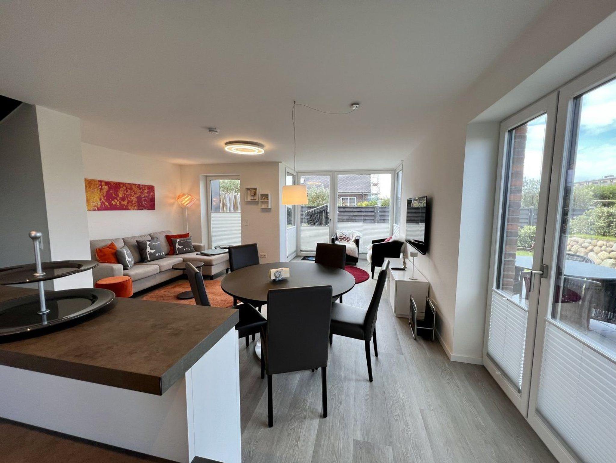 Das Ferienhausteil liegt in einer ruhigen Gegend im Steintal in Hörnum.Vom Wohnzimmer gibt es einen direkten Zugang zum eigenen Gartenanteil wo von Ostern bis Herbst ein Strandkorb sowie Gartenmobiliar zur Verfügung steht. Die beiden Schlafzimmer im Obergeschoss stehen mit Flatscreen TV zur Verfügung. Im Untergeschoss befindet sich Ihre persönliche Wohlfühloase mit einer privaten Sauna und einem Ruheraum und einem großen Duschbad.