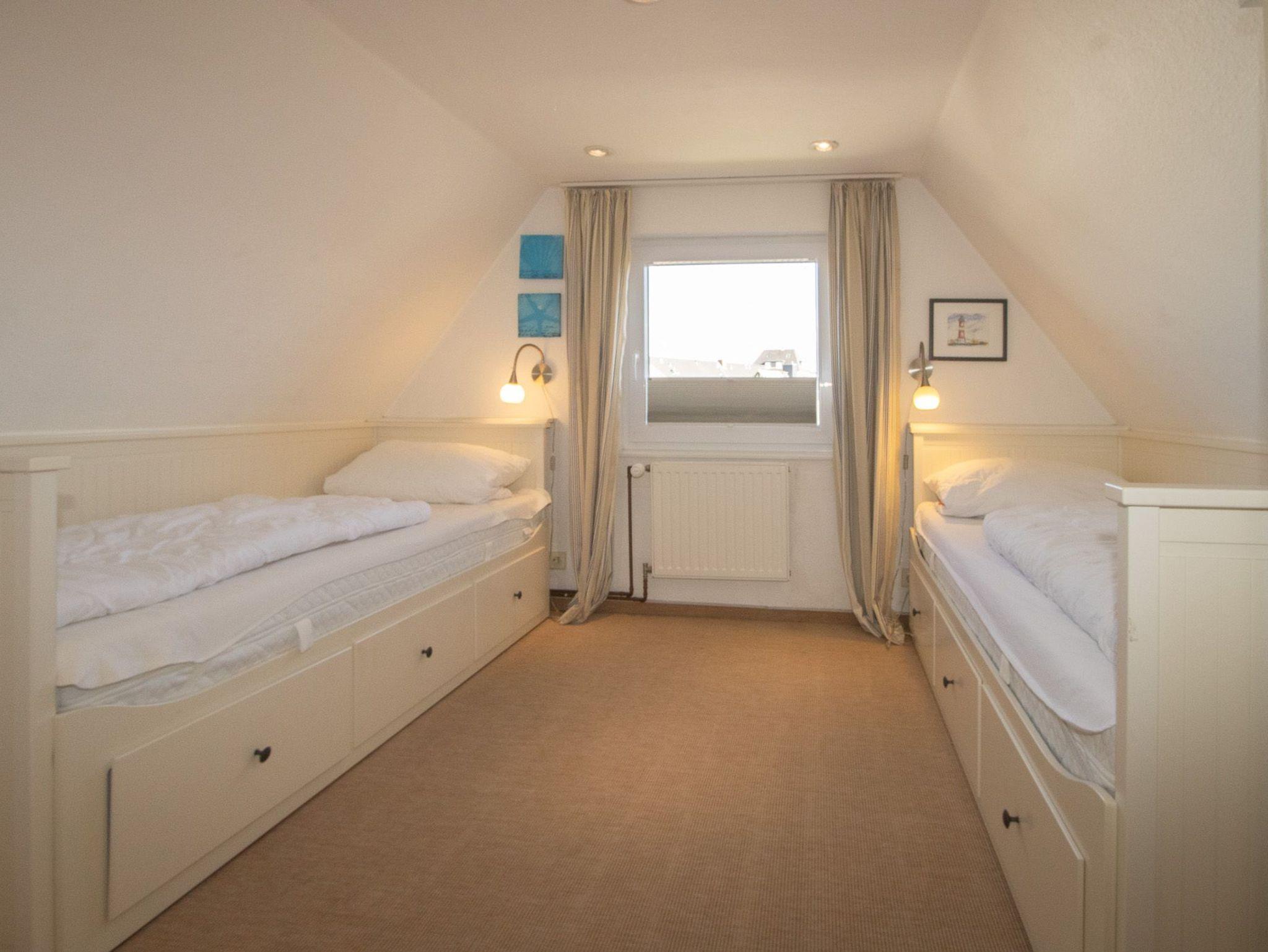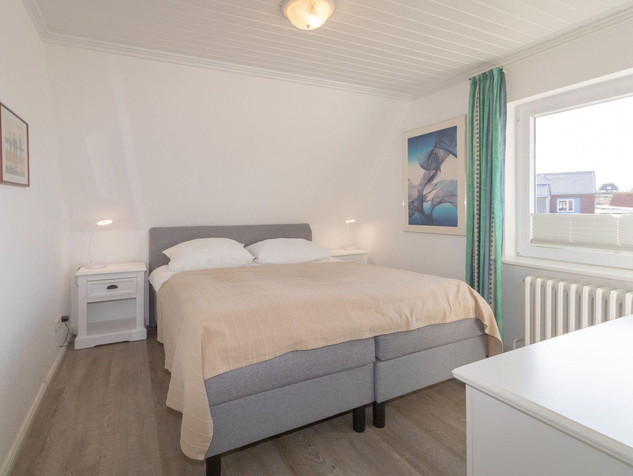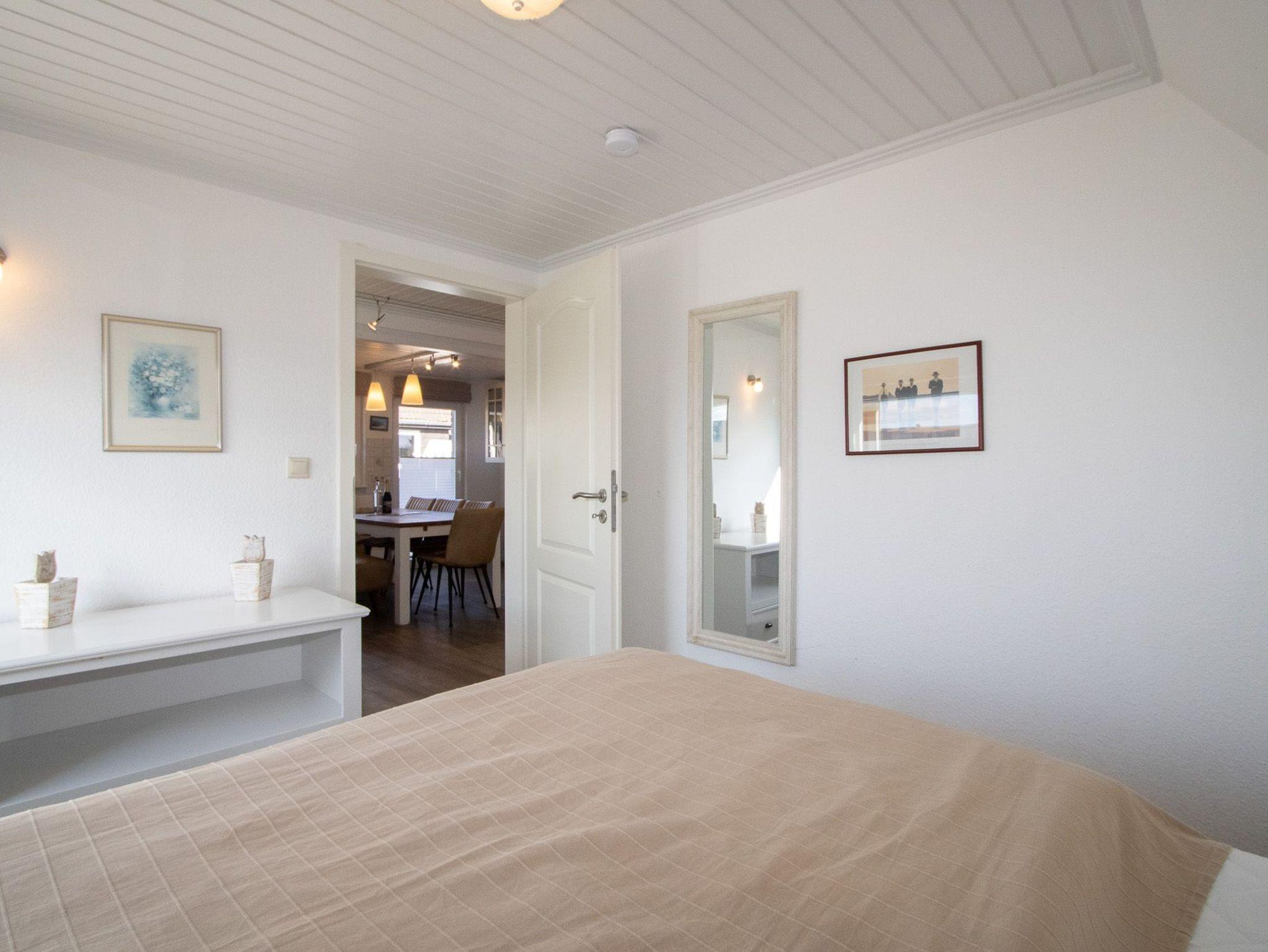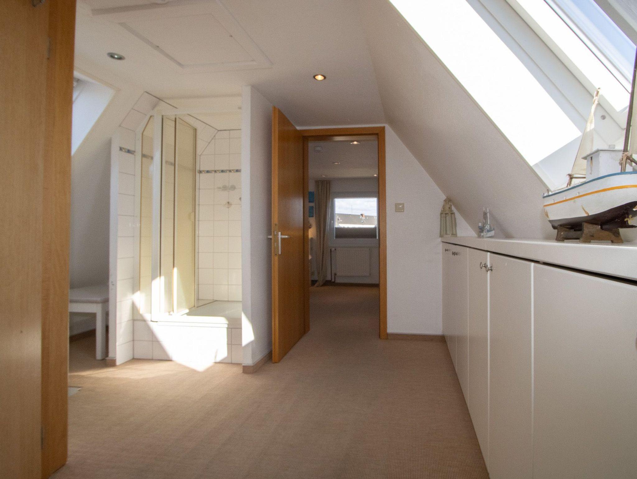 Gepflegtes 5 Zi.-Appartement über OG/DG mit ca. 100 m²; im OG: 1 Wohnzimmer mit Schlafcouch, Tisch, Sidebord und Sat-TV; 1 Schlafzimmer mit Doppelbett und Sat-TV, Ankleidezimmer, Duschbad/WC; 1 Wohnzimmer mit Doppelschlafcouch, Tisch, Couch und Sat-TV; 1 Badezimmer mit Eckbadewanne und WC; Flur mit Gardrobe; separate Einbauküche mit Ceranfeld, Backofen, Mikrowelle, Geschirrspüler, Essplatz für 8 Personen, Radio mit CD-Player, Zugang zur Ost-/Westterrasse mit Bestuhlung; steile Treppe ins DG: 1 Duschbad; 1 separates WC; 1 Schlafzimmer mit Doppelbett und Sat-TV; ein Schlafzimmer mit zwei Einzelbetten.