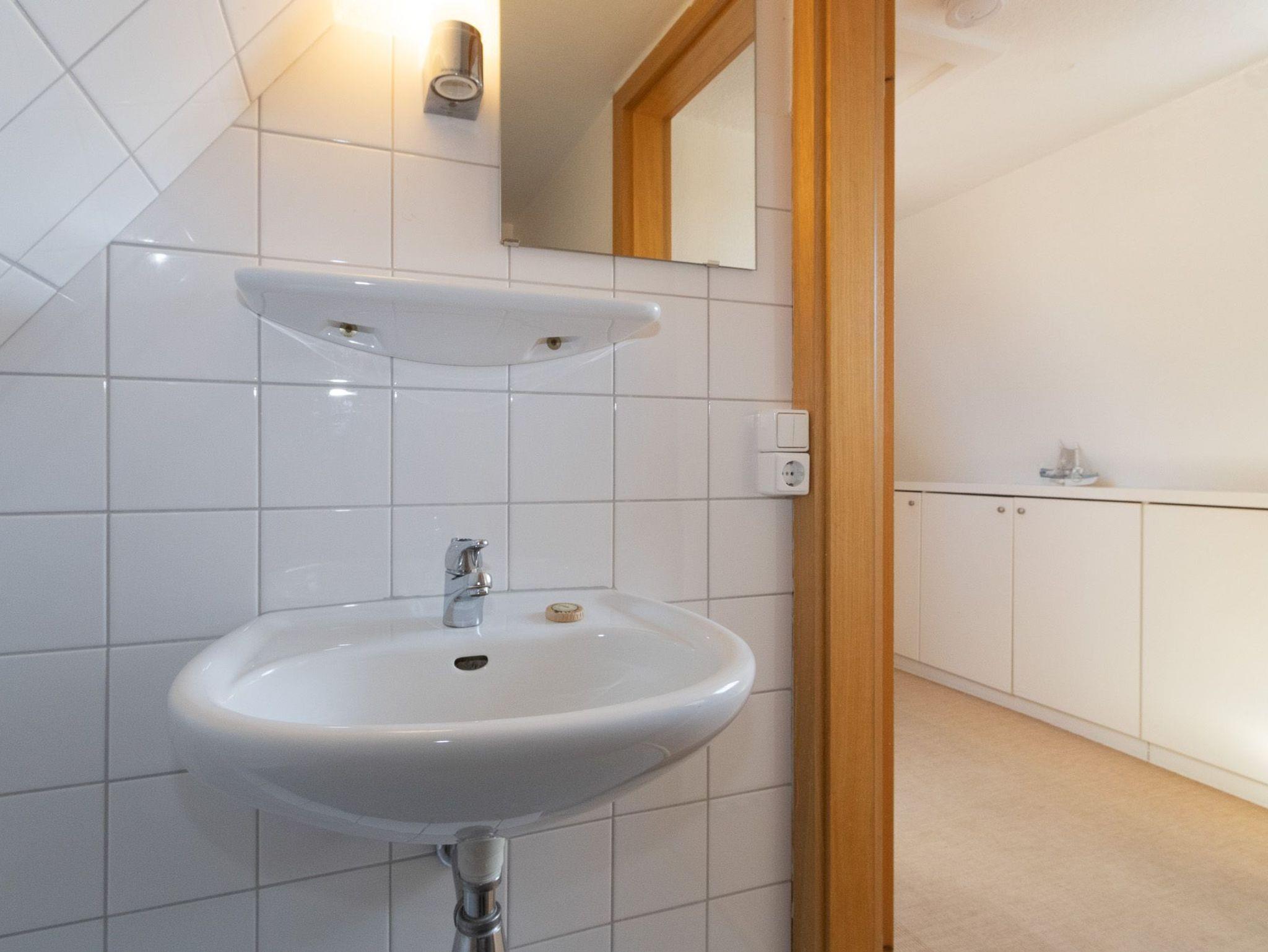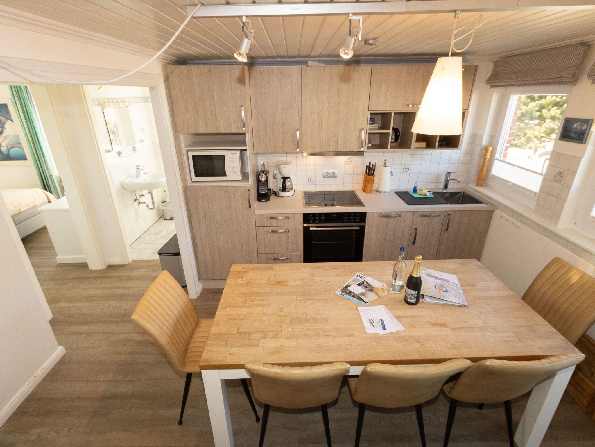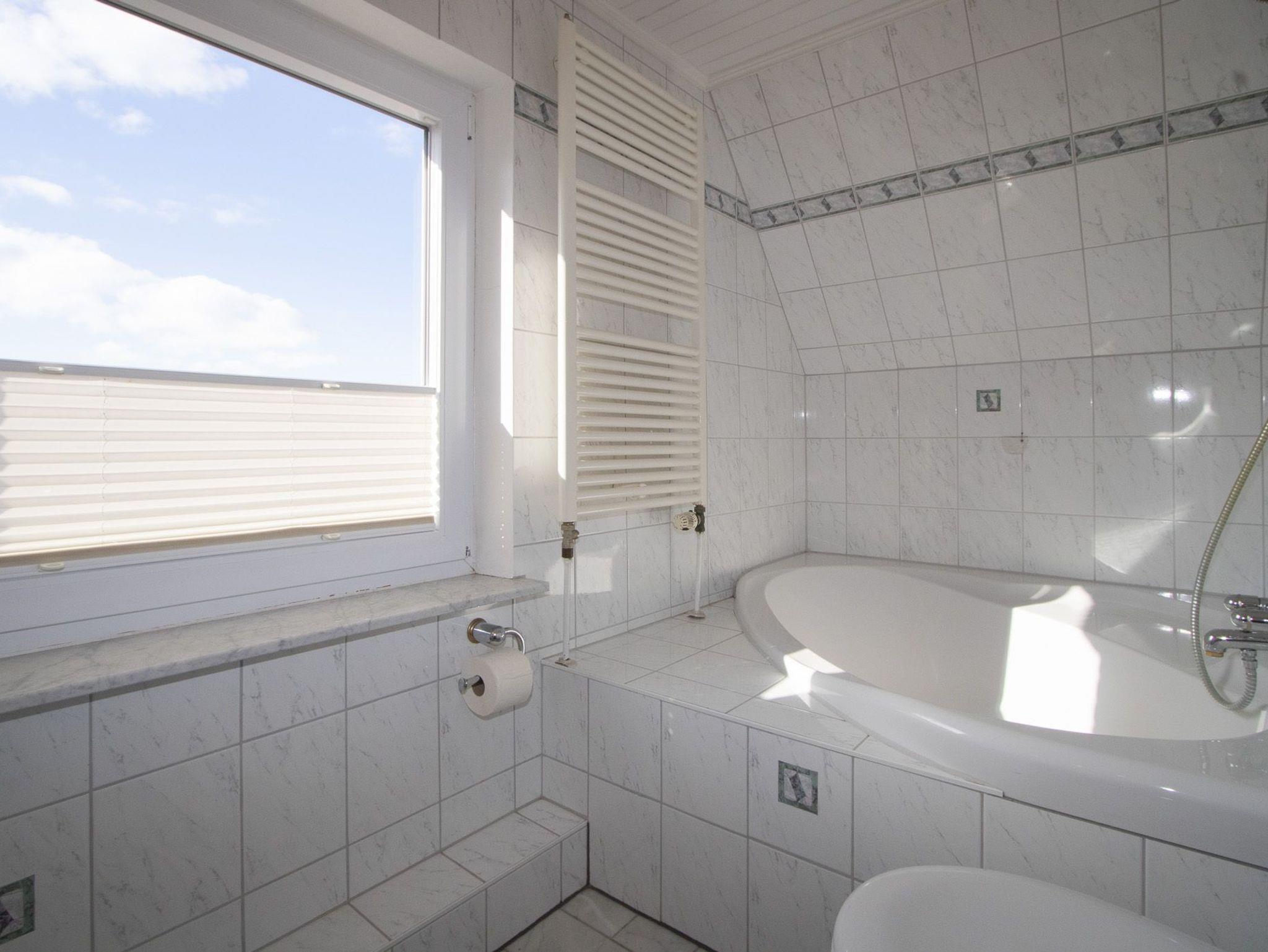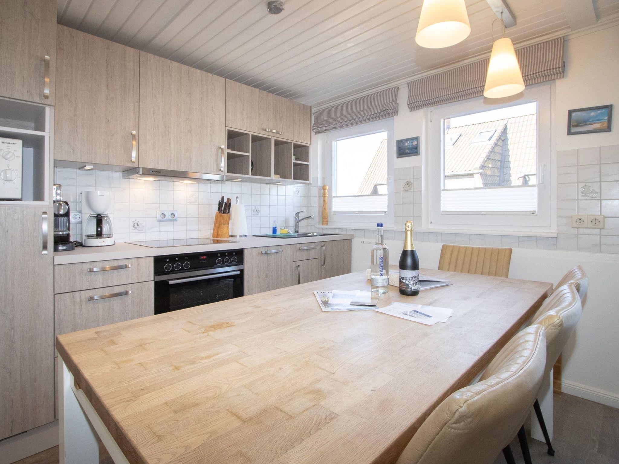 Gepflegtes 5 Zi.-Appartement über OG/DG mit ca. 100 m²; im OG: 1 Wohnzimmer mit Schlafcouch, Tisch, Sidebord und Sat-TV; 1 Schlafzimmer mit Doppelbett und Sat-TV, Ankleidezimmer, Duschbad/WC; 1 Wohnzimmer mit Doppelschlafcouch, Tisch, Couch und Sat-TV; 1 Badezimmer mit Eckbadewanne und WC; Flur mit Gardrobe; separate Einbauküche mit Ceranfeld, Backofen, Mikrowelle, Geschirrspüler, Essplatz für 8 Personen, Radio mit CD-Player, Zugang zur Ost-/Westterrasse mit Bestuhlung; steile Treppe ins DG: 1 Duschbad; 1 separates WC; 1 Schlafzimmer mit Doppelbett und Sat-TV; ein Schlafzimmer mit zwei Einzelbetten.