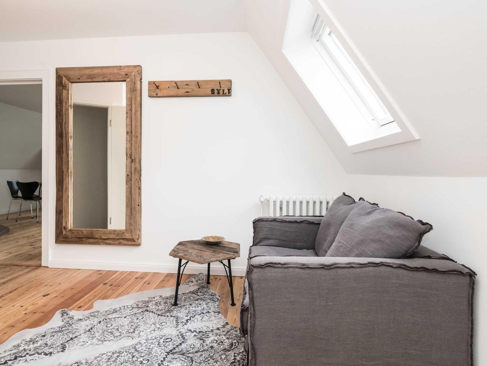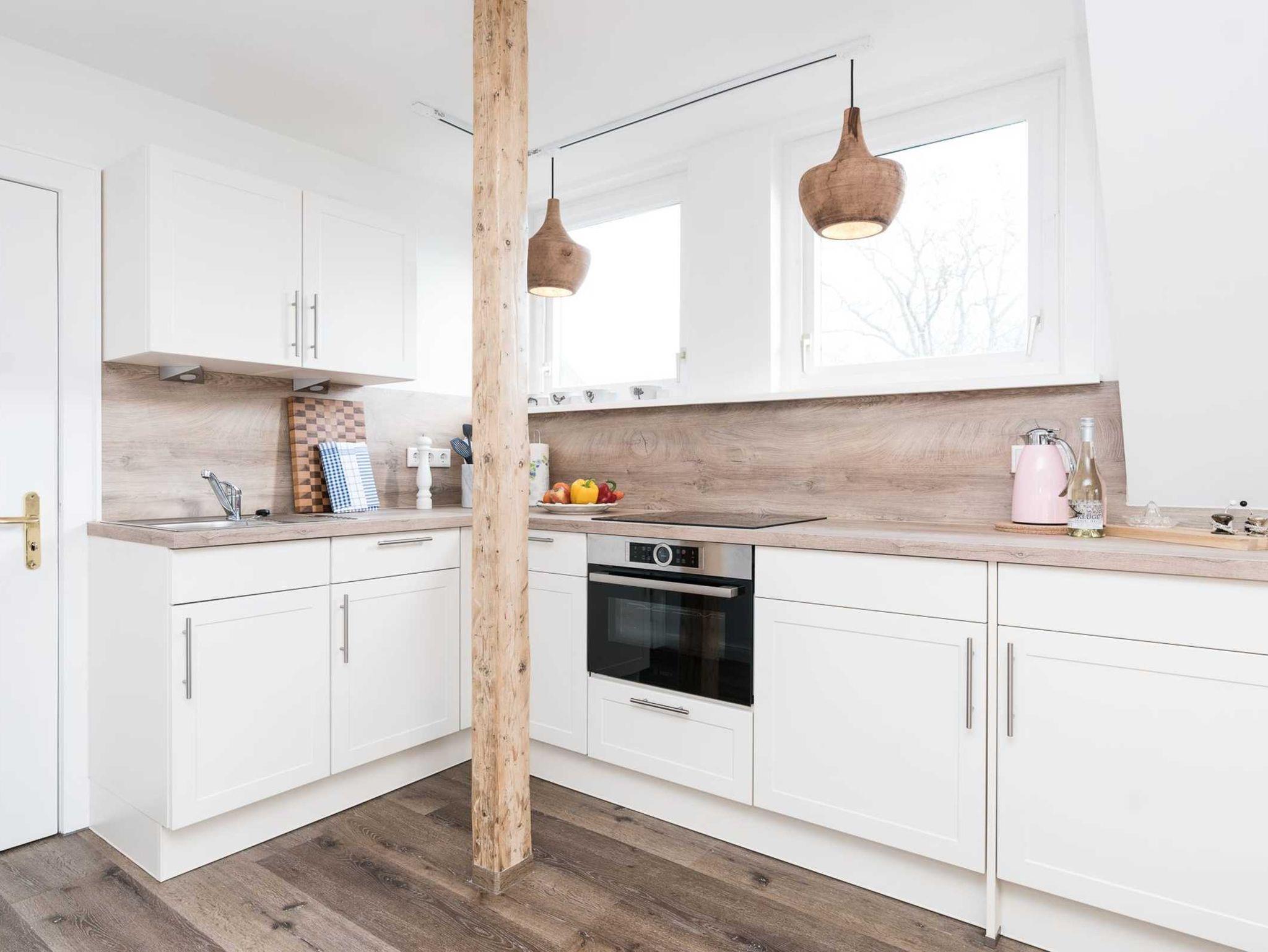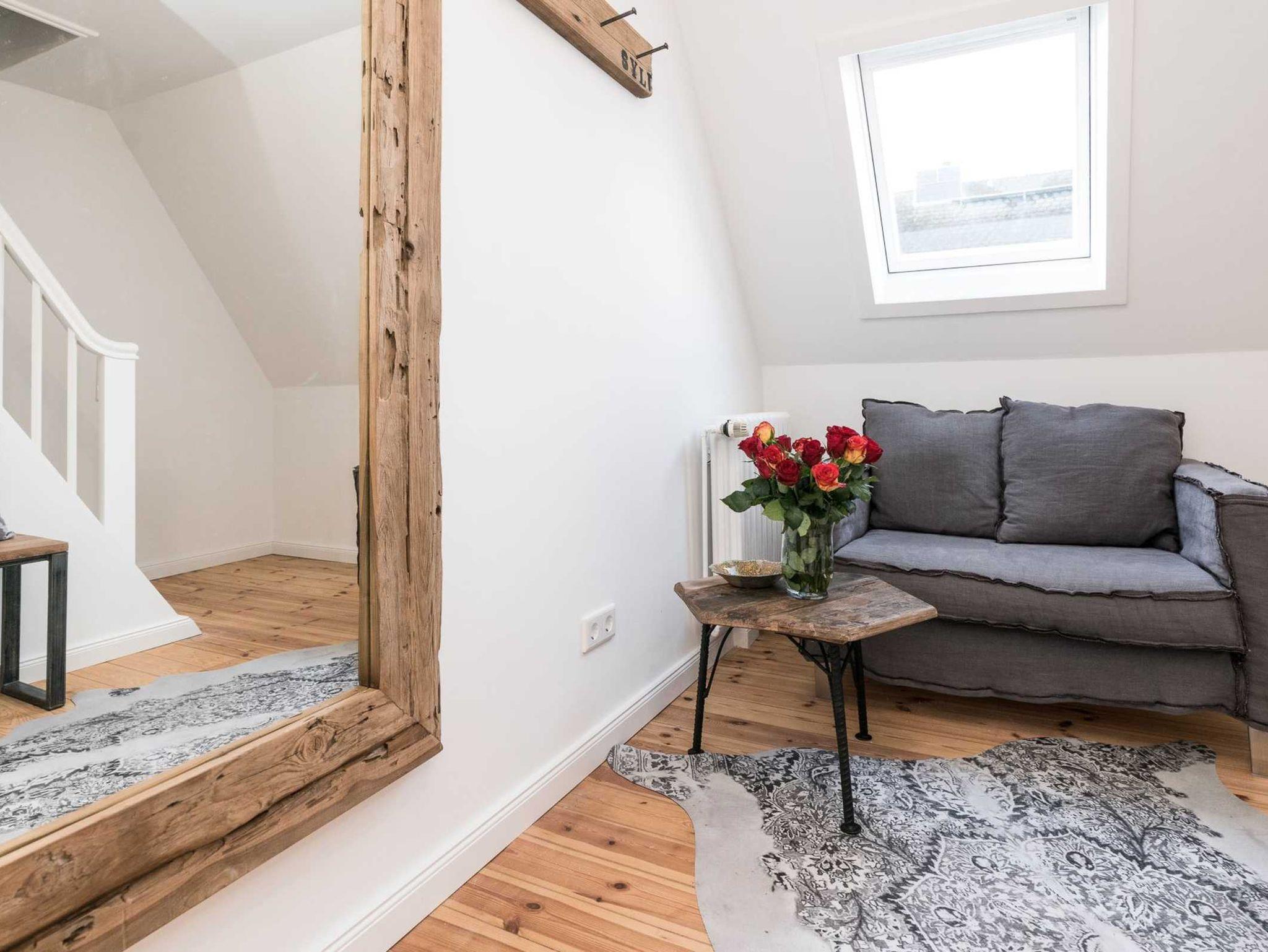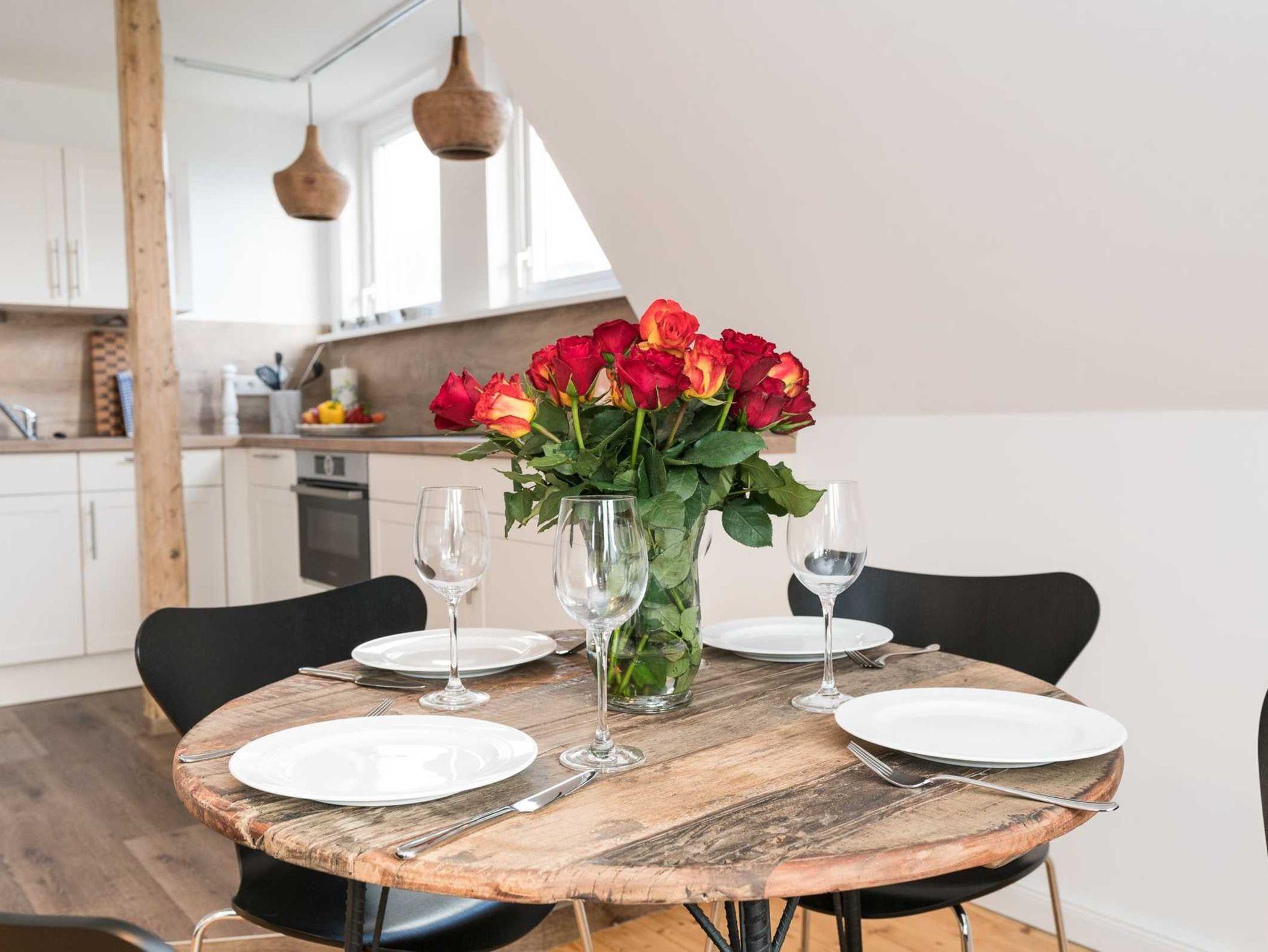 Die Ferienwohnung verteilt sich über das 1. Obergeschoss und Dachgeschoss. Die 3-Zimmer-Wohnung wurde frisch renoviert und sehr hochwertig und modern eingerichtet. Im lichtdurchfluteten Wohnzimmer, mit angrenzender hochwertiger Einbauküche, befindet sich eine bequeme Couch, ein Flachbildfernseher und der Essplatz. Die Küchenzeile ist sehr modern und verfügt über einen Backofen, Geschirrspüler, Ceran-Kochfeld (4-Platten), Kaffeemaschine, Wasserkocher und Toaster.