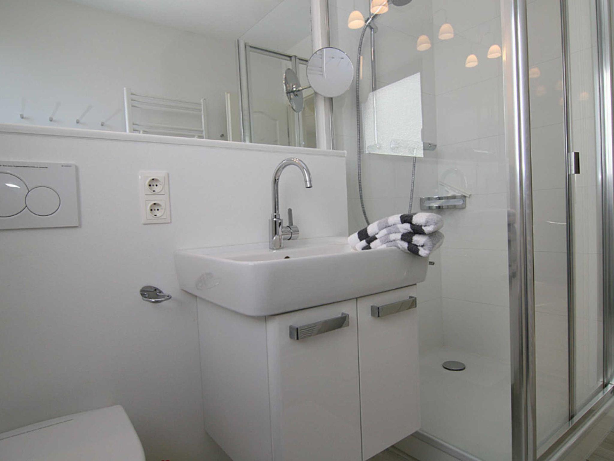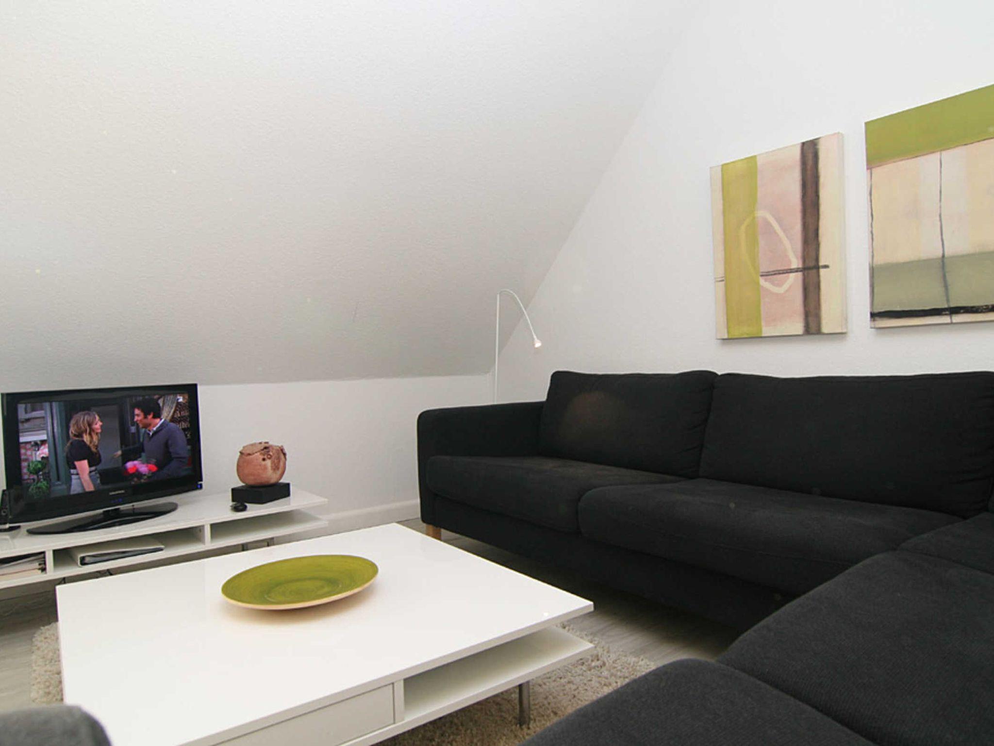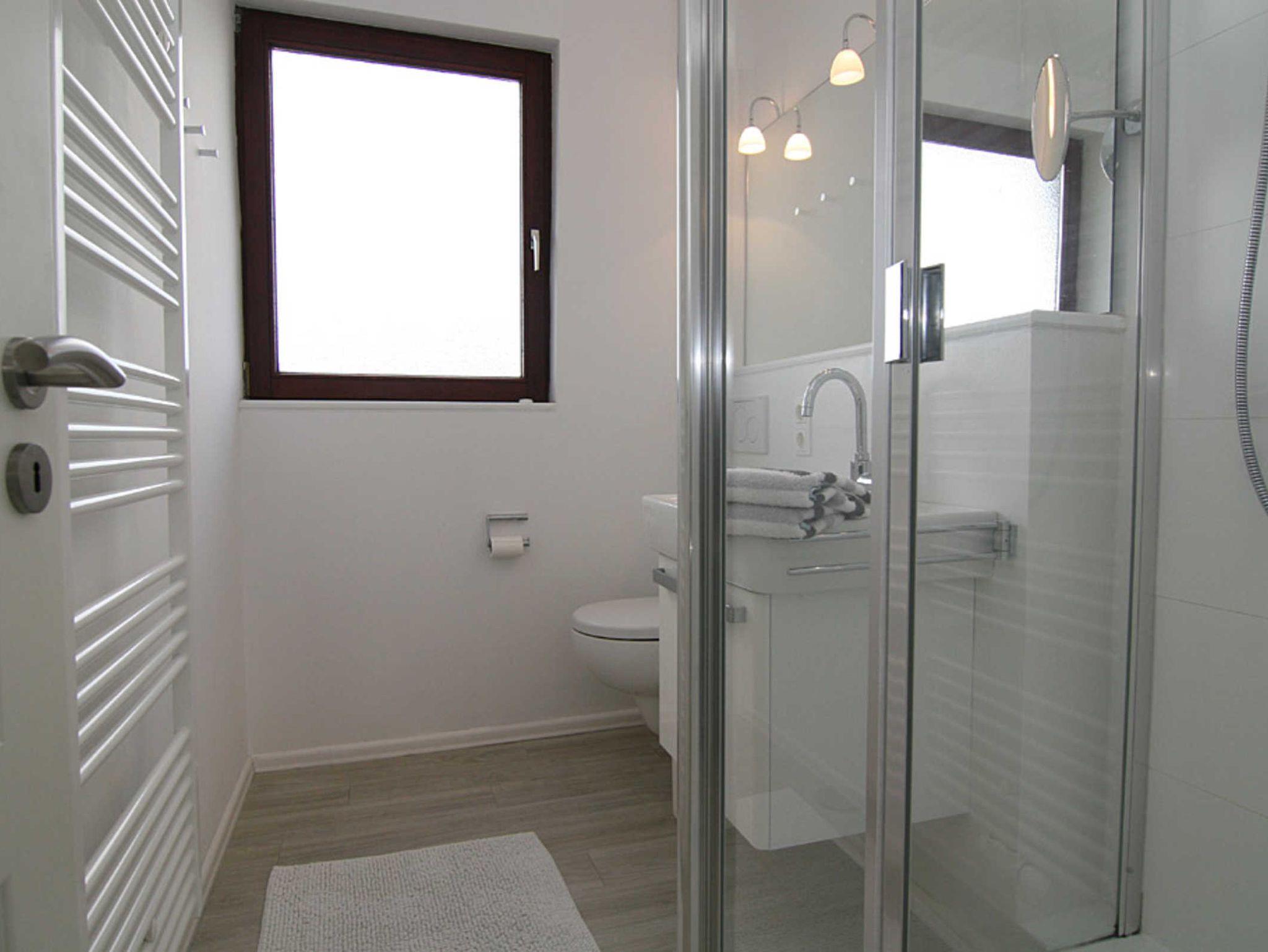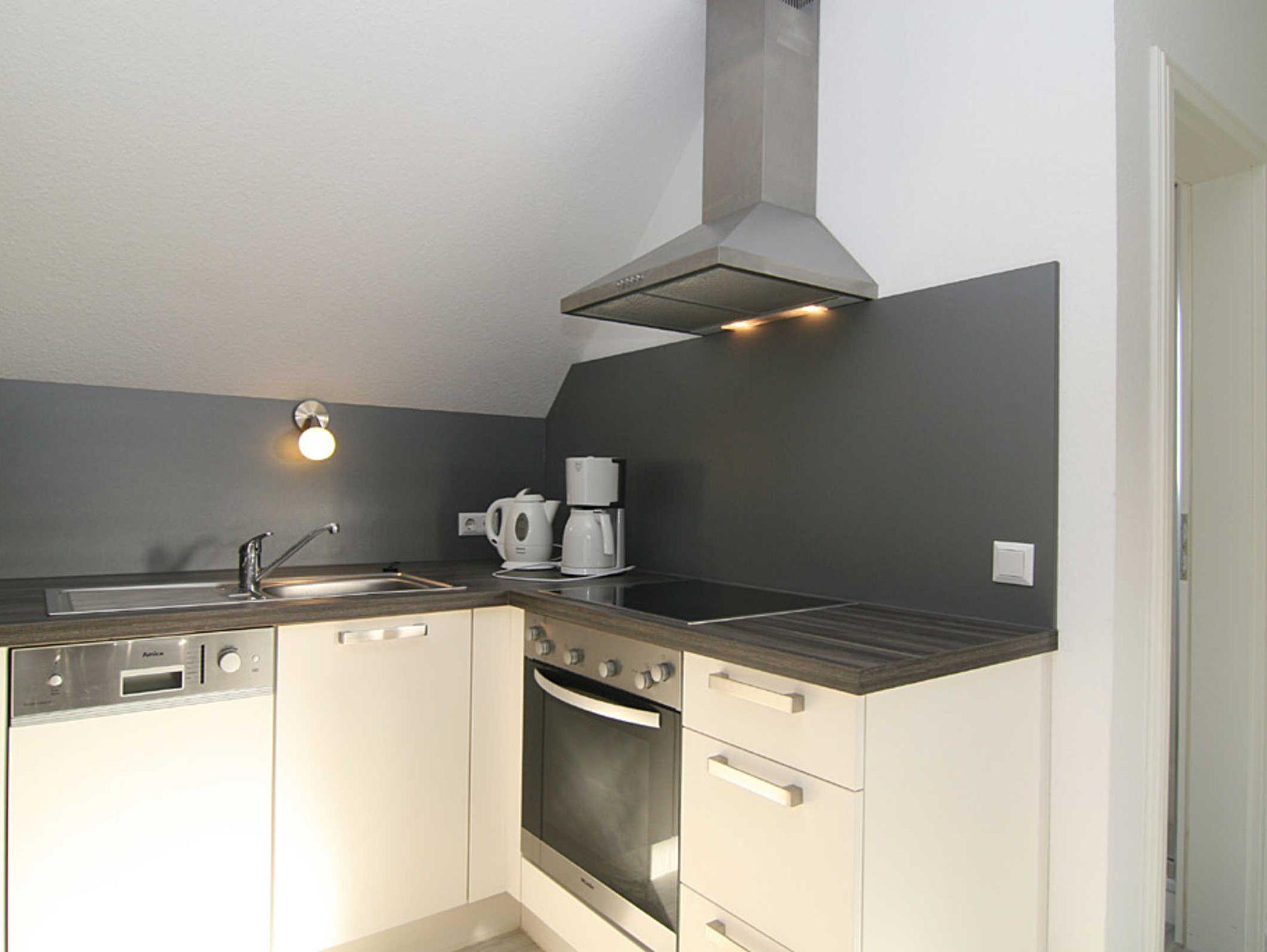 Die Ferienwohnung besteht aus einem großzügigen Wohn- und Essraum mit offener, komplett und hochwertig ausgestatteter Einbauküche, einem Esstisch und einer modernen, komfortablen Polstersitzgruppe. In dieser Etage befindet sich auch das Badezimmer mit Dusche und WC. Über eine schöne Holztreppe gelangt man in das Dachgeschoss mit zwei separaten Schlafzimmern. Ein Schlafzimmer hat ein Doppelbett im zweiten Schlafzimmer stehen zwei Einzelbetten.