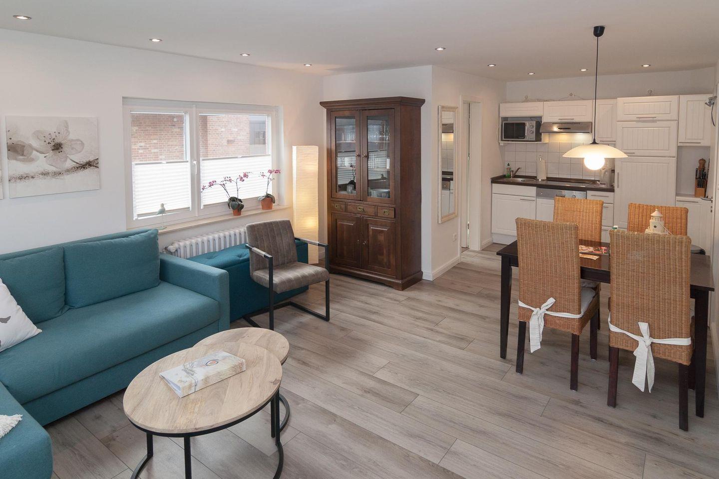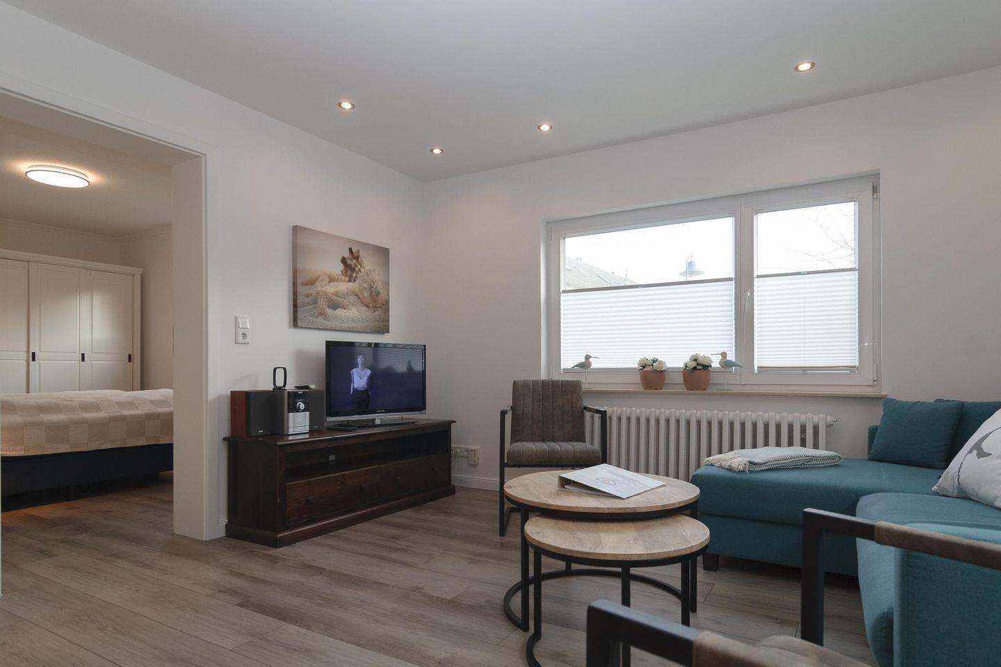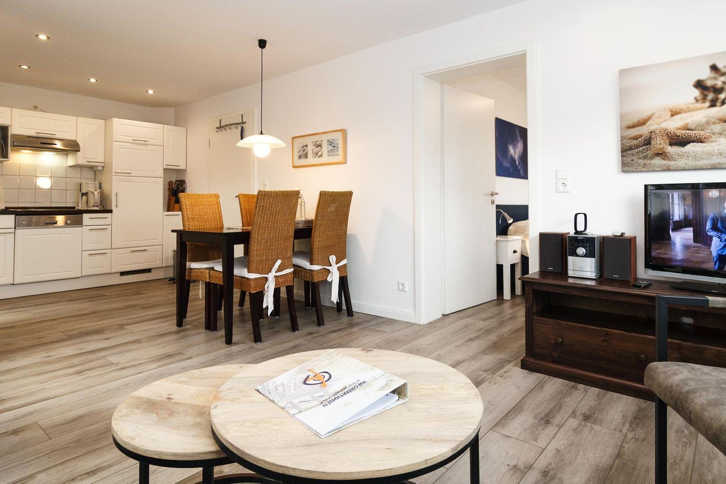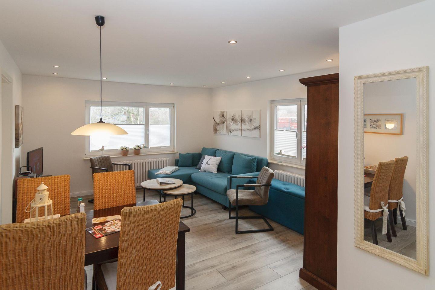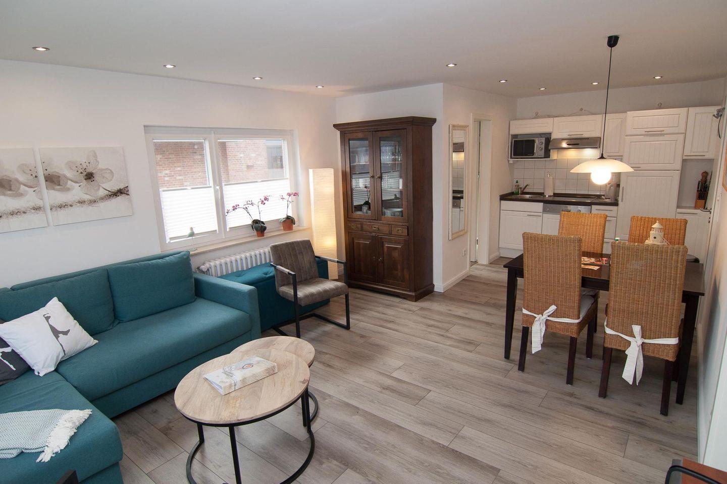Gepflegtes, allergikerfreundliches 2 Zimmer Appartement mit ca. 45 m² im EG; 1 Wohn-/Schlafraum mit Doppelschlafcouch, Tisch, Korbsessel, Sat-TV, kl. Kompaktanlage, Essplatz für 4 Personen, offene Küchenzeile mit 4 Plattenherd, Backofen, kleines Gefrierfach; Schlafraum mit Boxspringbett; Duschbad/WC. Der Wohnraum ist mit neuem Designboden ausgelegt. Die Strände sind zu Fuß in 5 Minuten zu erreichen.