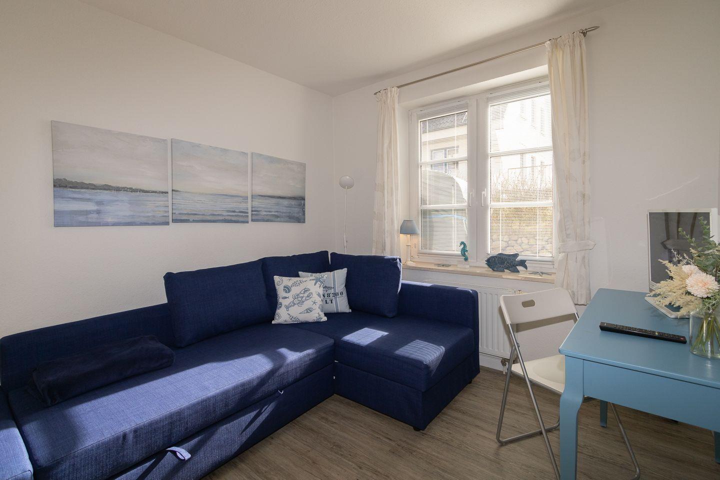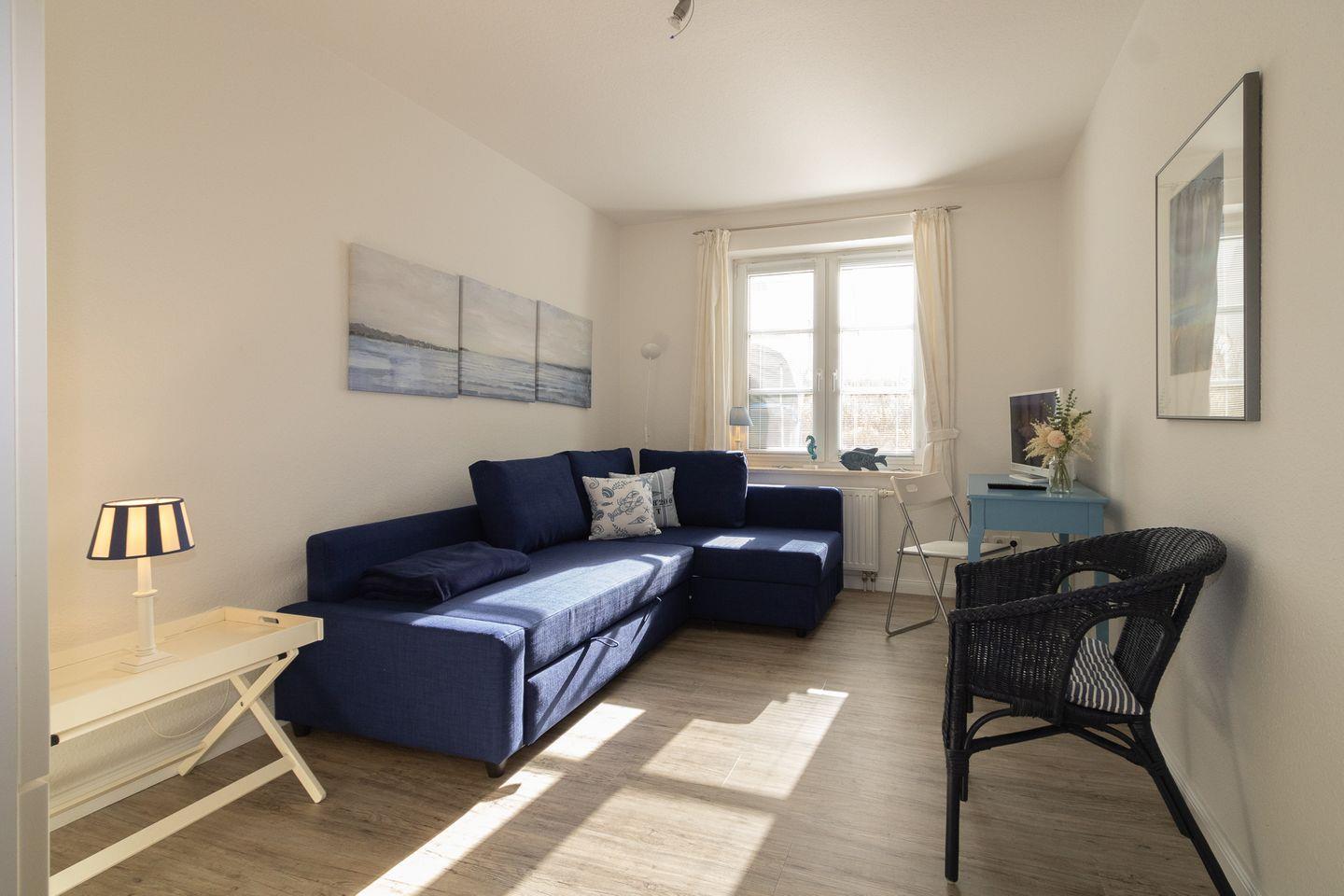 Die Wohnung liegt im Gartengeschoss und ist aufgeteilt in einen gemütlichen Wohn-/Essbereich mit komplett ausgestatteter Küchenzeile, einen Schlafraum mit Doppelbett und ein Duschbad. Im zweiten Schlafraum kann auch eine Schlafcouch für die 3. oder 4. Person ausgezogen werden. Sehr liebevoll und persönlich eingerichtete Ferienwohnung. Die großzügige, gepflegte Terrasse nach Süden ist mit einem Strandkorb und Gartenmöbeln ausgestattet. Umgeben von Dünengras und einem Friesenwall können Sie bei morgendlicher Sonne Ihr Frühstück geniessen. Urlaub, Ruhe und Erholung in absolut strandnaher Umgebung ist hier gegeben.