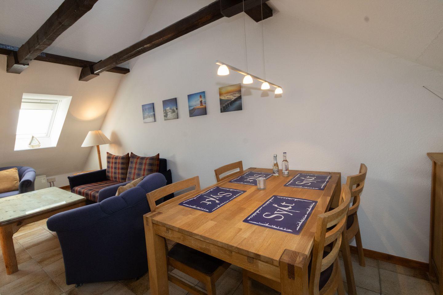 Die Wohnung ist aufgeteilt in ein separates Schlafzimmer, einen Wohnraum mit Schlafsofa sowie angrenzenden Essbereich mit Küchenzeile. Vom kleinen Flur aus, auf dem sich auch die Garderobe befindet, gelangt man in das Duschbad. Der Pkw-Stellplatz liegt direkt vor dem Haus. Hörnum liegt im Süden der Nordseeinsel Sylt und ist von 3 Seiten von Meer umgeben. Inmitten der einzigartigen Dünen - und Heidelandschaft, ist Hörnum für Sylt- Liebhaber und Gäste schon lange kein Geheimtip mehr. Nicht nur für Alleinreisende, sondern auch für Familien mit Kindern ist hier viel Raum für Erholung pur gegeben. Vom Hörnumer Hafen fahren die Schiffe zu den Nachbarinseln (Amrum u. Föhr),Seehundsbänken und zu den Halligen.