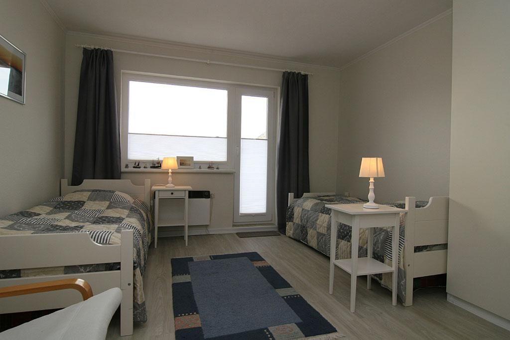 Die Wohnung verfügt über zwei Schlafzimmer, davon ein Schlafzimmer mit Doppelbett und ein Schlafzimmer mit 2 Einzelbetten. Von diesem zweiten Schlafzimmer gibt es einen Zugang zum Balkon Richtung Westen, der mit Balkonmöbeln ausgestattet ist. Das großzügige Wohnzimmer bietet eine gemütliche Sitzecke mit Blick auf dem Flatscreen-Fernseher sowie als zusätzliche Ausstattung einen DVD-Player. Die Küche ist mit einem Essplatz für 4 Personen ausgestattet und verfügt über Mikrowelle, Toaster, Kaffeemaschine, Waschmaschine, Geschirrspüler, 3-Sterne-Gefrierfach im Kühlschrank. Das neu renovierte Bad ist seniorengerecht und verfügt über einen Fön.