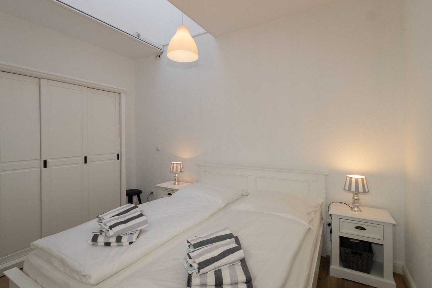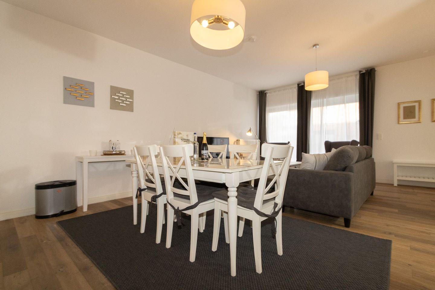 Sehr großzügige Ausstattung mit viel Platz zum Erholen. Die Wohnung ist in einen kombinierten Wohn-Schlafraum mit Küchenzeile und Esstisch, ein sehr großzügiges Schlafzimmer mit angrenzendem Duschbad sowie ein weiteres Schlafzimmer mit einem weiteren Duschbad ausgestattet. Der Esstisch, der sich auch im Wohnbereich befindet, bietet Platz für 6 Personen. Hier können Sie Freunde bewirten und verwöhnen. Neben dem zweiten Schlafzimmer liegt noch ein kleines Lesezimmer, das für die richtige Entspannung sorgen kann. Die Terrassenbestuhlung steht schon für die Sonnenstunden des Urlaubs bereit.