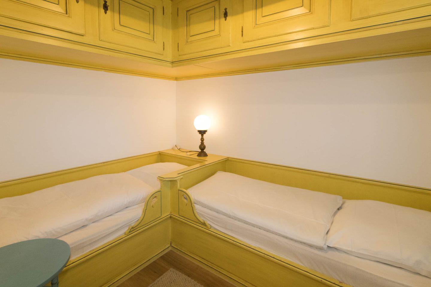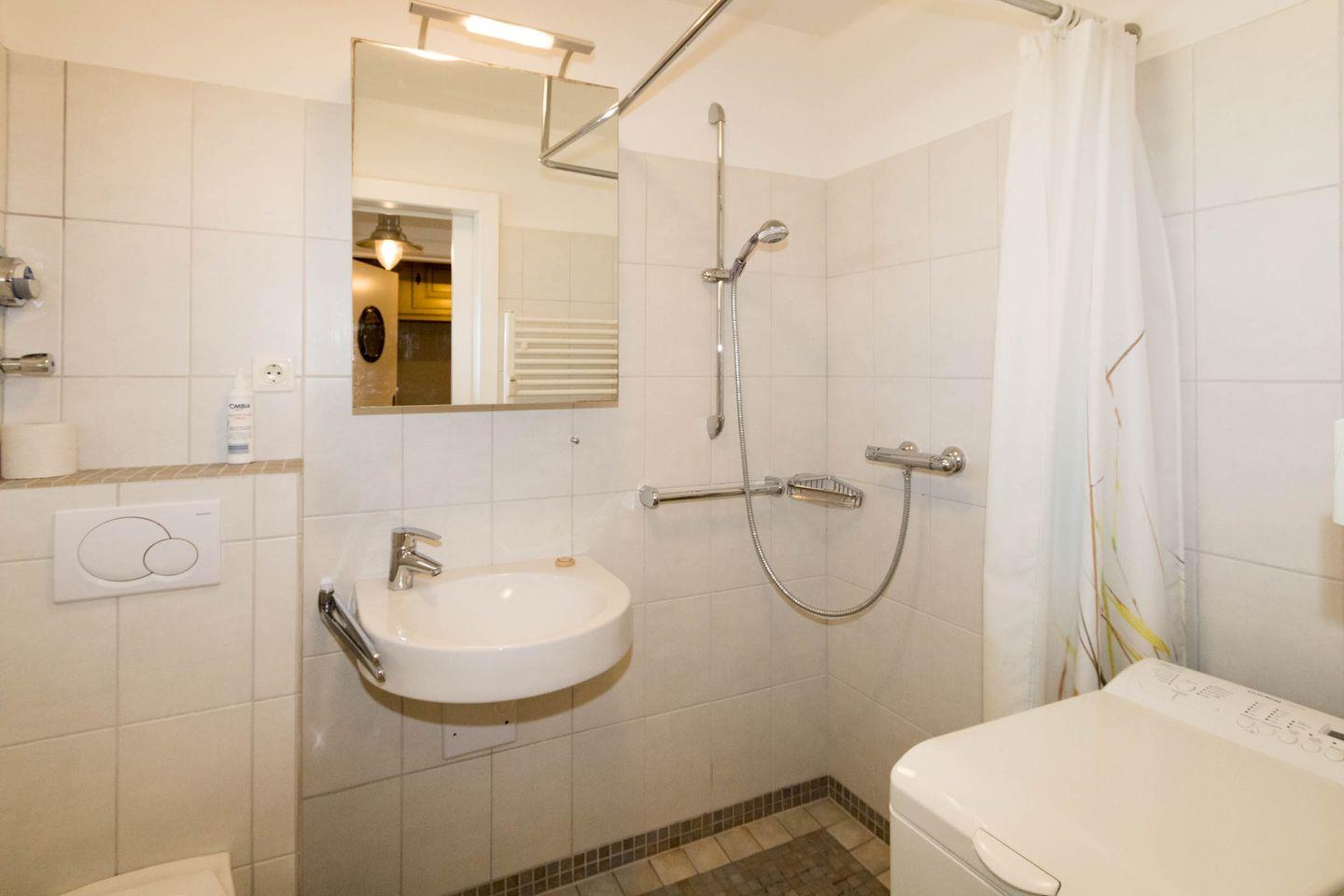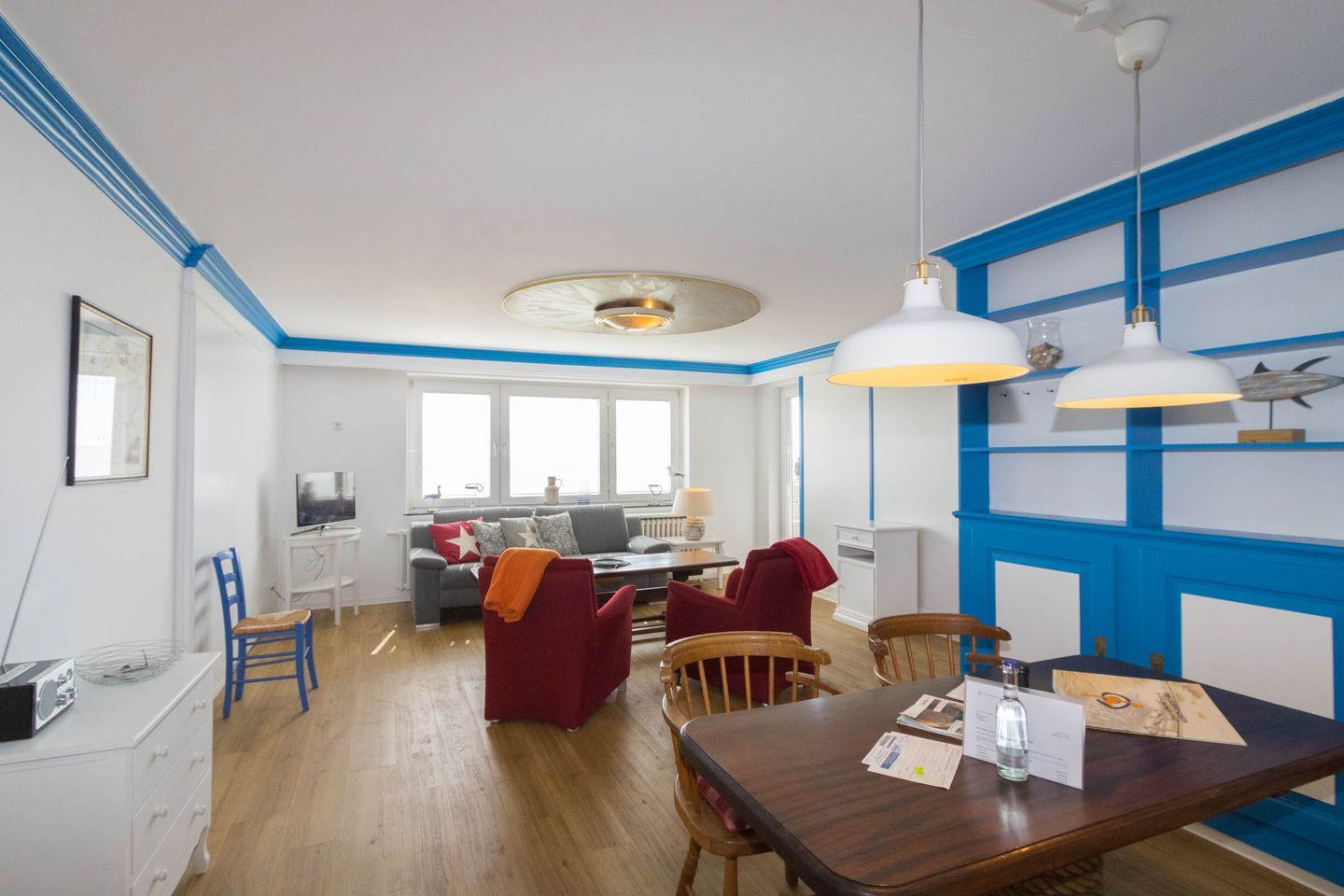 Zur Wohnung gehören zwei Schlafzimmer, eines ist mit Doppelbett und eines mit zwei einzelnen, eingebauten Kojenbetten eingerichtet. Das Duschbad verfügt über eine eigene Waschmaschine. Der Wohnraum bietet einen fantastischen Blick und hat eine Sitzecke direkt am Panoramafenster. Der Essplatz im Wohnbereich hat Platz für 6 Personen. Neben dem Flatscreen-Fernseher ist auch WLAN vorhanden. Vom Wohnbereich aus gelangen Sie auf den Ostbalkon, der mit Balkonmöbeln ausgestattet ist. Die Küche bietet alles, was man braucht, um gemütlich in der Ferienwohnung zu kochen