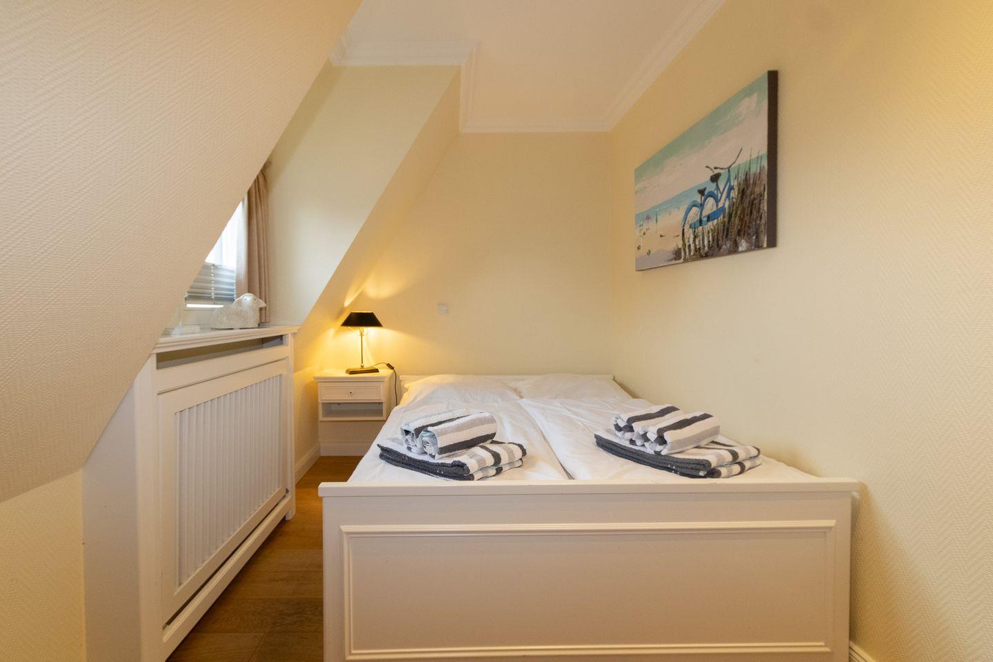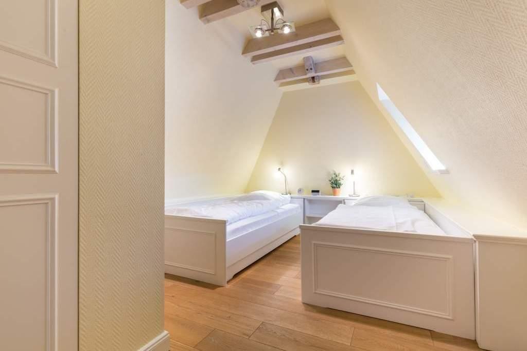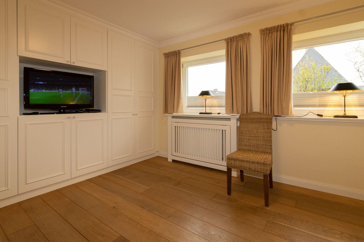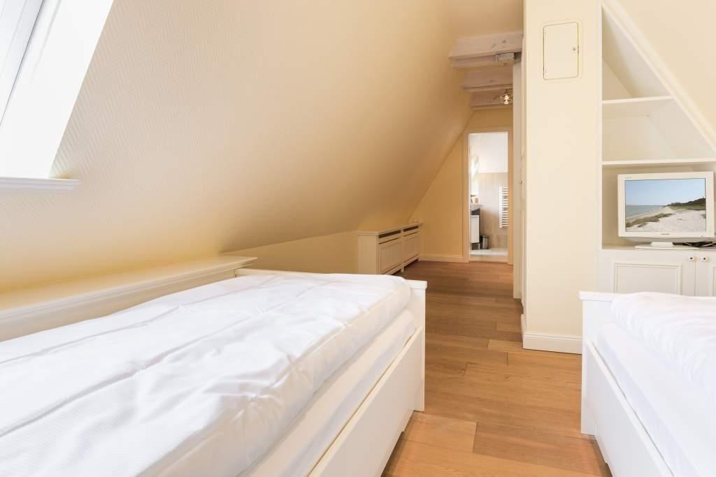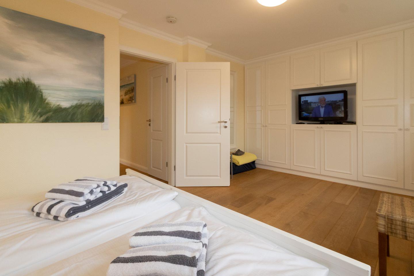 In den drei Schlafzimmern haben Sie Platz zum Schlafen für 6 Personen. Ein Schlafzimmer mit einem großen Doppelbett und ein Schlafzimmer mit einem franz.Bett befinden sich im OG. Ein weiteres Schlafzimmer mit zwei Einzelbetten liegt im DG. Alle Schlafzimmer sind mit weißen Maßeinbauten und jeweils einem eigenen Flachbildschirm ausgestattet.