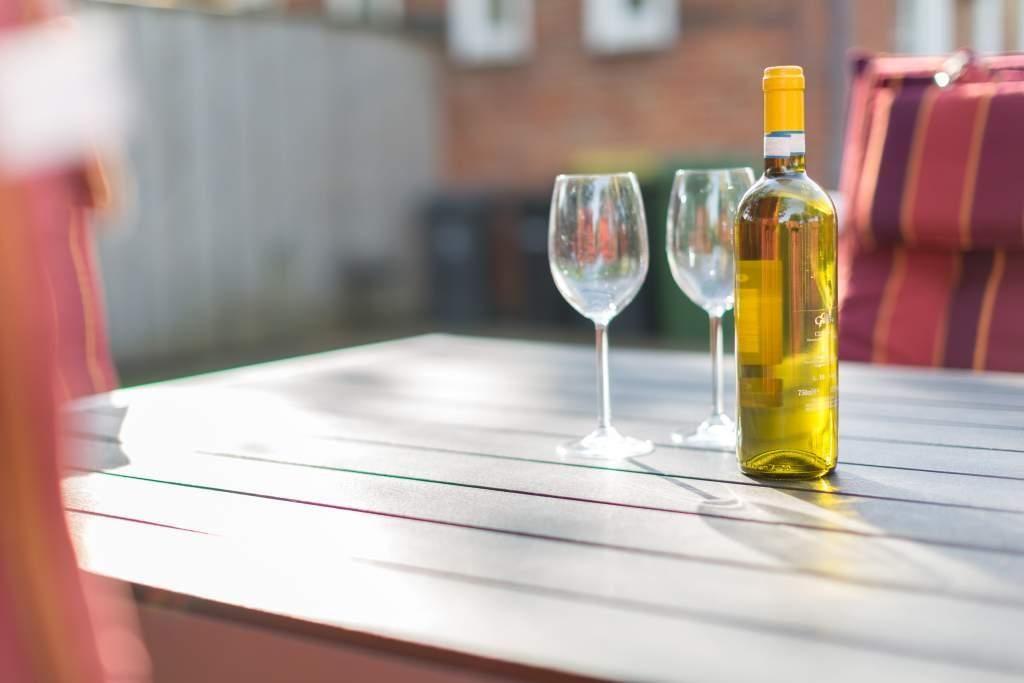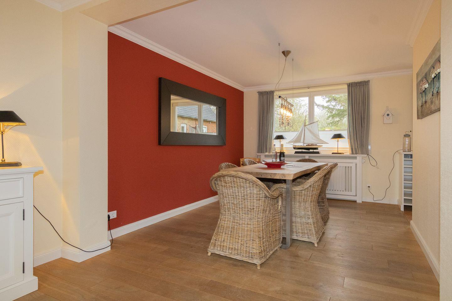 Der von einem Friesenwall umgebene Garten, in Richtung Osten gelegen, bietet eine eigene Terrasse mit Gartenmöbeln (Apr.-Okt.).