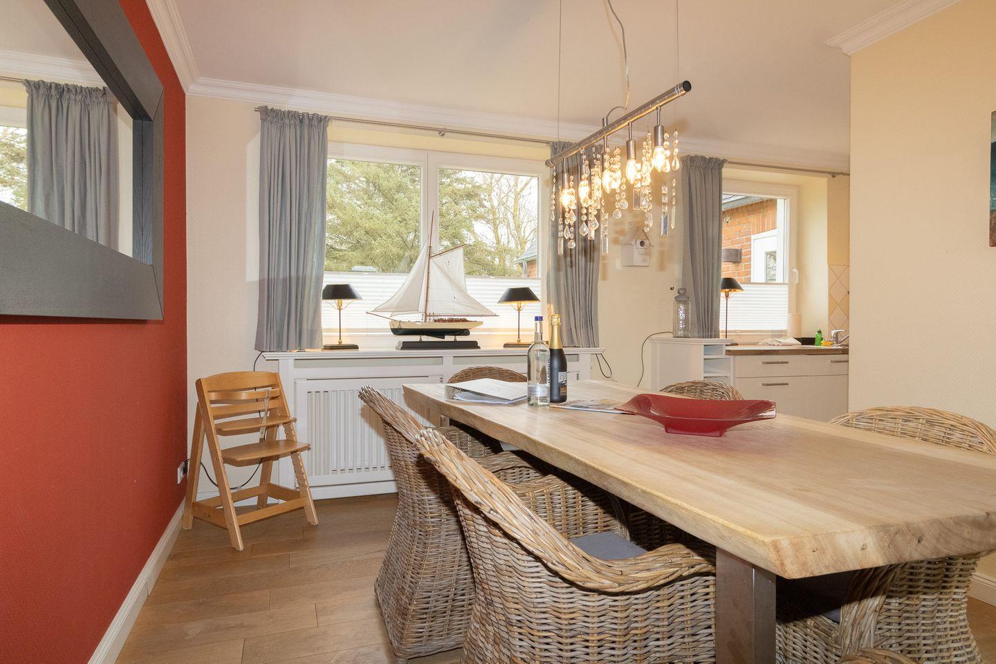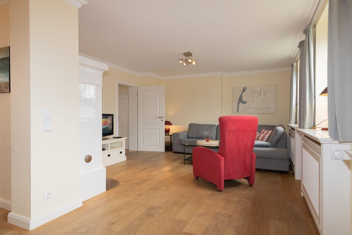Sie können nach einem umfangreichen Strandtag auf den gemütlichen Polstermöbeln im Wohnbereich traumhaft entspannen und im Winter den weißen Mylin-Kaminofen mit seiner wohligen Temperatur geniessen. Ein großer Flatscreen mit Satellitenempfang, der DVD Player und die I-Pod-Docking-Station sorgen für reichlich Unterhaltung.