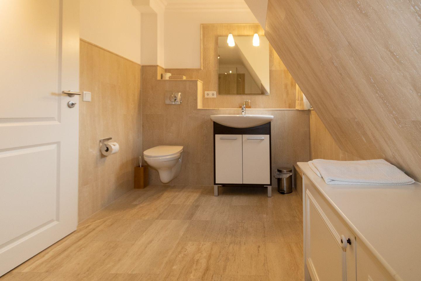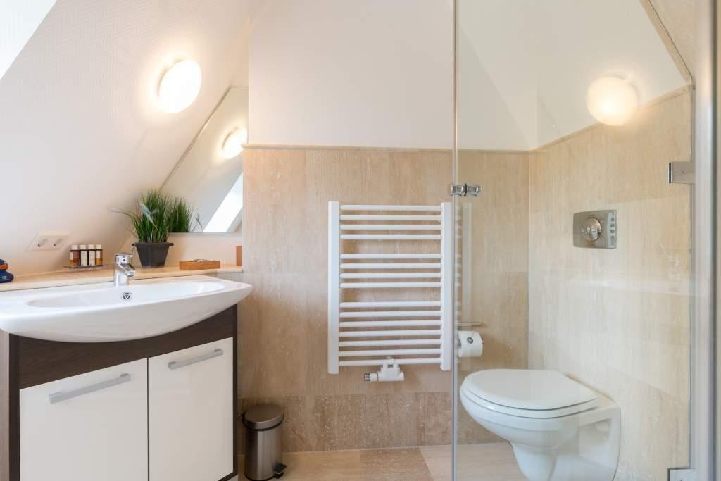 Duschkomfort bieten die beiden mit Travertin gefliesten Duschbäder, die neben einem Handtuchheizkörper auch mit modernen Armaturen ausgestattet sind.