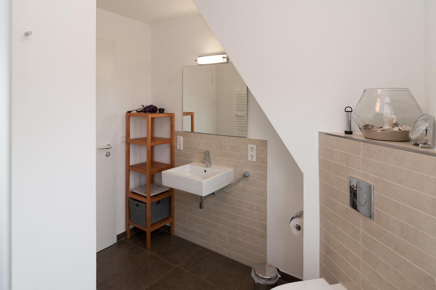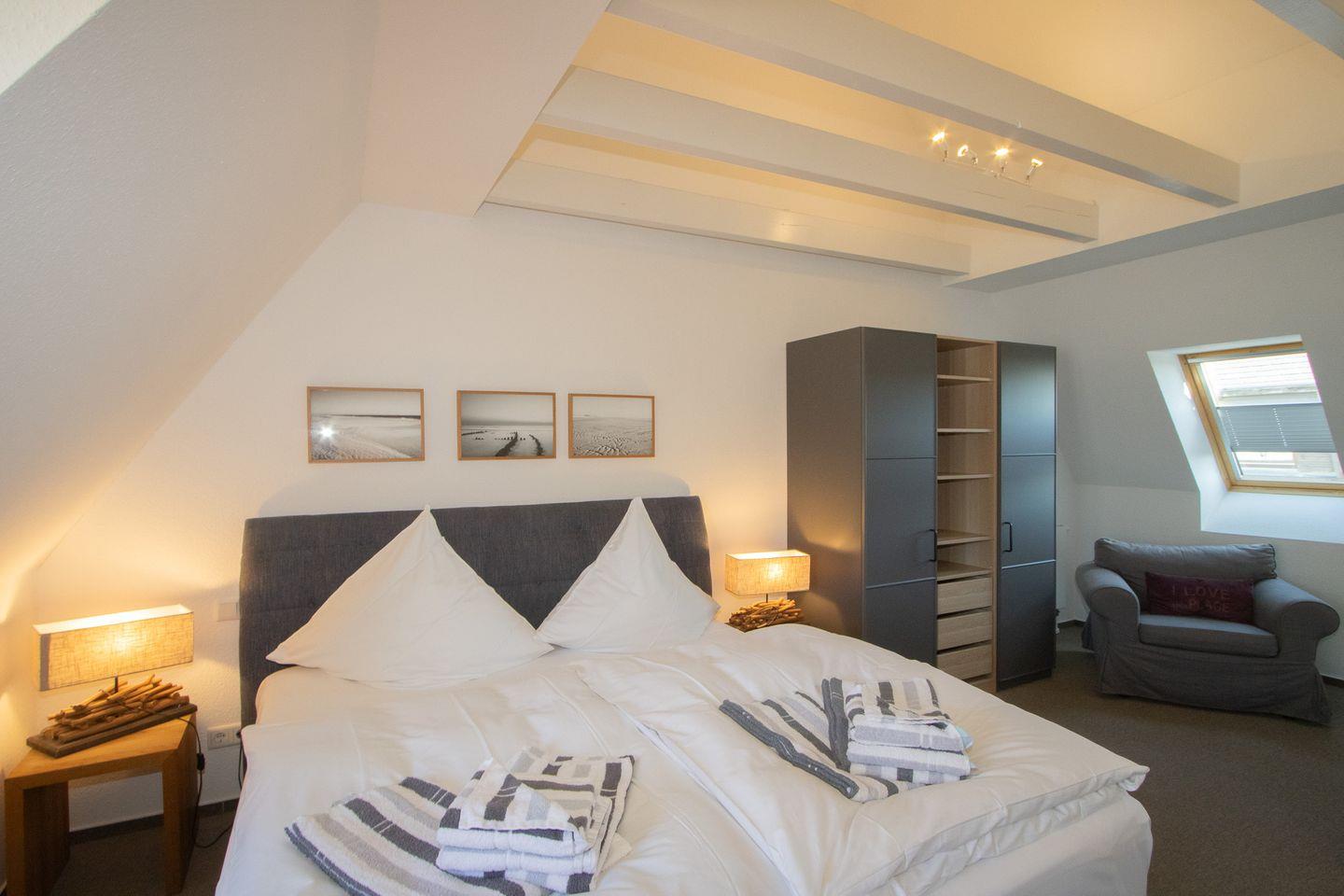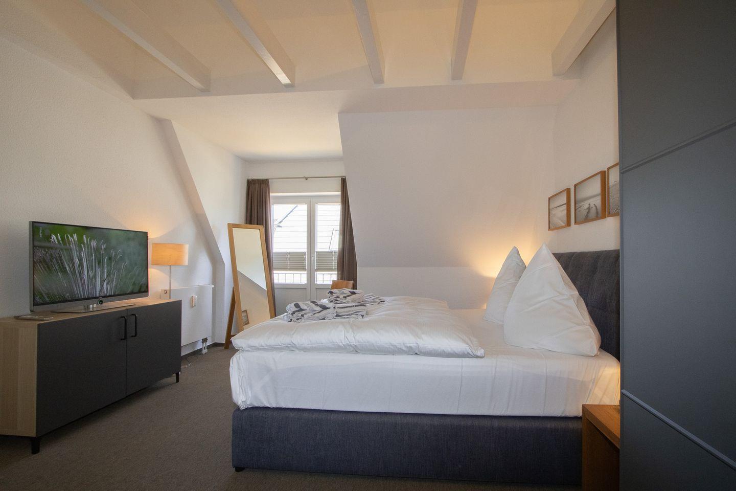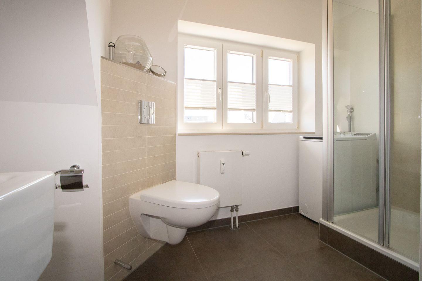 Auf dieser Ebene befindet sich auch das geräumige Schlafzimmer mit neuem Boxspringbett und angrenzendem, hochwertigem Duschbad sowie eine sep. Gäste-WC. Vom Flur der Wohnung erreichen Sie über eine Treppe ein weiteres Schlafzimmer mit Doppelbett.