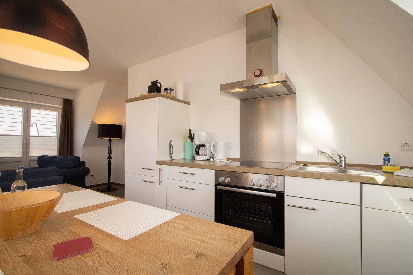 Die Wohnung verfügt über einen offenen Wohn-/Essbereich mit angrenzender Küchenzeile. Vom Küchenfenster aus erhaschen Sie noch einen kleinen Blick zur Ostseite mit dem Wattenmeer und der Promenade. Auch den Leuchtturm können Sie von der Küche und von der Wohnzimmer Couch erblicken.
