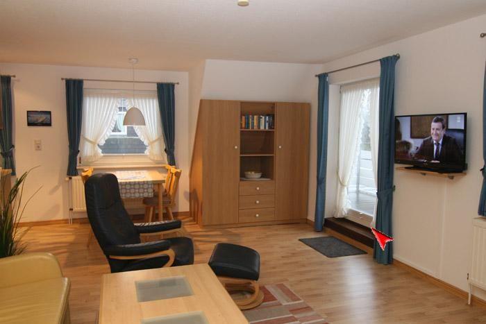 Sie verfügt über einen Wohn- u. Schlafraum mit Balkon nach Westen, sowie eine Küchennische, Fernseher, Radio und Telefon. In diesem Raum steht auch das Schrankbett für die dritte Person mit einer Liegefläche von 90 x 200 cm. Der Schlafraum befindet sich im Dachgeschoss und ist durch eine Treppe vom Flur aus erreichbar. Dort ist ein Doppelbett mit getrennten Matratzen von 90 x 200 cm vorhanden. Im Bad gibt es eine Dusche, WC und Handwaschbecken.