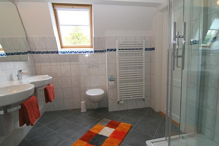 Im 1. OG befinden sich ein Doppelschlafzimmer, ein Einzelschlafzimmer und das geräumige Duschbad mit Doppelwaschbecken.