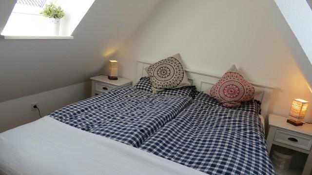 Für eine Familie mit 4 Personen oder auch für zwei Paare werden sich hier im Urlaub rundum erholen. Vom Flurbereich gelangen Sie in ein Schlafzimmer mit Doppelbett, ein Duschbad und in den komfortablen Wohnraum mit Esstisch und eine komplett eingerichtete Küchenzeile. Der elektrische Kamin vermittelt auch in den Wintermonaten eine wohlige Wärme. Vom Wohnraum aus gelangen Sie über eine Treppe in den oberen Schlafbereich. Eine kleine gemütliche Dachterrasse mit Möblierung, die vom Nachbarn durch Pflanzen abgetrennt ist, gehört zur Ausstattung dazu.