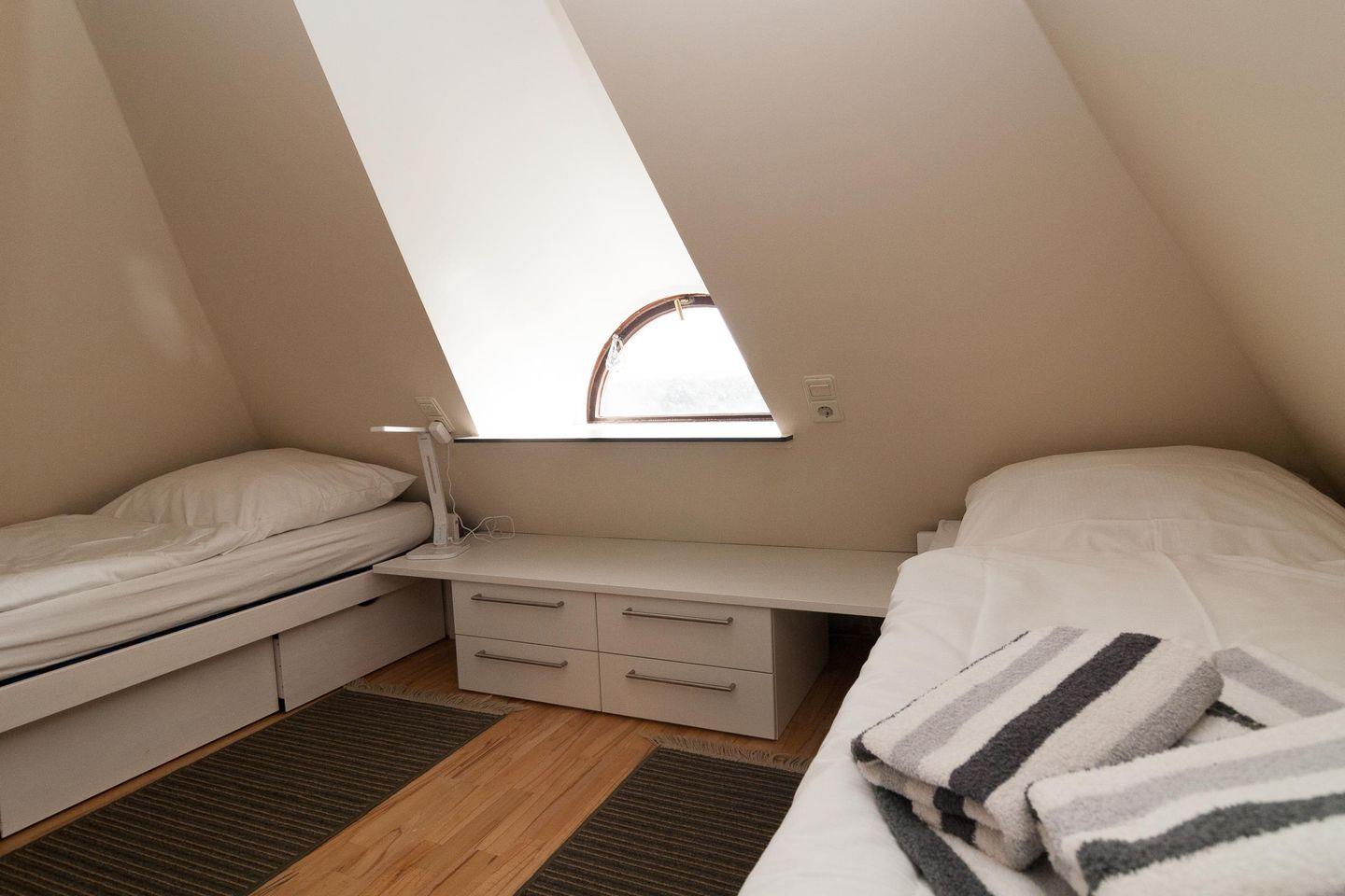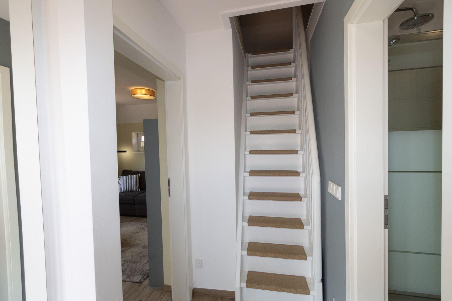 Das Schlafzimmer erreichen Sie über eine Treppe. Es ist mit zwei Einzelbetten ausgestattet.