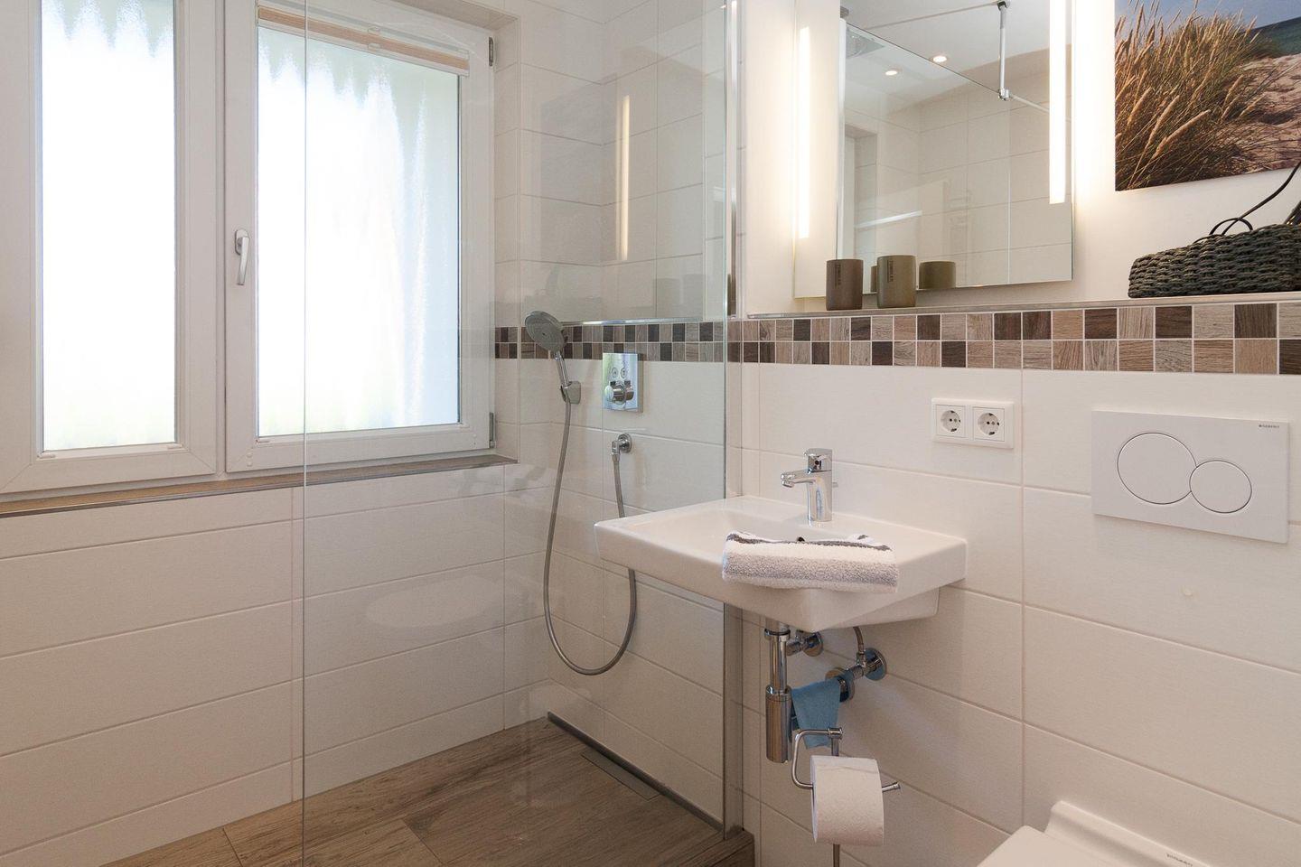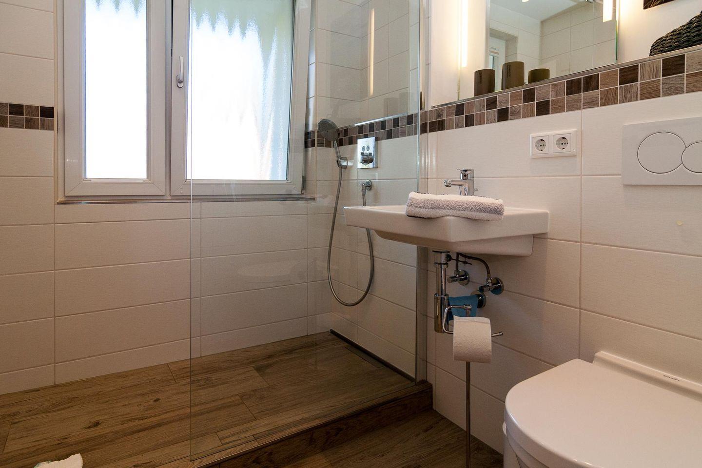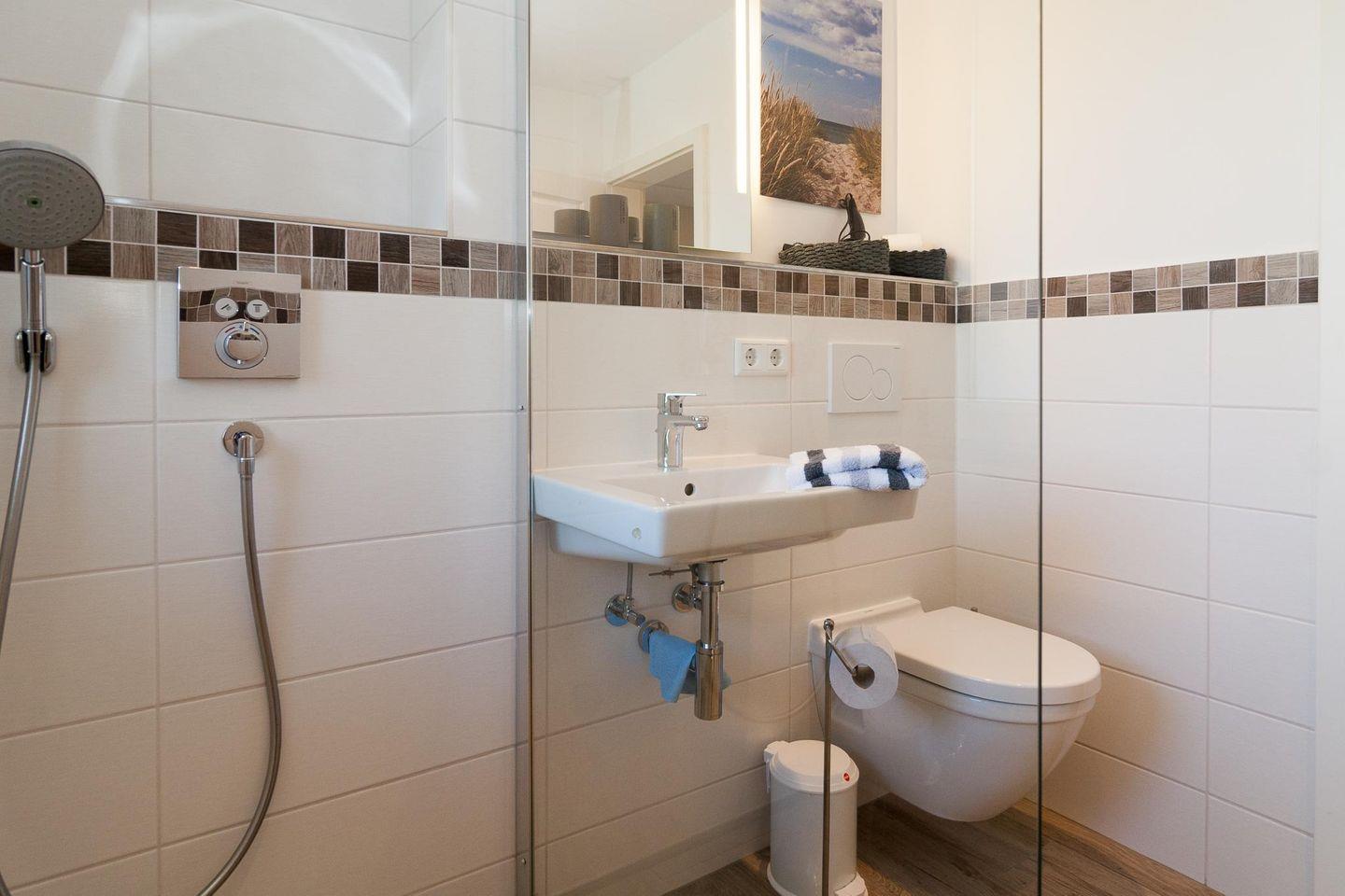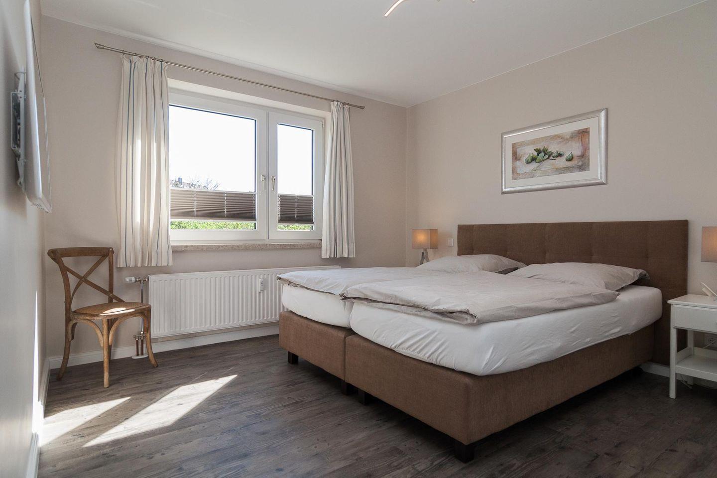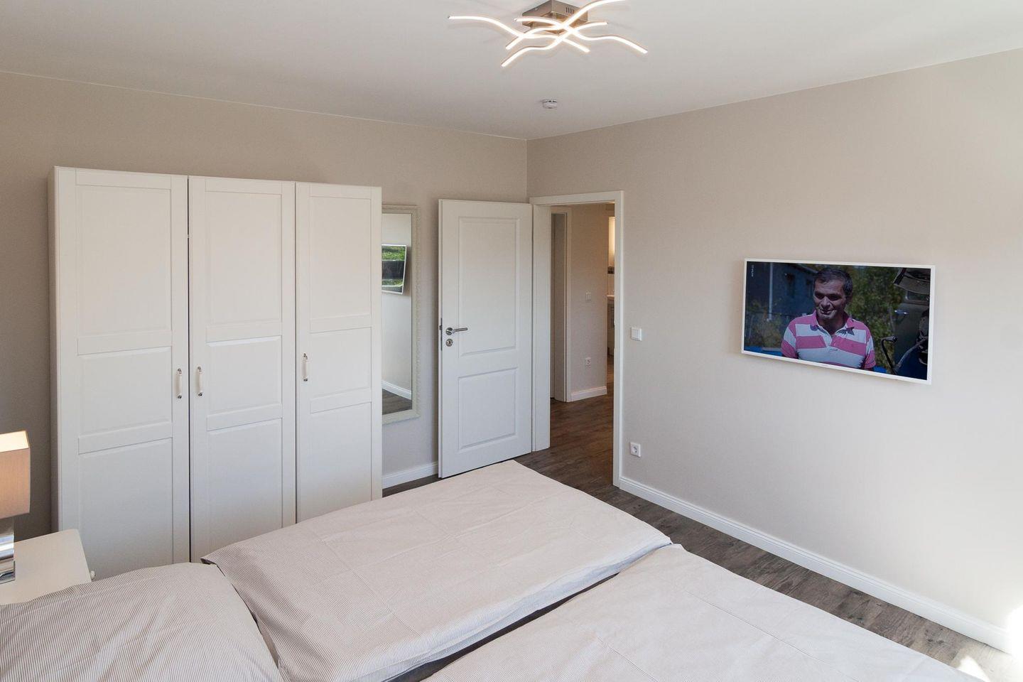Die Ferienwohnung verfügt über ein komfortables Schlafzimmer mit einem Boxspringbett sowie einem Fernseher. Ein modernes Badezimmer mit bodengleicher Dusche, WC und Waschbecken sorgt zudem für zusätzlichen Komfort. Selbstverständlich sind auch praktische Dinge wie eine Waschmaschine, Trockner (im seitlichen Eingang) und Wäscheständer vorhanden, die für einen sorgenfreien Aufenthalt sorgen. Die 3.Person wird im Wohnzimmer auf einem Schlafsofa / Rollbett untergebracht.