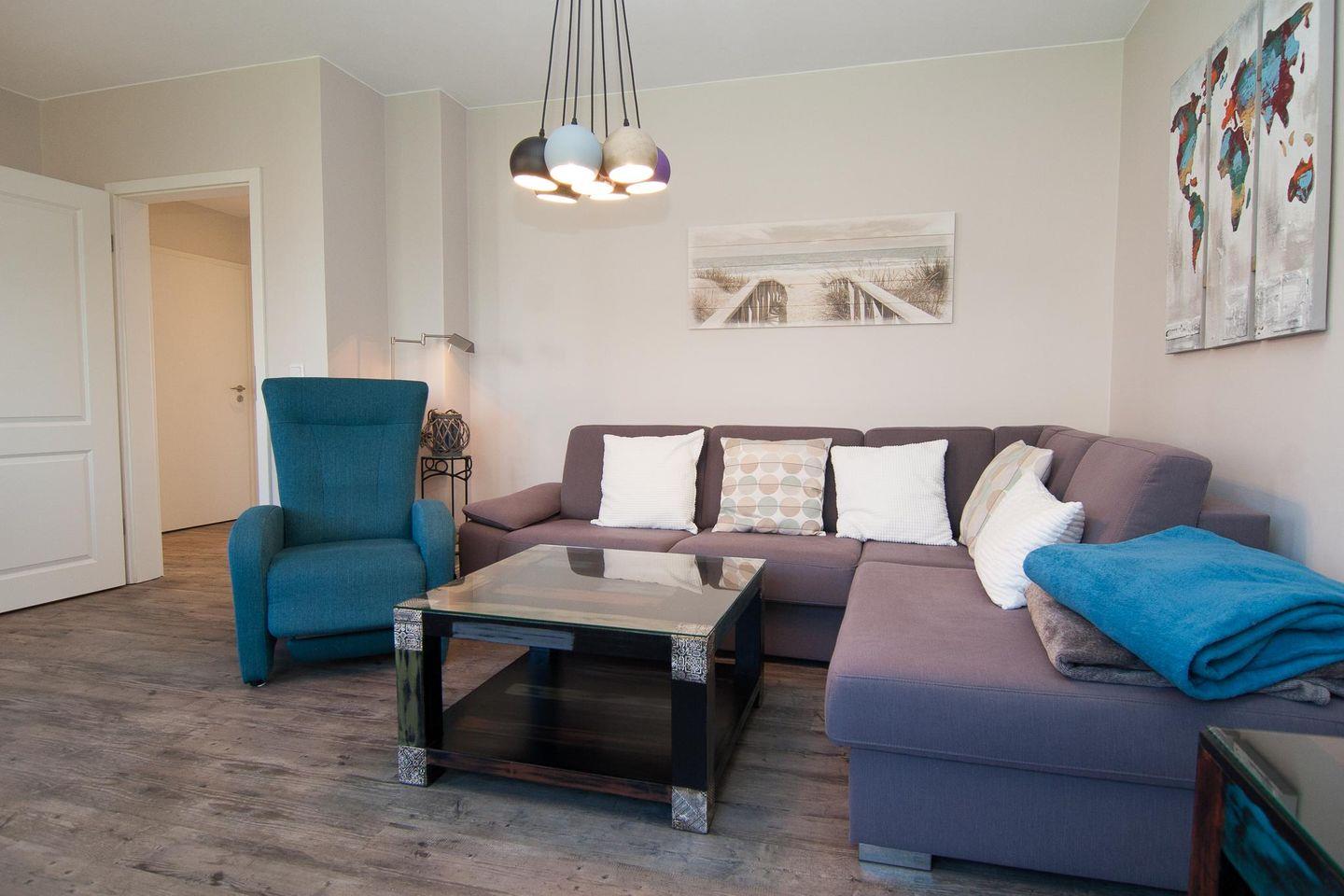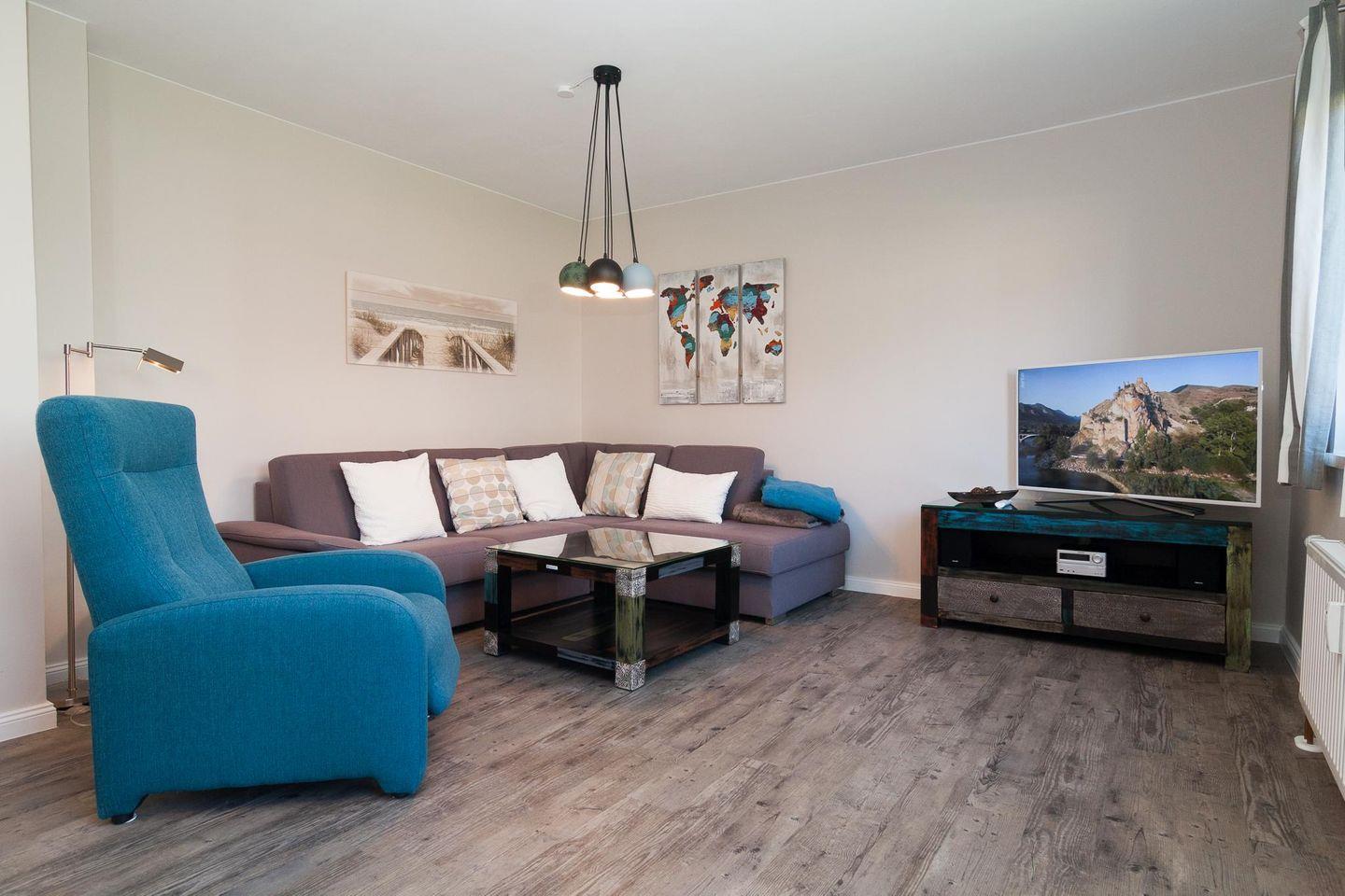Mit einer großzügigen Fläche von 58 m² erwartet Sie eine lichtdurchflutete und freundlich gestaltete Wohnung, die mit vielen Annehmlichkeiten ausgestattet ist, um Ihnen einen komfortablen Aufenthalt zu gewährleisten. Das stilvolle Wohnzimmer lädt zum Entspannen ein und bietet eine Sofaecke sowie einen Esstisch, an dem Sie gemütliche Abende mit Ihren Liebsten verbringen können. Zur technischen Ausstattung gehört ein moderner Fernseher mit Satellitenanschluss sowie eine HiFi-Anlage, damit Sie Ihre Lieblingsmusik oder Filme genießen können.