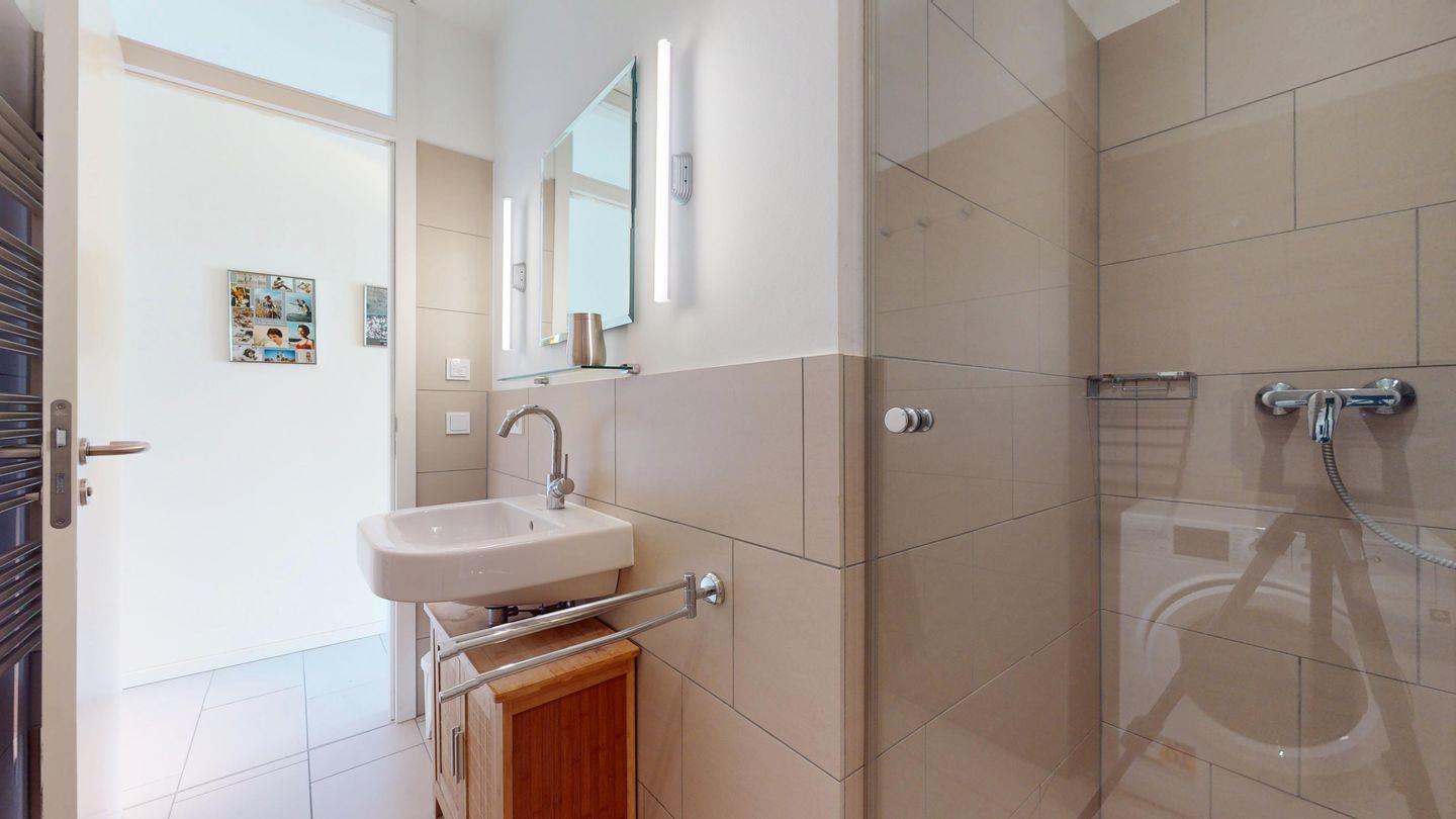 Im Erdgeschoss erwartet Sie eine voll ausgestattete Küche mit großzügigem Essbereich und direktem Zugang zur sonnigen Terrasse – perfekt für gemeinsame Mahlzeiten im Freien. Außerdem befinden sich hier ein separates WC, ein Duschbad sowie ein Schlafzimmer mit Doppelbett.