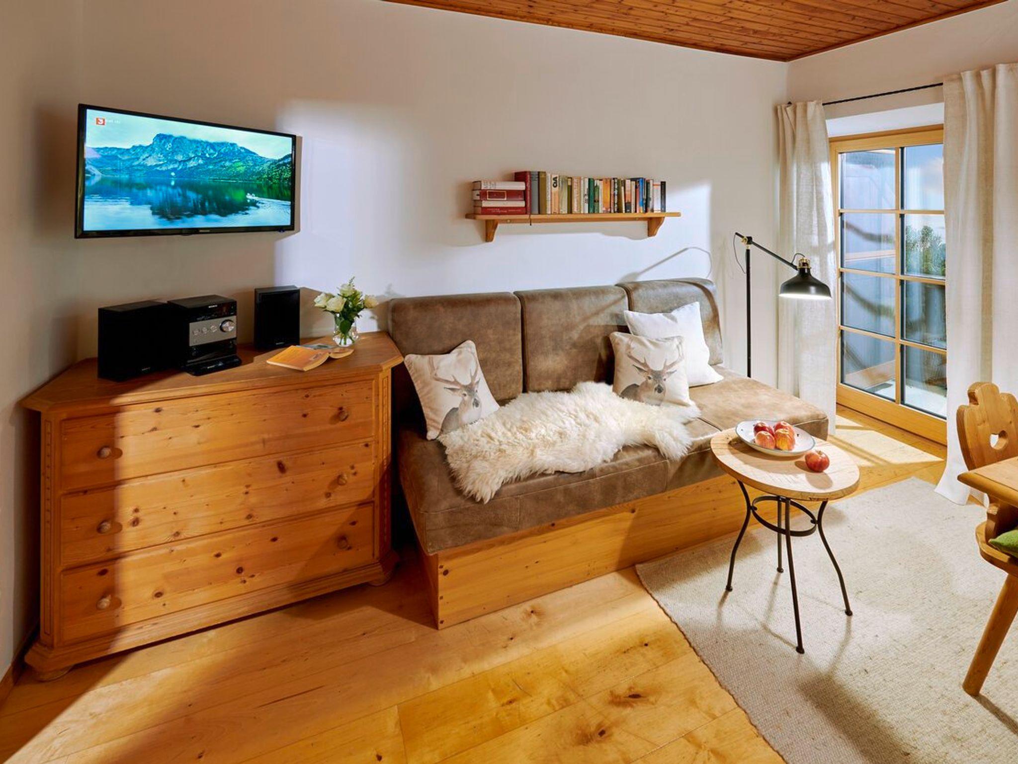 Gemütlich eingerichtete Ferienwohnung mit Bergblick und Ostbalkon zum Bauerngarten, 2 Schlafzimmer, 1 Bad mit Dusche/WC, zusätzliche Dusche und extra WC, komplett eingerichtete Wohnküche mit Spülmaschine, Microwellenherd, Kühlschrank, Backofen etc., Sitzcouch, gute Leselampe und kleines Büchersortiment, Sat-TV.