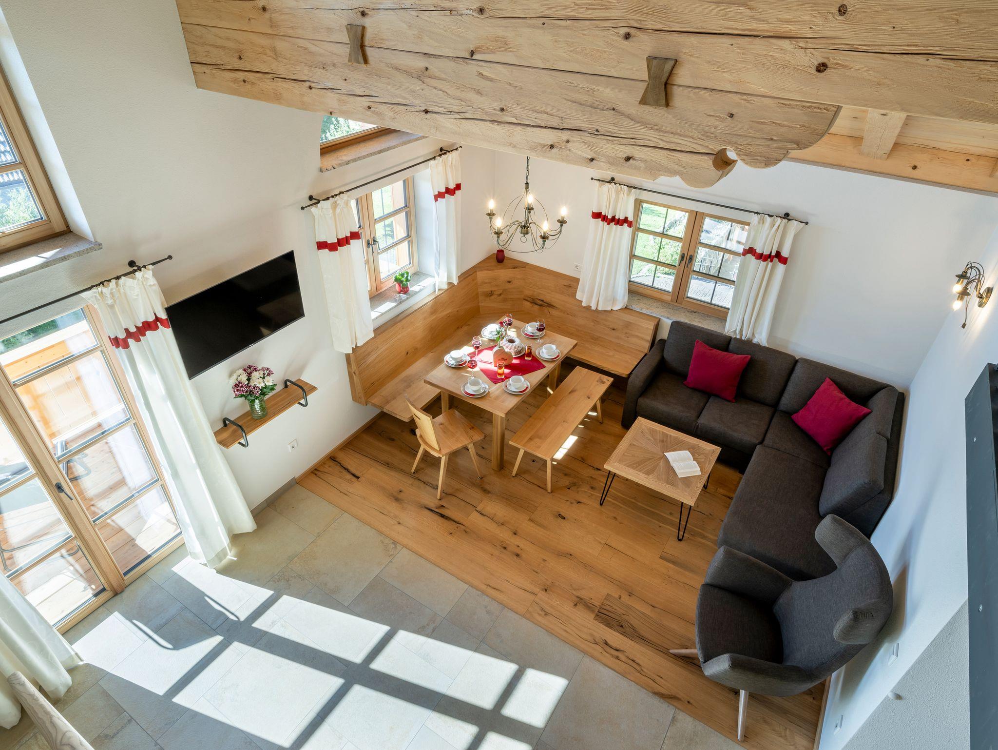 Sie haben die Möglichkeit, in einer unserer neuen 5-Sterne-Luxus-Wohnungen zu wohnen. Hier trifft modernste Ausstattung auf uriges, rustikales Ambiente. Die exklusive, 2-stöckige Maisonetten-Wohnung Kampenwand ist ähnlich eingerichtet wie unser Apartment Watzmann und belegt 100 m² der ersten Etage.