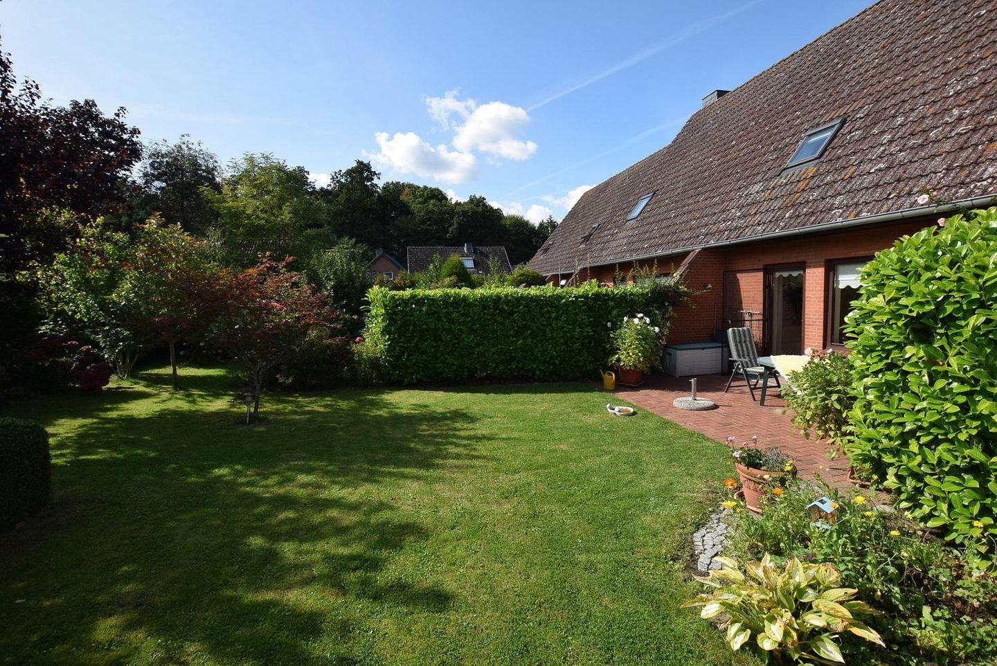 Vom Wohnzimmer erreichen Sie die große Terrasse mit Blick in den Garten - kein Seeblick.