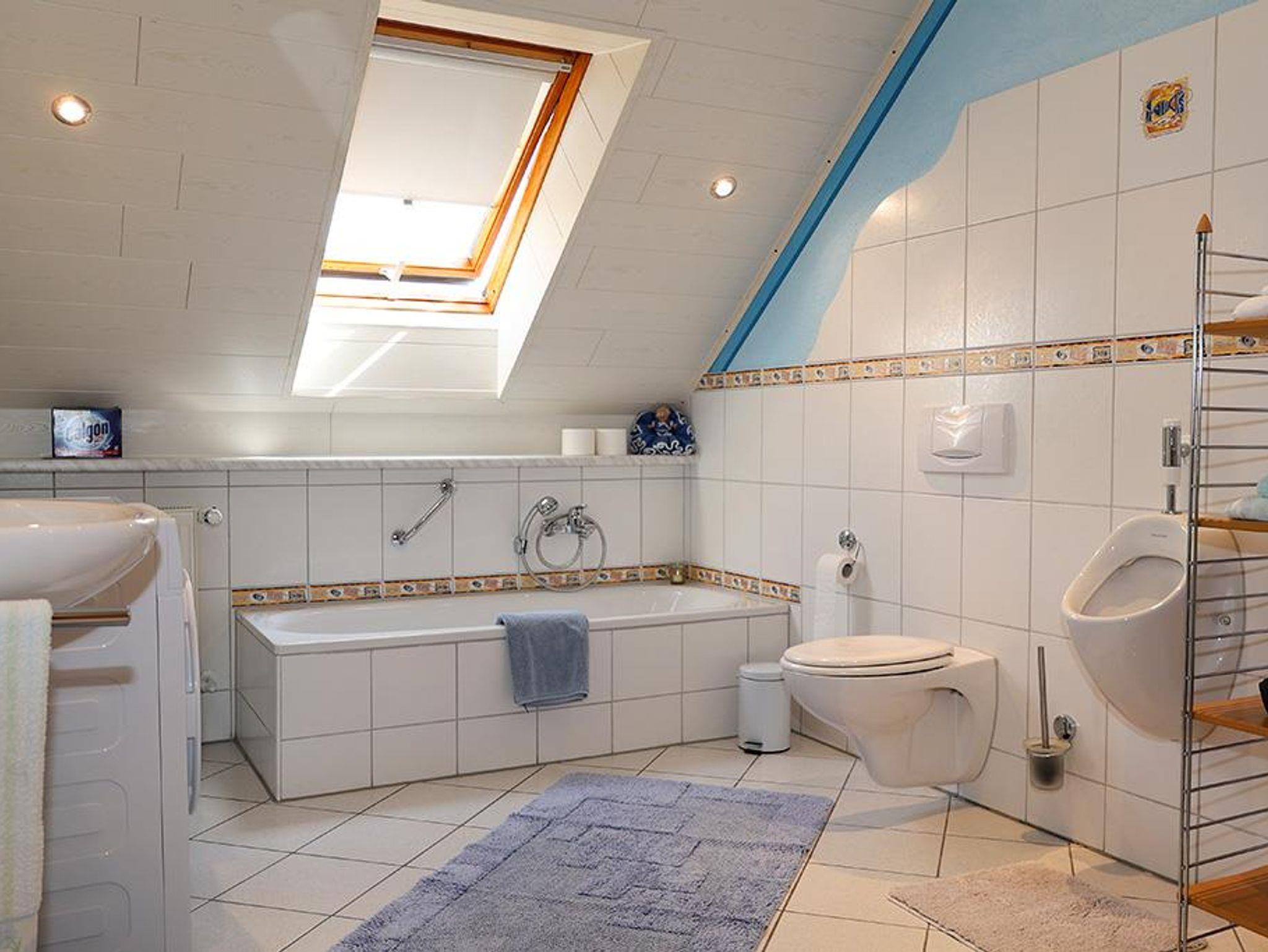 Zwei Doppelschlafzimmer, ein geräumiges Bad mit Duschkabine, Badewanne, WC, Urinal, Waschbecken und Waschmaschine im Bad.