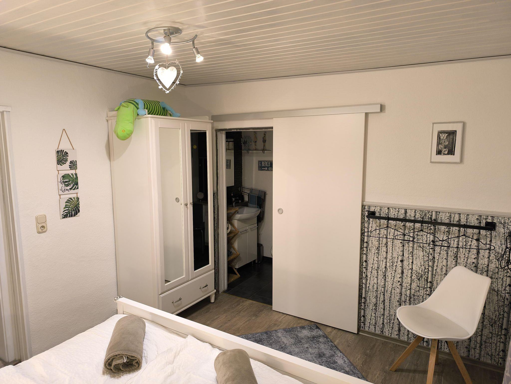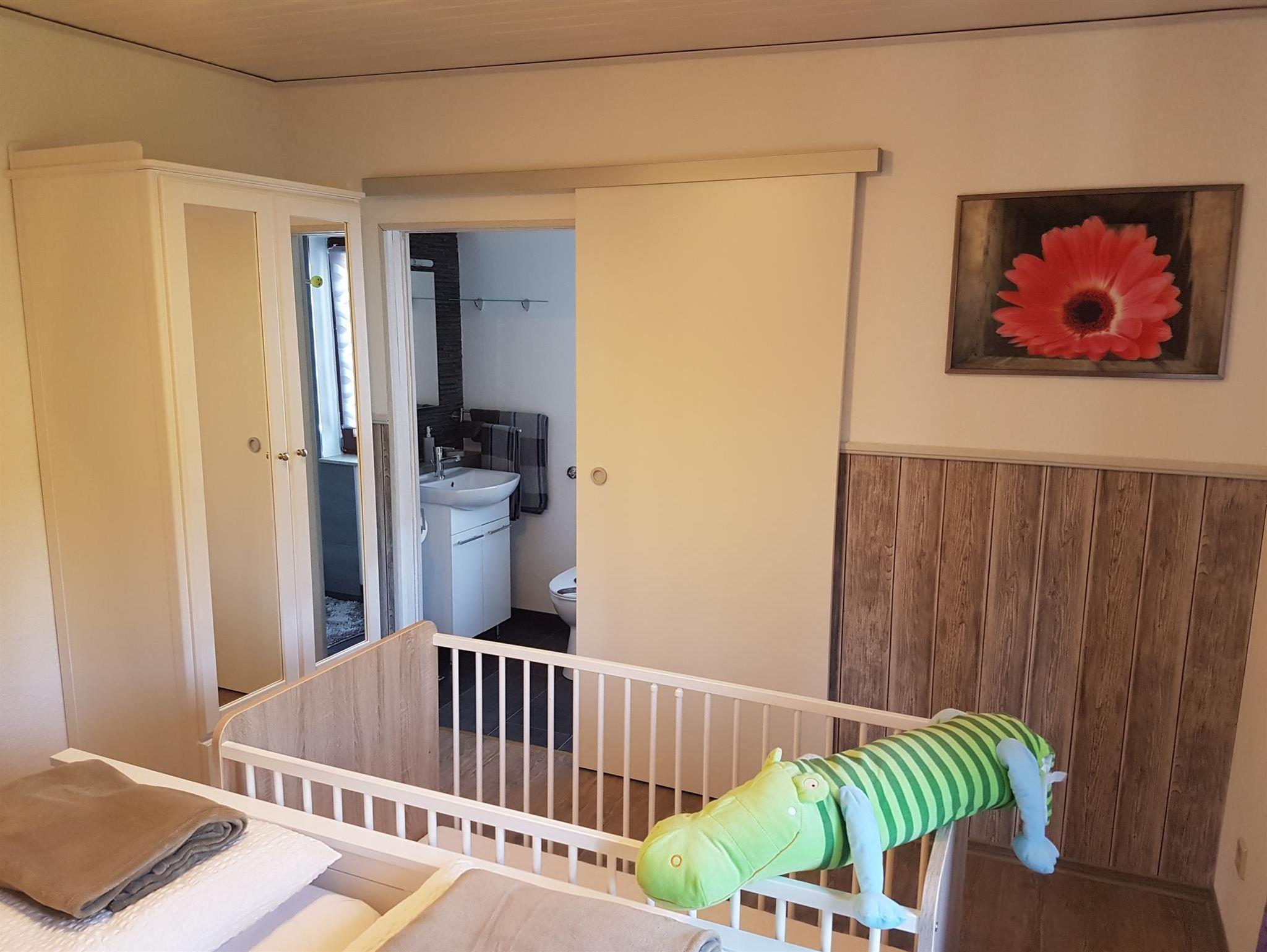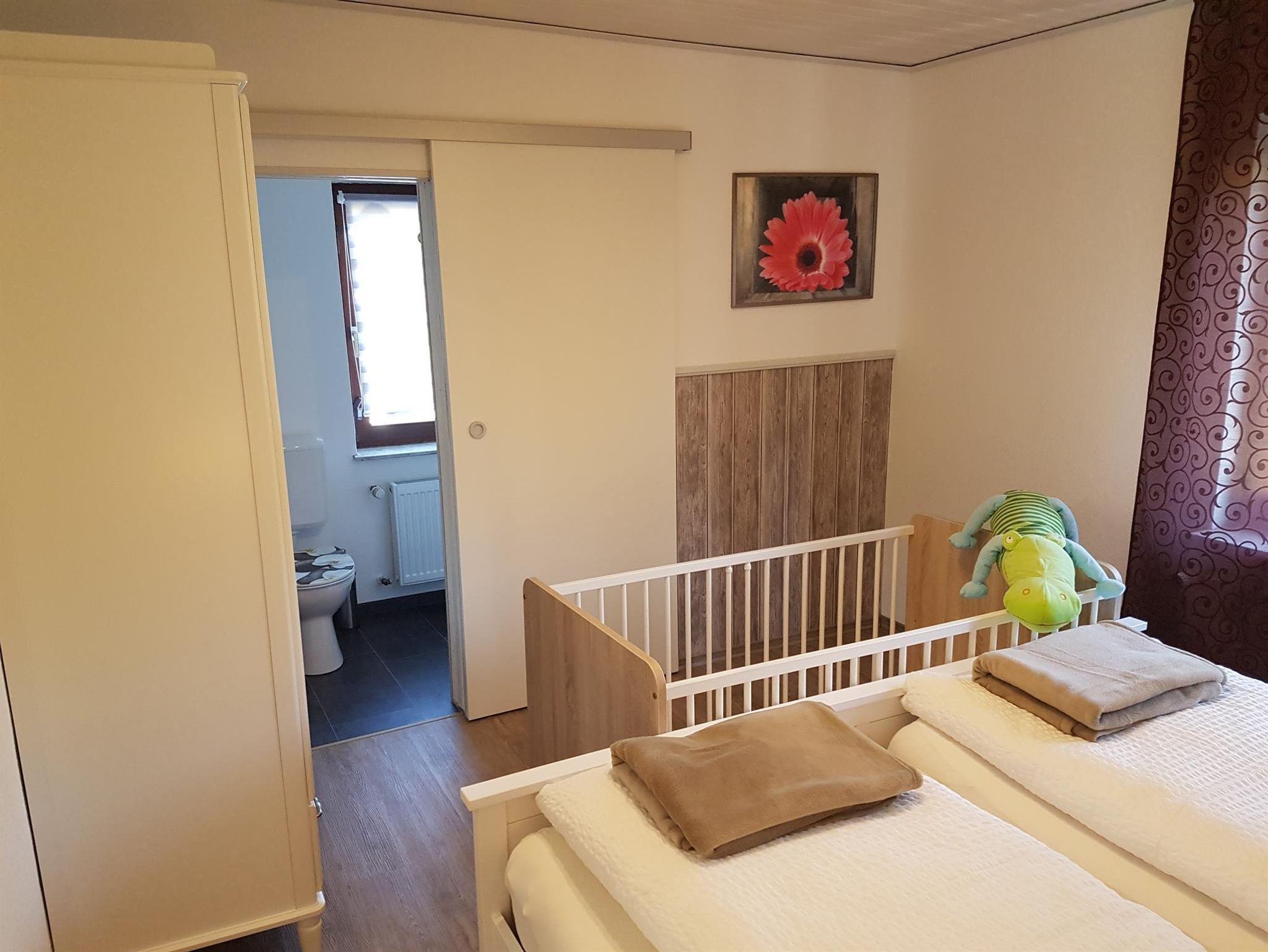 Die Ferienwohnung verfügt über ein Badezimmer, ein Schlafzimmer (1x Bett 180x200cm + 1 Kinderbett)