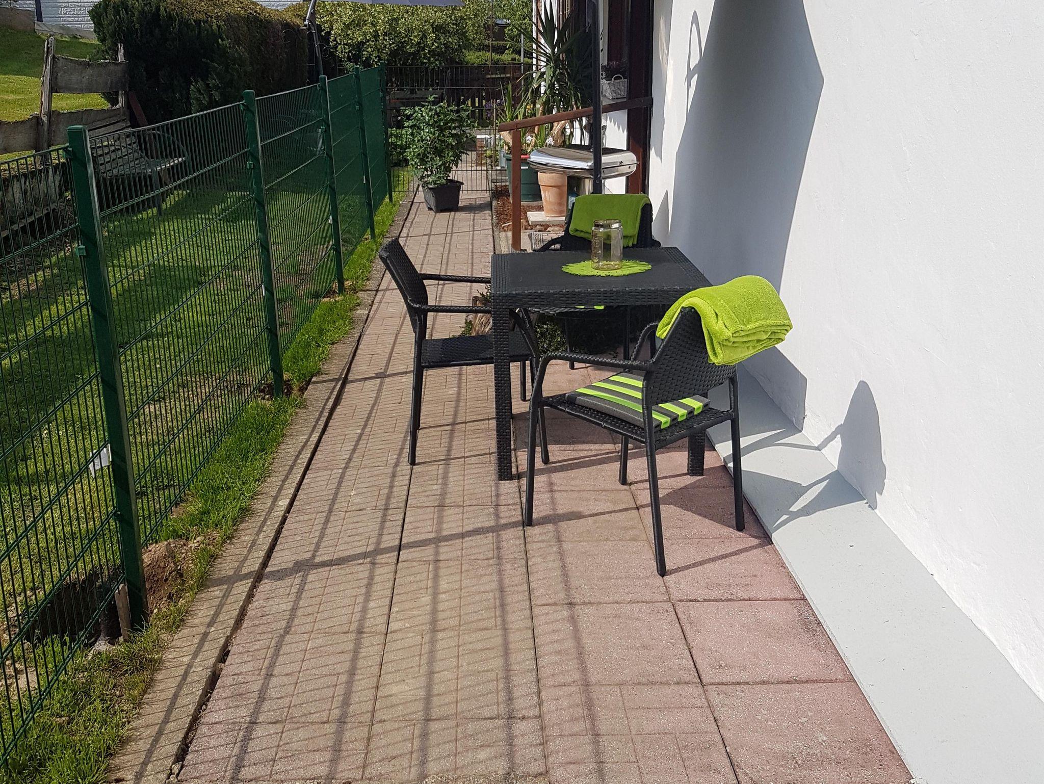 Die Wohnung verfügt über einen eigenen Eingang, Außenrollladen (teils elektr.), einen kleinen Balkon ca. 5 m², sowie eine Terrasse ca. 10m² und ein komplett eingezäuntes Grundstück ca. 50m².