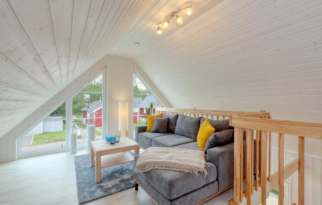På 1. sal ligger der en åben etage, som er lyst og venligt takket være panoramavinduerne. Her kan I hygge og slappe af. Når der er godt vejr, er terrassen med havemøbler et dejligt sted at være.
