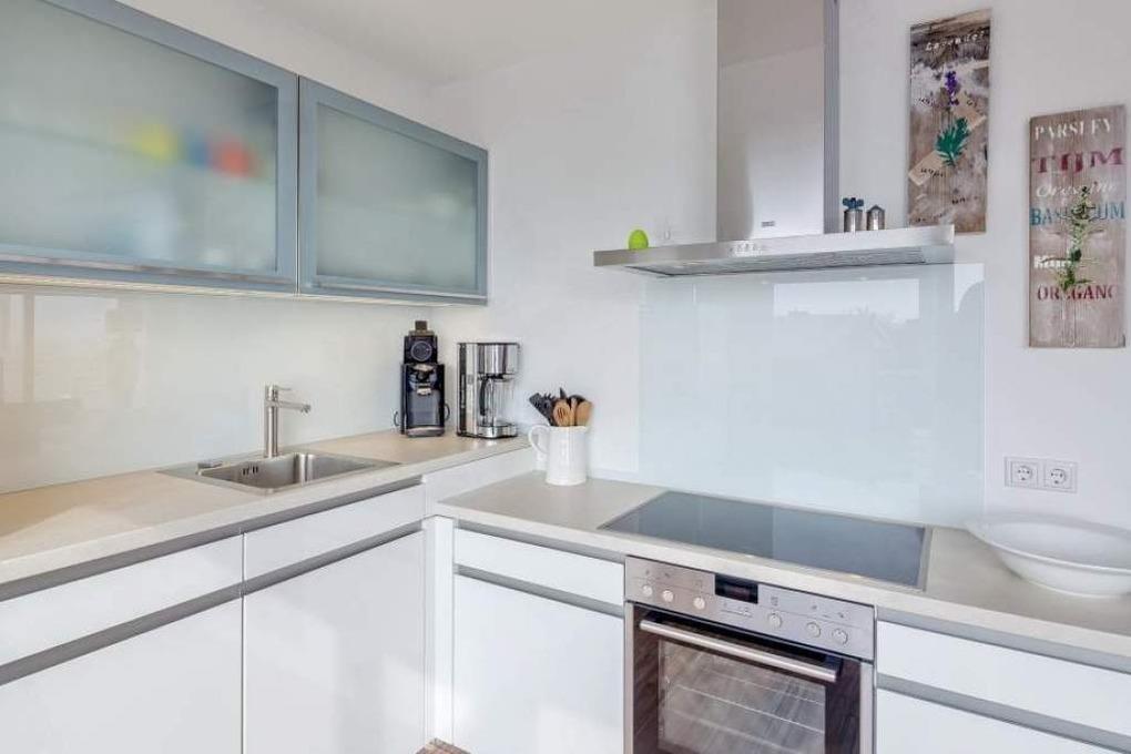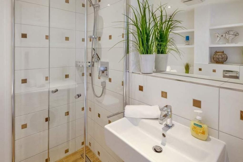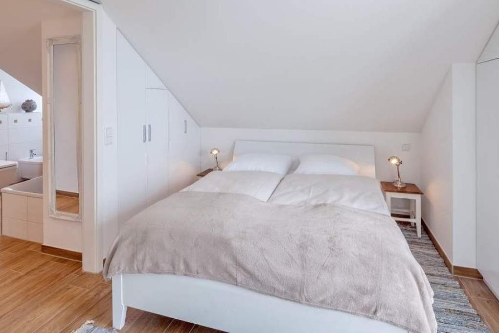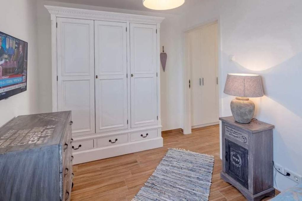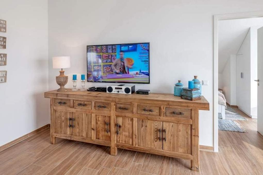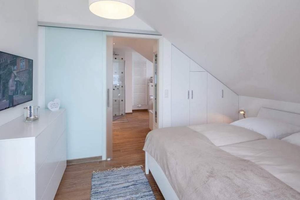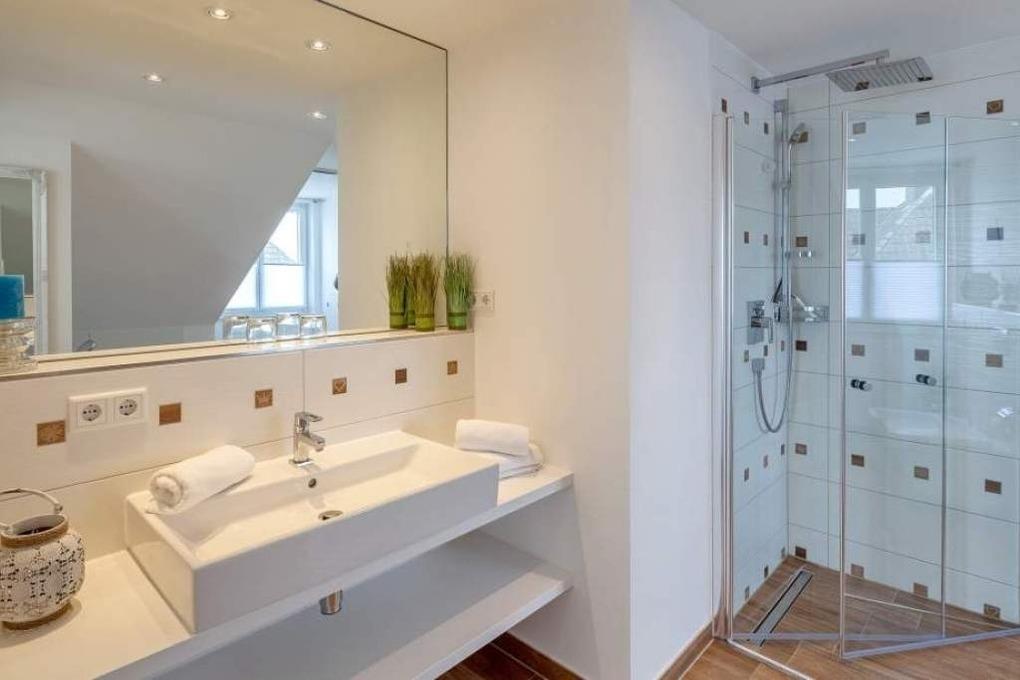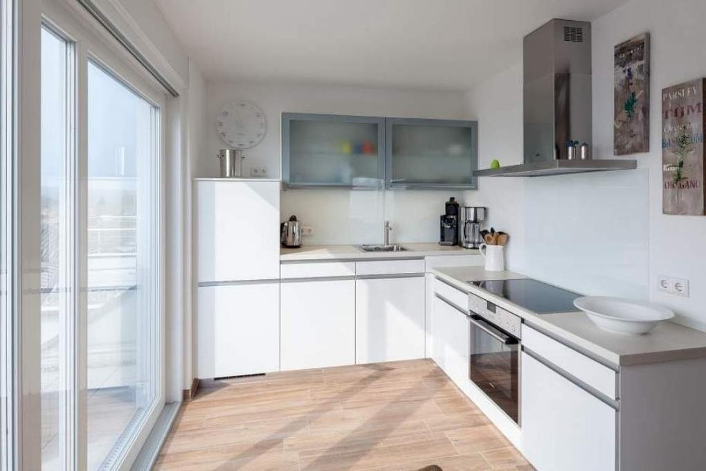 Diese moderne Ferienwohnung ist hochwertig und geschmackvoll eingerichtet. Der Wohnbereich ist mit Blu-ray-Player, CD-Player, Flachbildfernseher und kostenlosem WLAN ausgestattet. Die offene Küche ist komplett eingerichtet und lässt keine Wünsche offen. Beide Schlafzimmer sind mit Doppelbetten (1,60 m x 2,00 m, einzelne Matratzen) und TV-Flachbildschirmen ausgestattet. Zur Verdunkelung sind elektrische Rollläden angebracht. Die beiden Bäder sind mit jeweils einer bodentiefen Dusche ausgestattet. In einem der Bäder befindet sich zusätzlich eine Badewanne. Im kleineren Bad steht Ihnen eine Waschmaschine zur Verfügung. Ein Föhn, Handtuchheizkörper, Kosmetikspiegel und Fußbodenheizung sind selbstverständlich. Die Dachterrassen sind mit einer Sonneninsel, Tisch und Stühlen, 2 Sonnenliegen sowie einem Sonnenschutz ausgestattet.