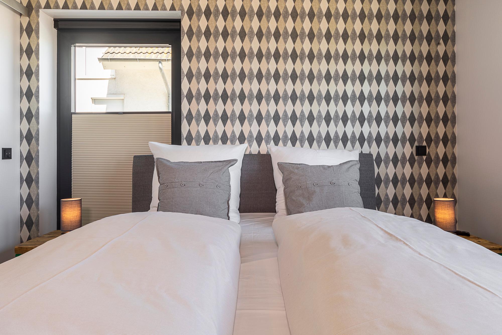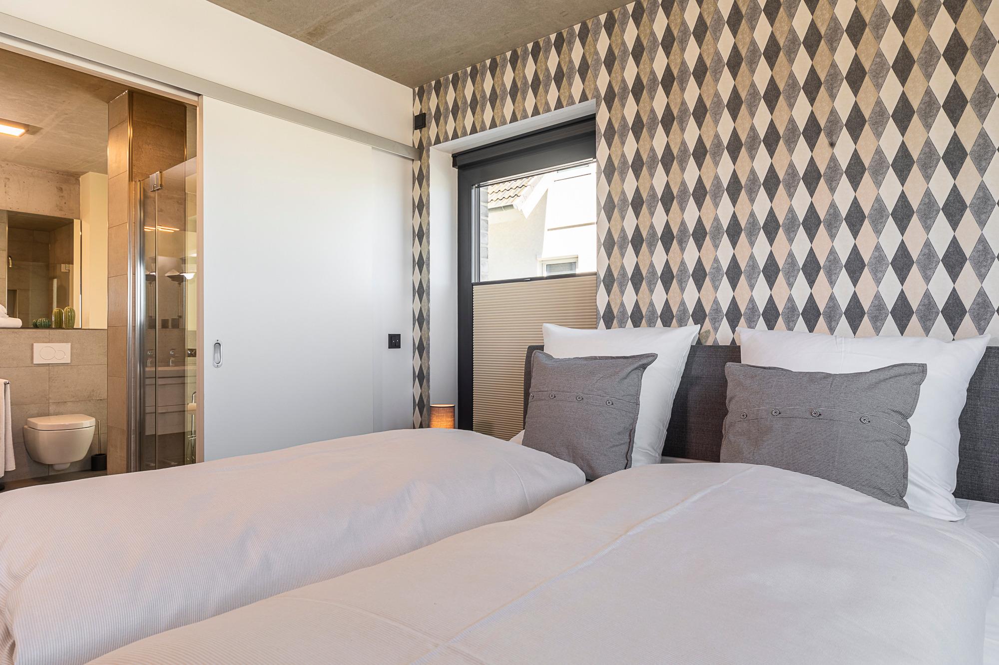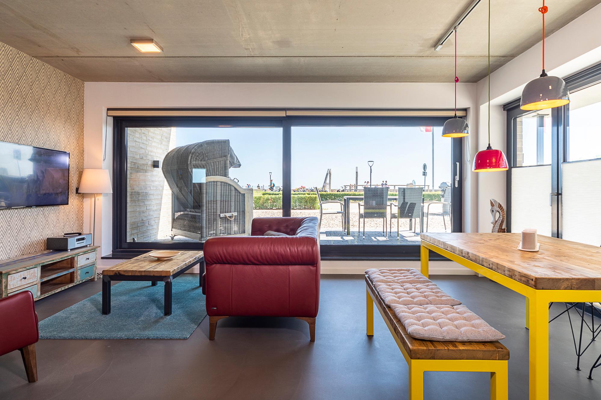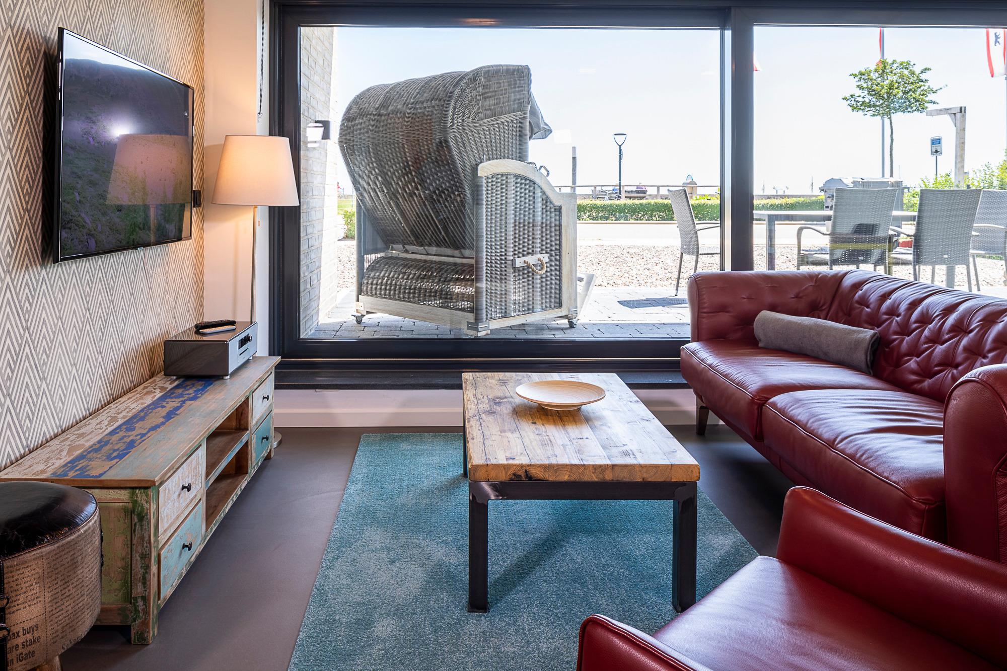 Diese 3-Zimmer-Wohnung besticht durch eine zeitlos elegante Einrichtung (Design-Pandomo-Fußboden). Das helle Wohnzimmer mit Flachbild-TV und einer komplett ausgestatteten Küchenzeile eignet sich für einen komfortablen Urlaub. Zwei stylische Schlafzimmer verfügen über ein Bad en Suite. Das erste Schlafzimmer ist mit einem Boxspringbett (1,80 x 2,00 m), mit durchgehender Matratze (der Firma Jensen), einem Kleiderschrank sowie TV ausgestattet, das zweite Schlafzimmer mit einem Boxspringbett (1,80 x 2,10m), mit zwei geteilten Matratzen (der Firma Jensen), einem Kleiderschrank sowie TV. Die Bäder sind mit einer bodengleichen Dusche / Regendusche sowie einem Handtuchheizkörper ausgestattet. Auf der Terrasse genießen Sie die Morgen- und Mittagssonne und als besonderes Bonbon steht Ihnen hier ein Strandkorb zur Verfügung. Zur komfortablen und sicheren Unterbringung Ihres PKWs steht Ihnen ein Außenstellplatz direkt am Haus zur Verfügung. Ebenso im Haus steht ein Gemeinschaftsraum mit Waschmaschine und Trocknerb bereit, die über einen Münzzähler bedient werden. Auch Fahrräder können sicher im abschließbaren Fahrradraum untergestellt werden.