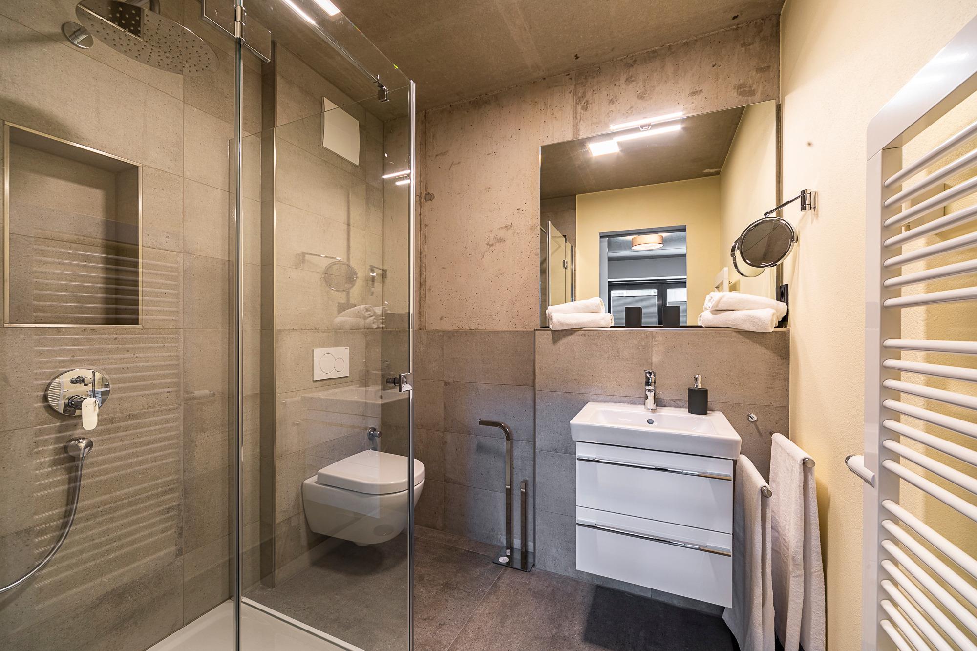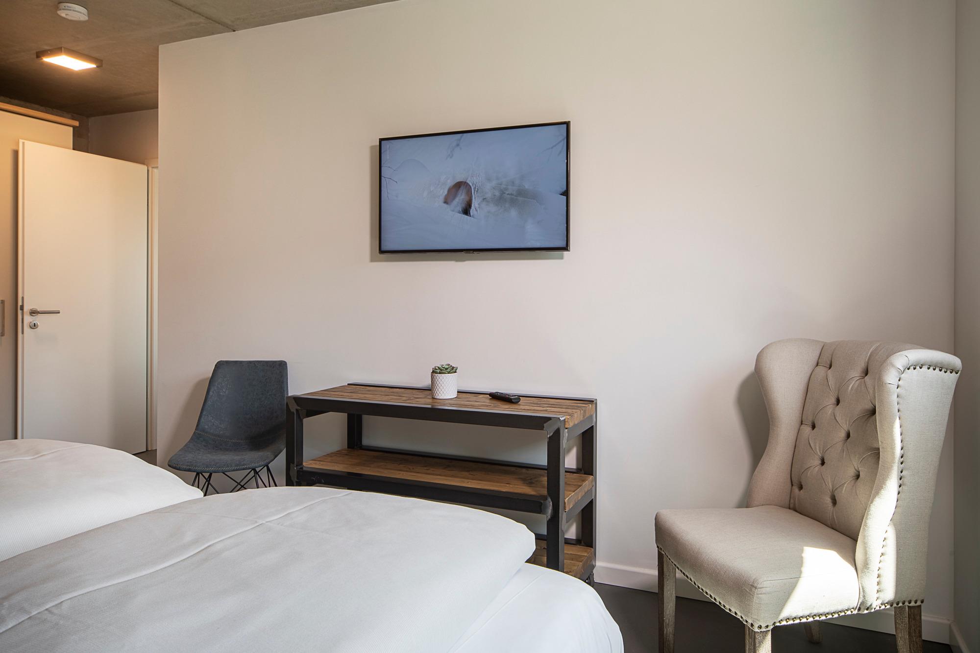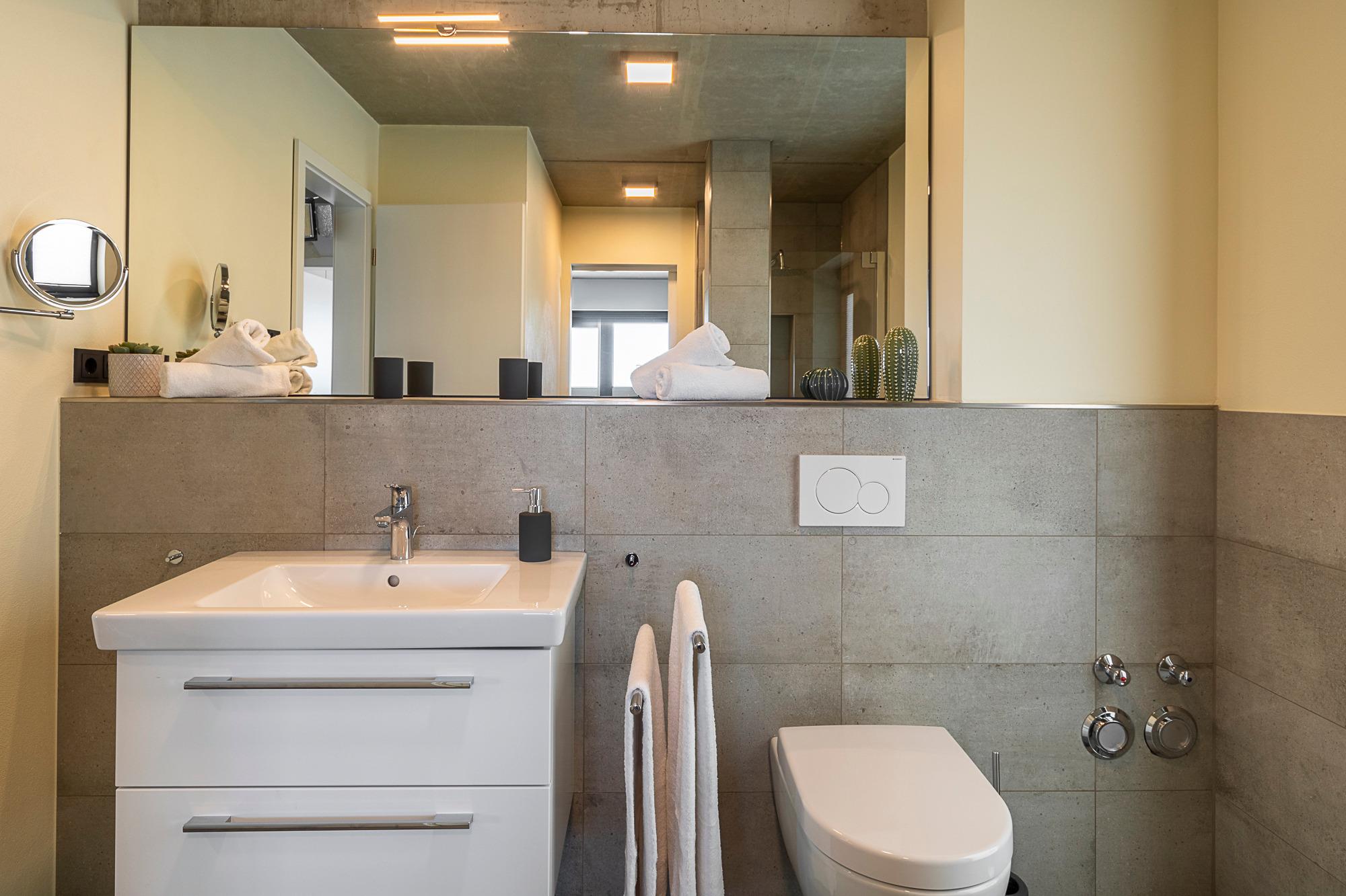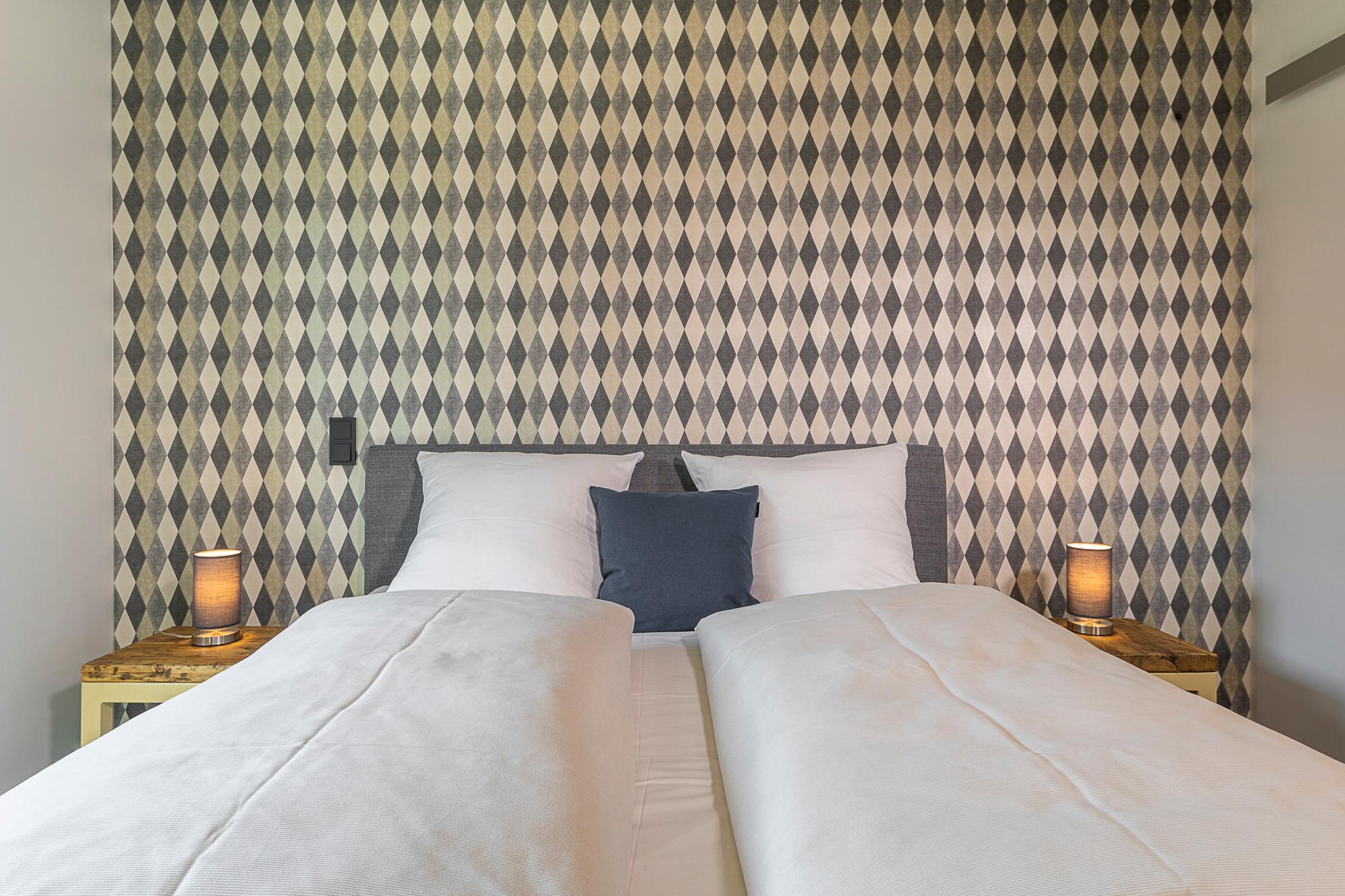 Diese 3-Zimmer-Wohnung besticht durch eine zeitlos elegante Einrichtung (Design-Pandomo-Fußboden). Das helle Wohnzimmer mit Flachbild-TV und einer komplett ausgestatteten Küchenzeile eignet sich für einen komfortablen Urlaub. Zwei stylische Schlafzimmer verfügen über ein Bad en Suite. Das erste Schlafzimmer ist mit einem Boxspringbett (1,80 x 2,00 m), mit durchgehender Matratze (der Firma Jensen), einem Kleiderschrank sowie TV ausgestattet, das zweite Schlafzimmer mit einem Boxspringbett (1,80 x 2,10m), mit zwei geteilten Matratzen (der Firma Jensen), einem Kleiderschrank sowie TV. Die Bäder sind mit einer bodengleichen Dusche / Regendusche sowie einem Handtuchheizkörper ausgestattet. Auf der Terrasse genießen Sie die Morgen- und Mittagssonne und als besonderes Bonbon steht Ihnen hier ein Strandkorb zur Verfügung. Zur komfortablen und sicheren Unterbringung Ihres PKWs steht Ihnen ein Außenstellplatz direkt am Haus zur Verfügung. Ebenso im Haus steht ein Gemeinschaftsraum mit Waschmaschine und Trocknerb bereit, die über einen Münzzähler bedient werden. Auch Fahrräder können sicher im abschließbaren Fahrradraum untergestellt werden.