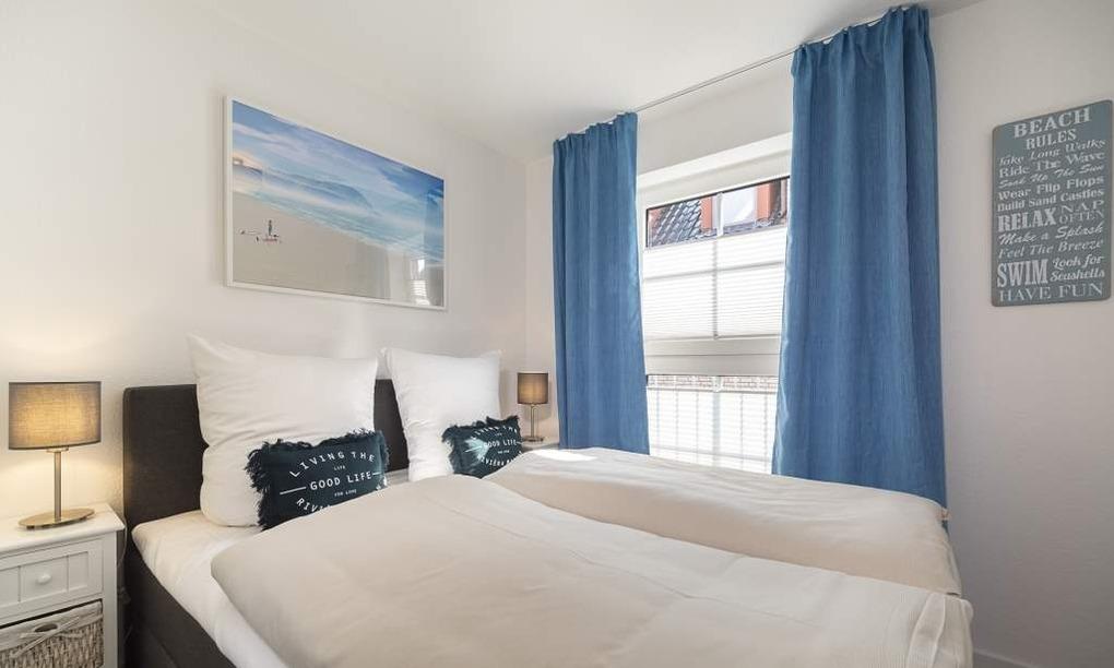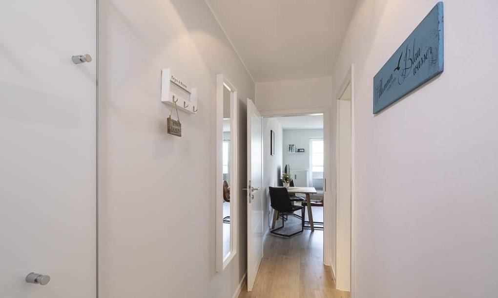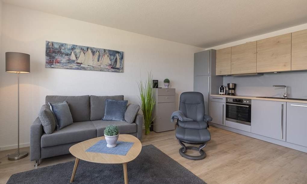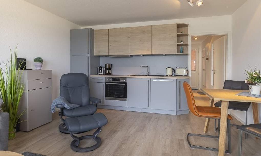 Die Ferienwohnung ist durchgehend mit einem hellen Bodenbelag in angenehmer Holzoptik ausgestattet. Vom offenen Wohn-Essbereich haben Sie einen direkten Blick auf die Ostsee. Die hochwertige, neue Küchenzeile lässt keine Wünsche offen. Geschirrspüler, Backofen, Induktionskochfeld und Kühlschrank mit Eisfach, Kaffeemaschine und Caffissimo sind vorhanden. Der Wohnraum verfügt über einen Essplatz sowie einen gemütlichen Sitzbereich mit Couch und Stressless-Relaxsessel. Die Couch lässt sich in wenigen Handgriffen in ein bequemes Bett (1,40x2,00m) verwandeln. LED-TV, kostenloses WLAN, Internet-Radio/Bluetooth-Lautsprecher sind vorhanden. Das helle und moderne Badezimmer verfügt über Handtuchheizkörper und Regendusche. Im Schlafzimmer befinden sich ein geräumiger Kleiderschrank und ein bequemes Boxspringbett. Der Balkon, mit Tisch und Stühlen sowie einem Sonnenschutz lädt zum Entspannen ein. Genießen Sie den Blick auf die Ostsee.
