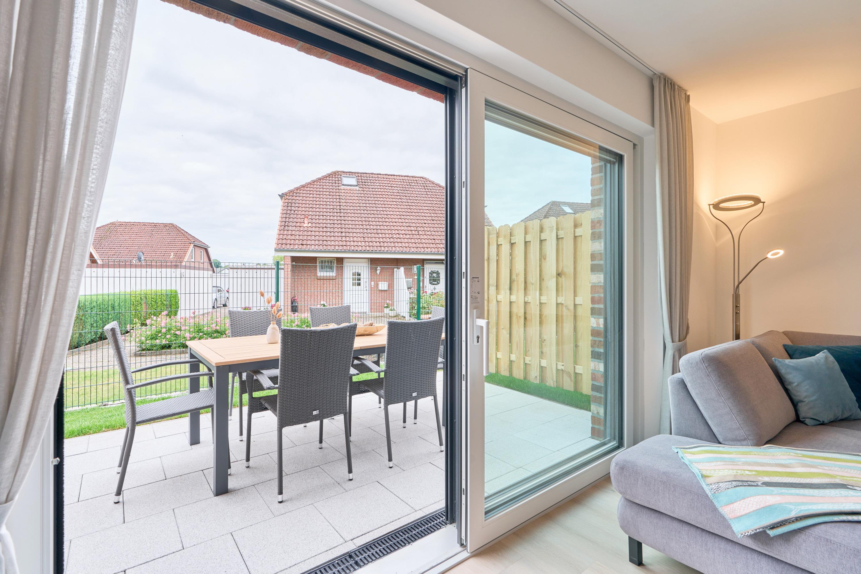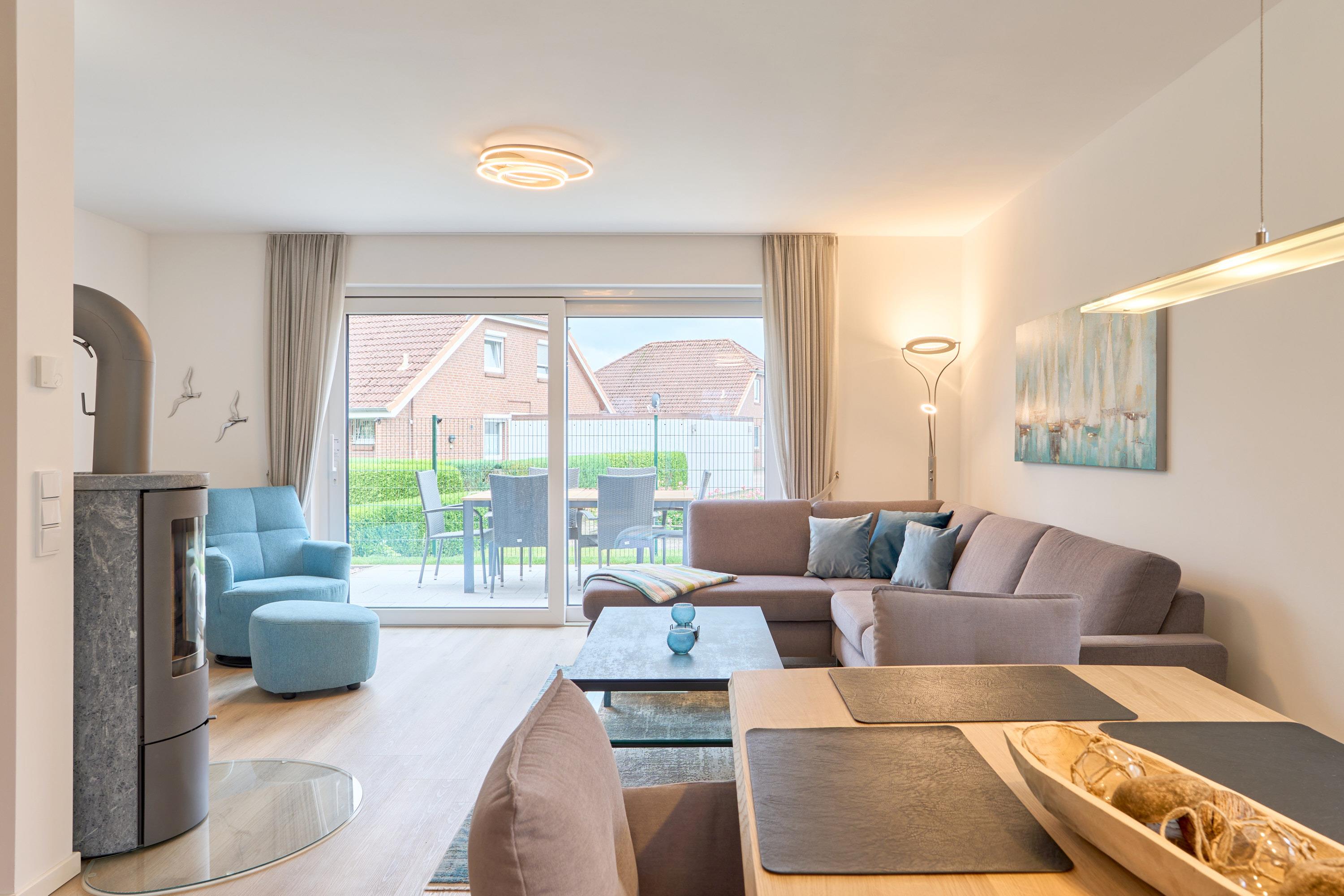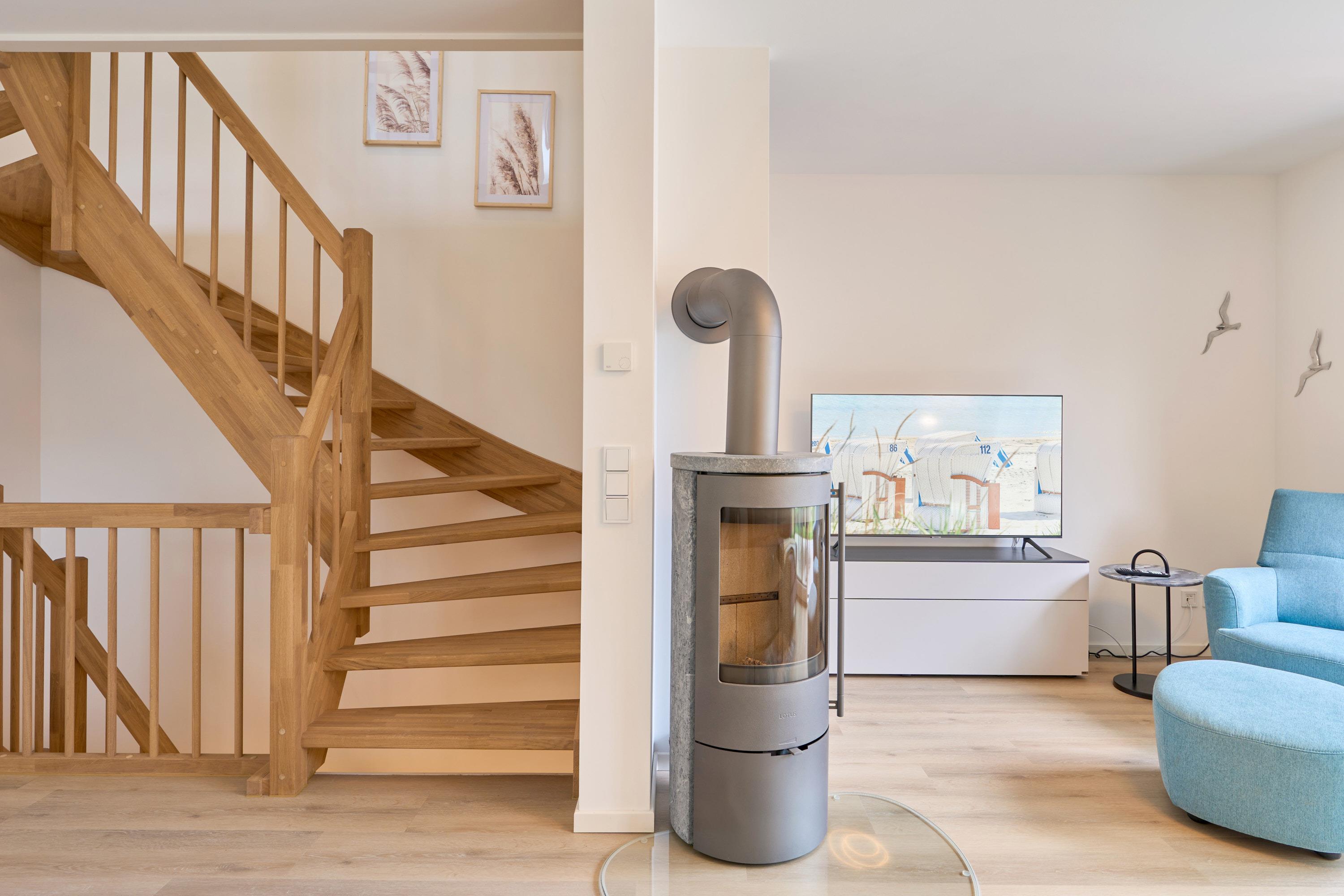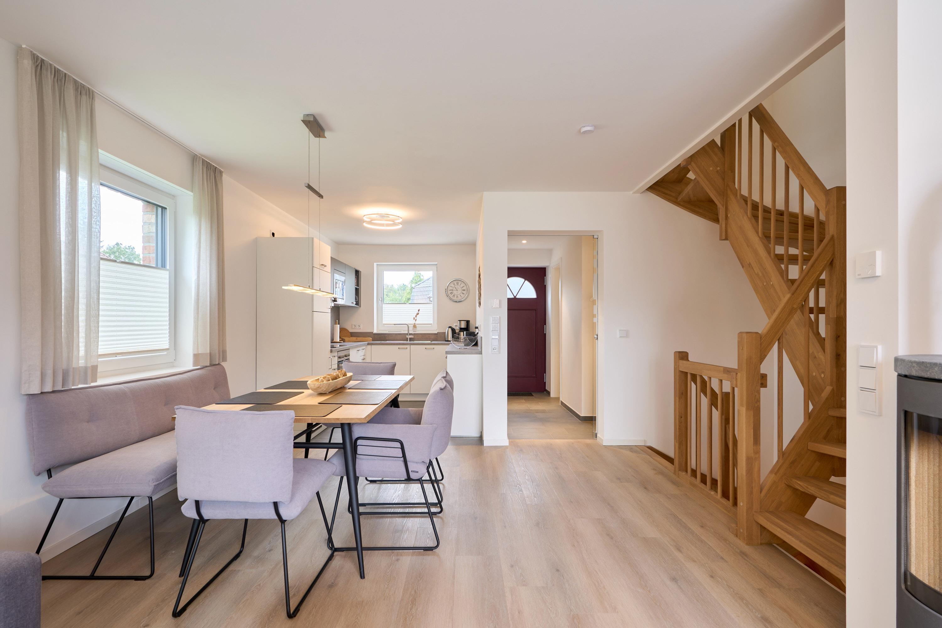 Dieses sehr ansprechende Ferienhaus hat eine Wohnfläche von ca. 100 m² und ist auf zwei Etagen aufgeteilt. Der Eingangsbereich ist großzügig mit einer Garderobe und einem Tageslichtbad ausgestattet und trennt den Wohn-Essbereich mit einer Glastür. Die Küchenzeile ist großzügig in U-Form angelegt. Alles da ... Geschirrspüler, Herd, Kochfeld, Kaffeemaschine, Toaster, Wasserkocher, Waschmaschine und vieles mehr. Der Essbereich bietet Platz für 6 Personen. Im Anschluss das gemütliche Wohnzimmer mit Sofa, Tisch, Relaxsessel, 55-Zoll-Smart-TV und Kamin für gemütliche Stunden in der kalten Jahreszeit. Vom Wohnzimmer aus betreten Sie die große Südterrasse.