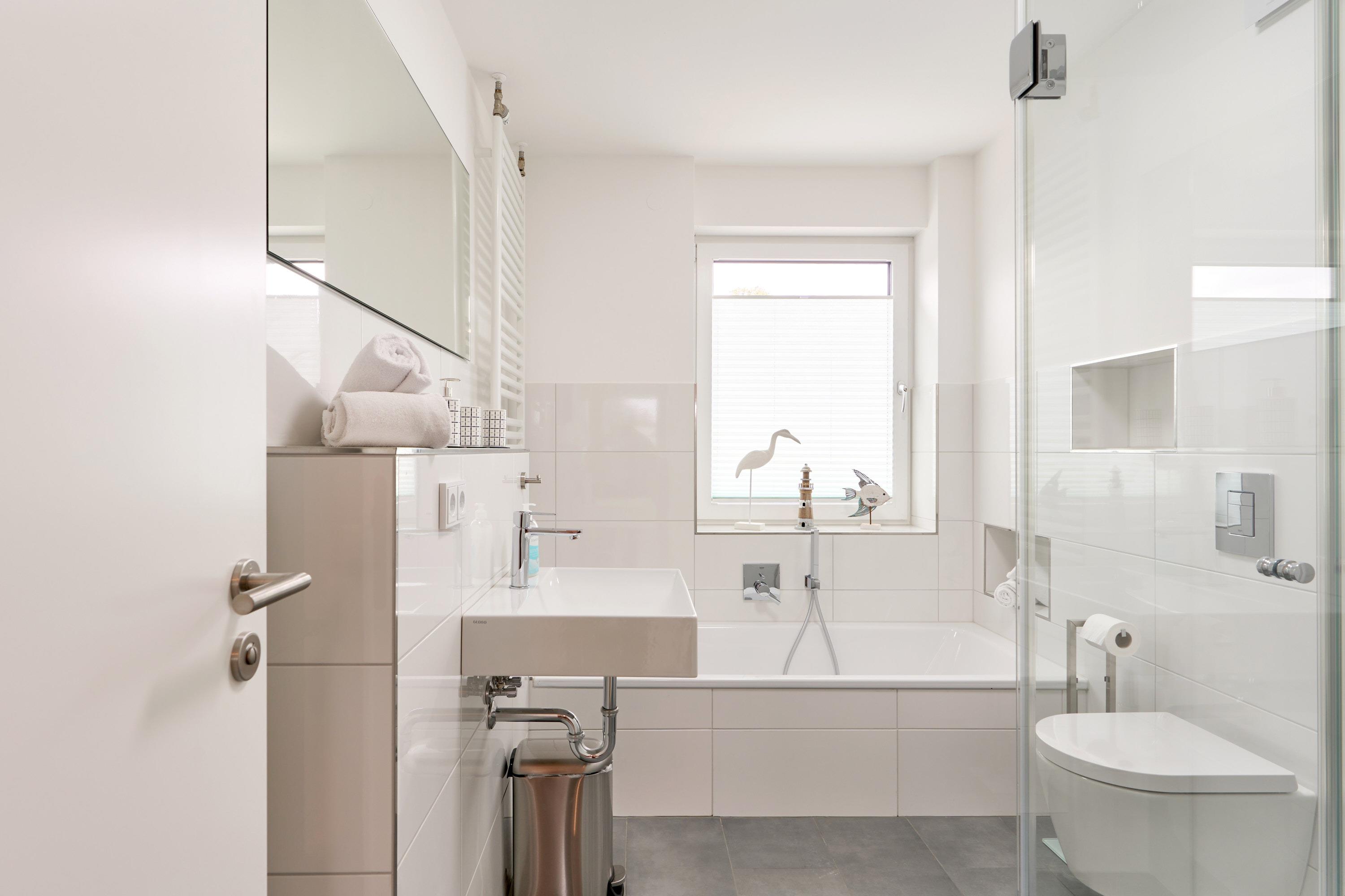 Über eine bequeme Treppe gelangen Sie in das 1. Obergeschoss. Hier befinden sich drei Schlafzimmer sowie das zweite Tageslichtbad, ausgestattet mit einer Badewanne sowie einer bodengleichen Dusche. Zwei Schlafzimmer sind mit je einem Kleiderschrank, zwei Nachttischen sowie mit einem Boxspringbett 1,80x2,00m ausgestattet. Das dritte Schlafzimmer ist mit einem Kombibett eingerichtet. Hier lässt sich aus dem Bettkasten eine weitere Schlafgelegenheit ausziehen. Alle Räume lassen sich mit elektrischen Rollläden verdunkeln.