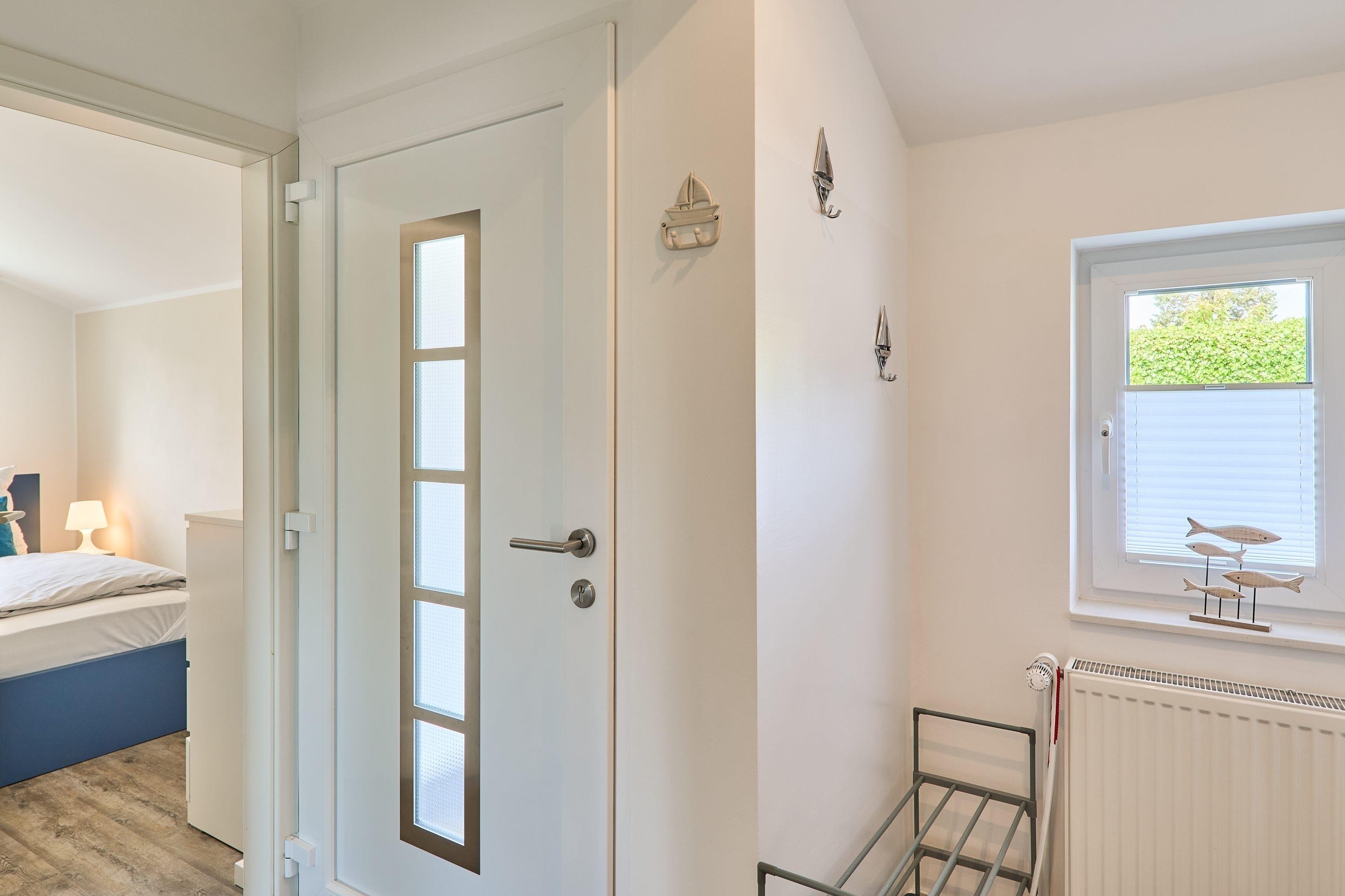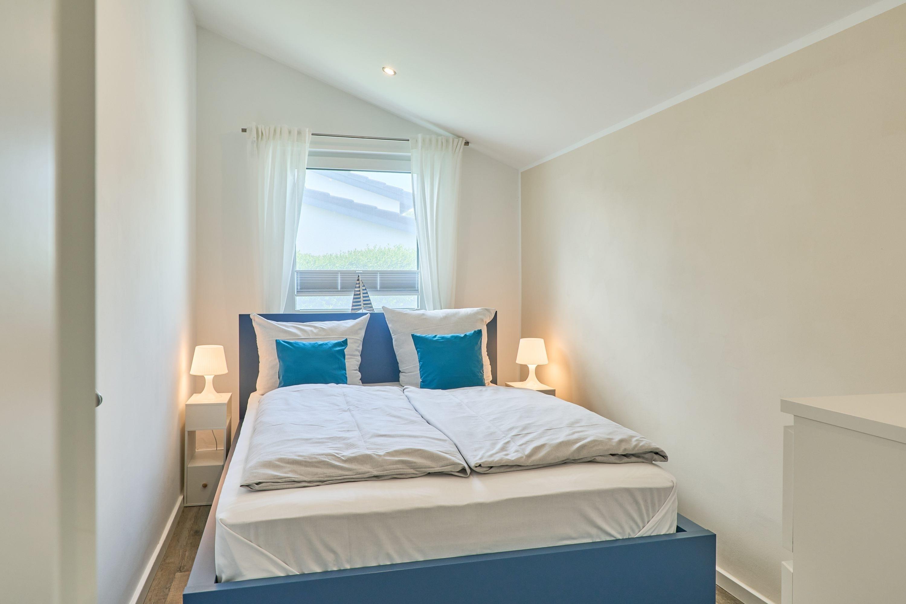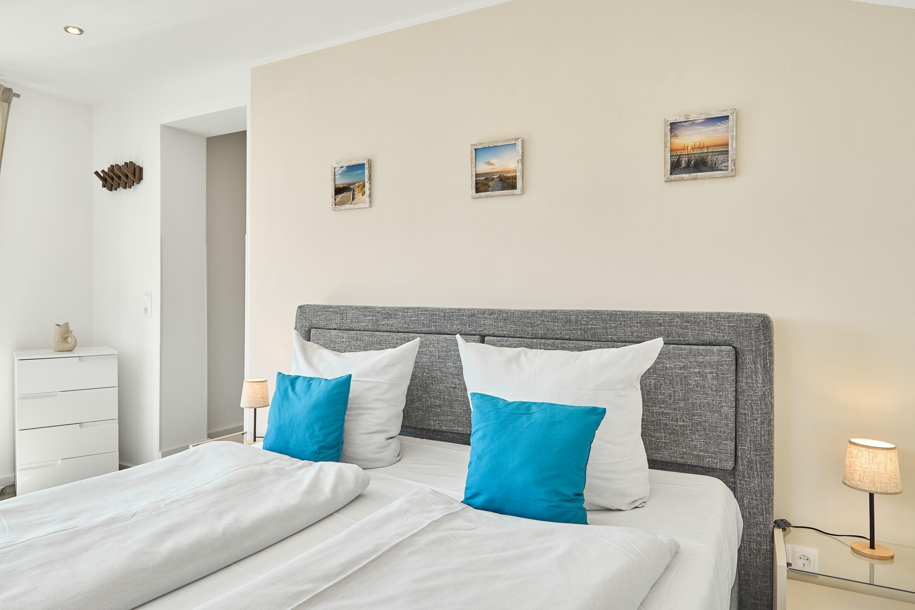 Eingangsbereich / Flurbereich: Das erste Schlafzimmer ist mit einem Doppelbett (1.60m x 2.00m), zwei Nachttischen sowie mit einer Komode ausgestattet. Über den Flur gelangen Sie in den Abstellraum. Der Abstellraum bietet Ihnen ausreichend Platz, um beispielsweise Ihre Koffer abzustellen. Weiter, über den Flurbereich gelangen Sie auf der rechten Seite in das Duschbad. Gegenüber liegt das Ankleidezimmer, von welchem Sie weiter in das zweite Schlafzimmer gelangen. Hier stehen Ihnen ein Doppelbett (1.80m x 2.00m), 2 Nachttische, 1 Kommode sowie ein TV zur Verfügung.