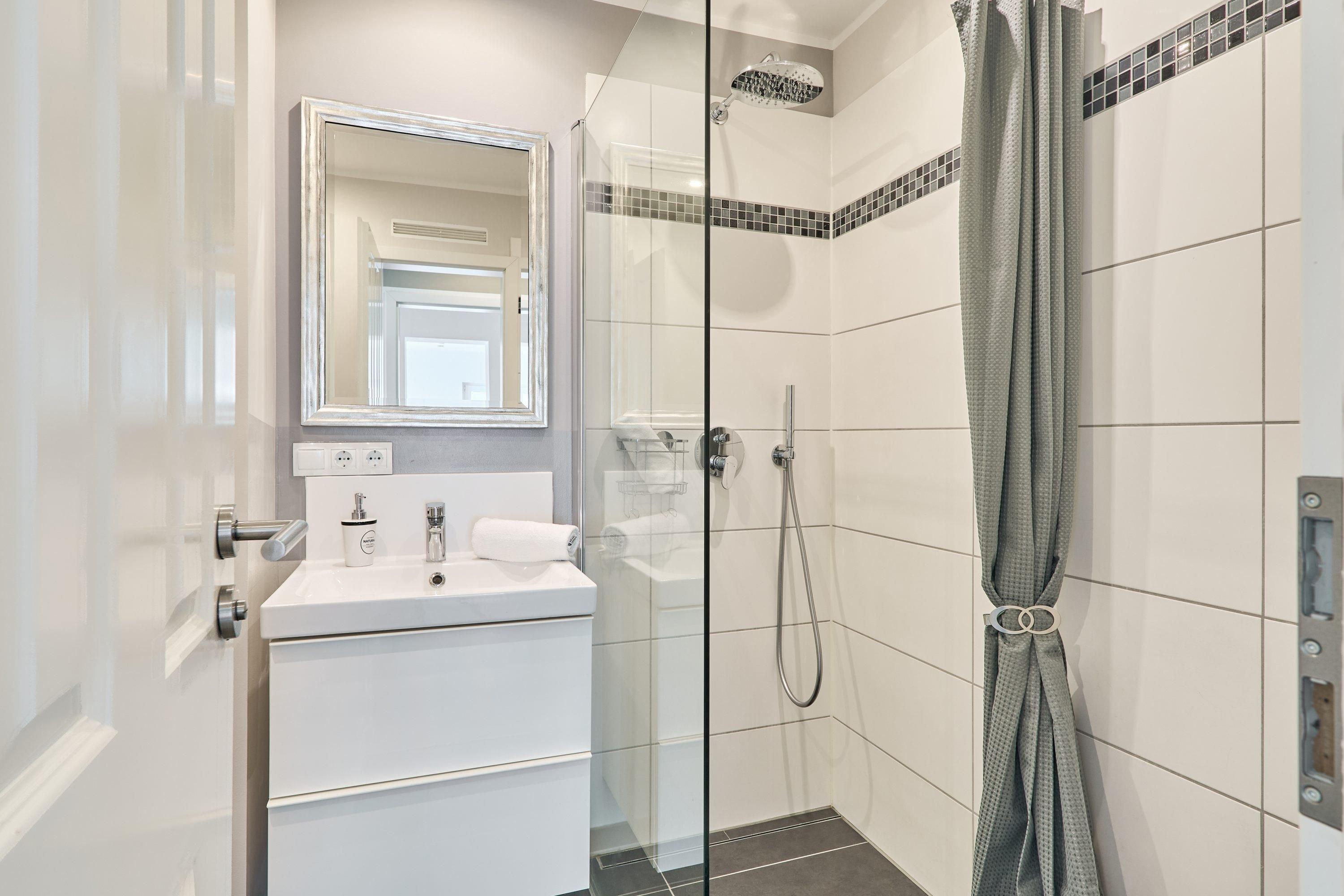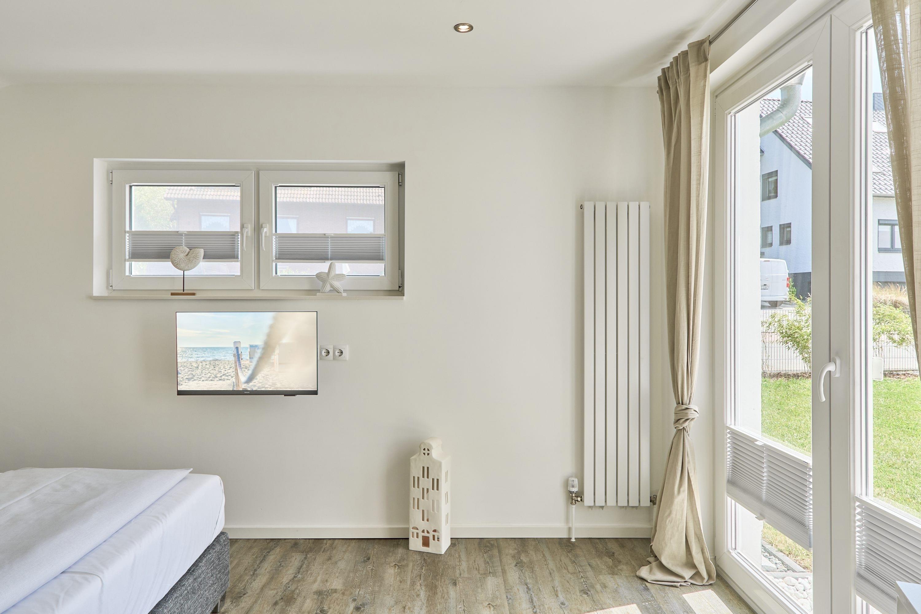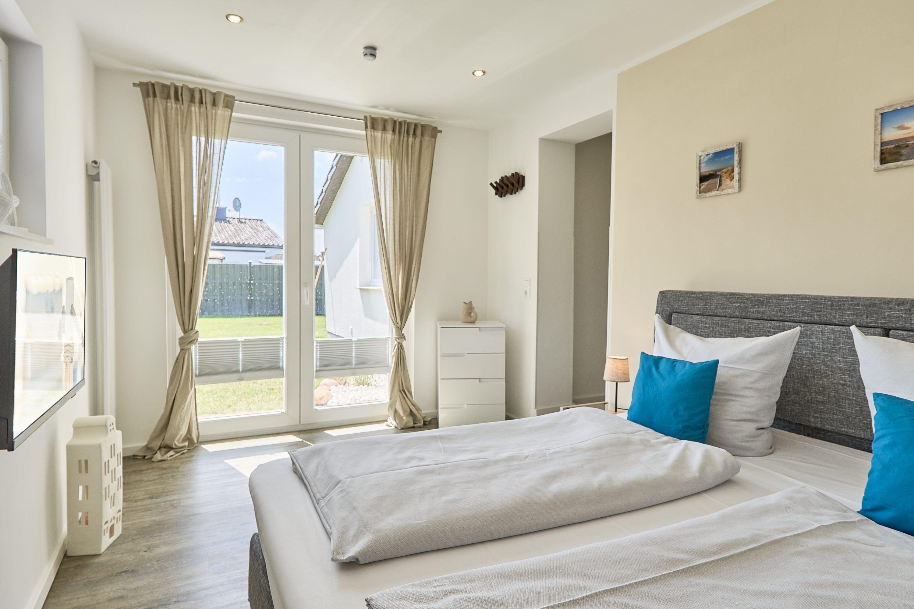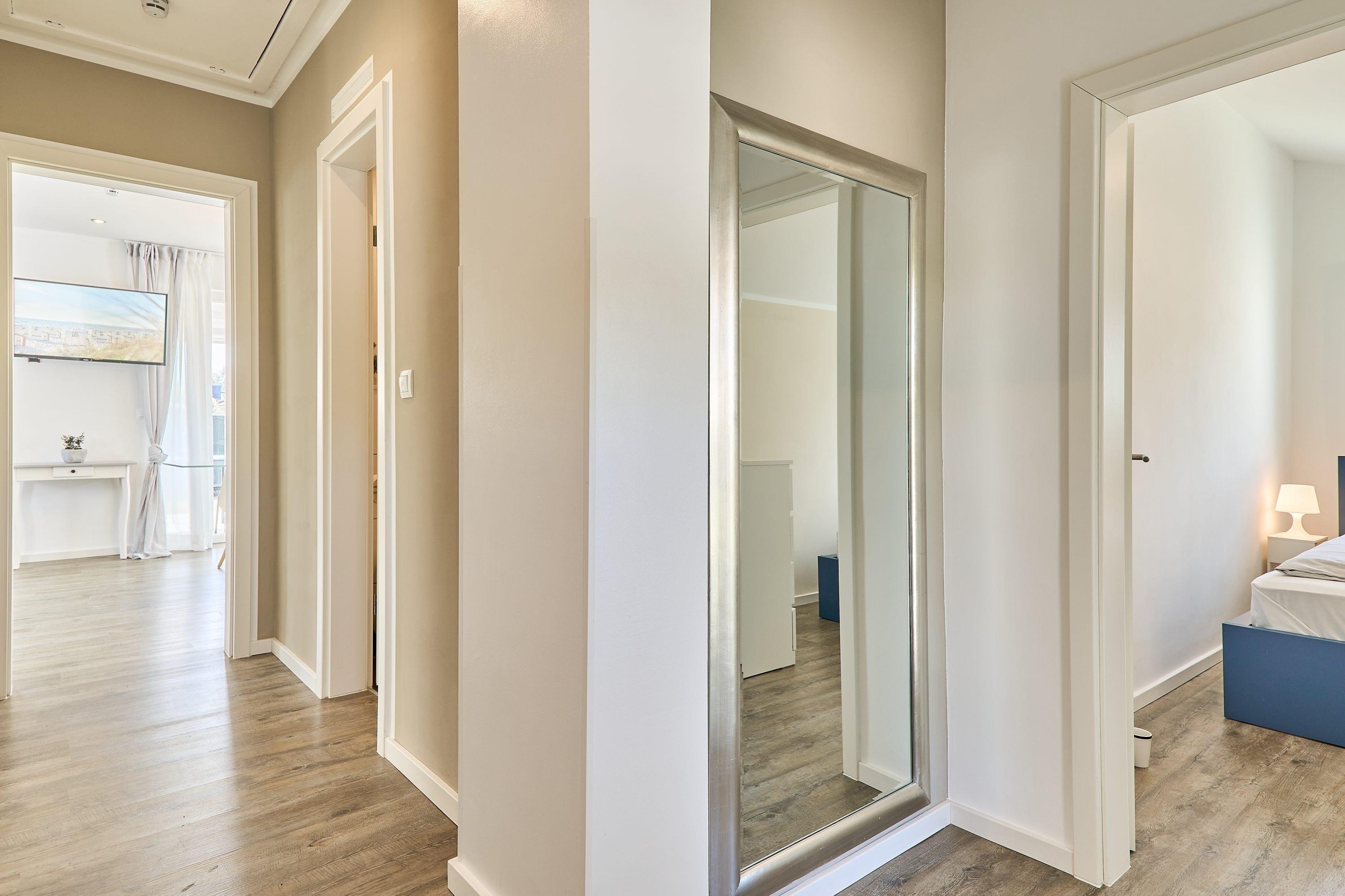 Eingangsbereich / Flurbereich: Das erste Schlafzimmer ist mit einem Doppelbett (1.60m x 2.00m), zwei Nachttischen sowie mit einer Komode ausgestattet. Über den Flur gelangen Sie in den Abstellraum. Der Abstellraum bietet Ihnen ausreichend Platz, um beispielsweise Ihre Koffer abzustellen. Weiter, über den Flurbereich gelangen Sie auf der rechten Seite in das Duschbad. Gegenüber liegt das Ankleidezimmer, von welchem Sie weiter in das zweite Schlafzimmer gelangen. Hier stehen Ihnen ein Doppelbett (1.80m x 2.00m), 2 Nachttische, 1 Kommode sowie ein TV zur Verfügung.