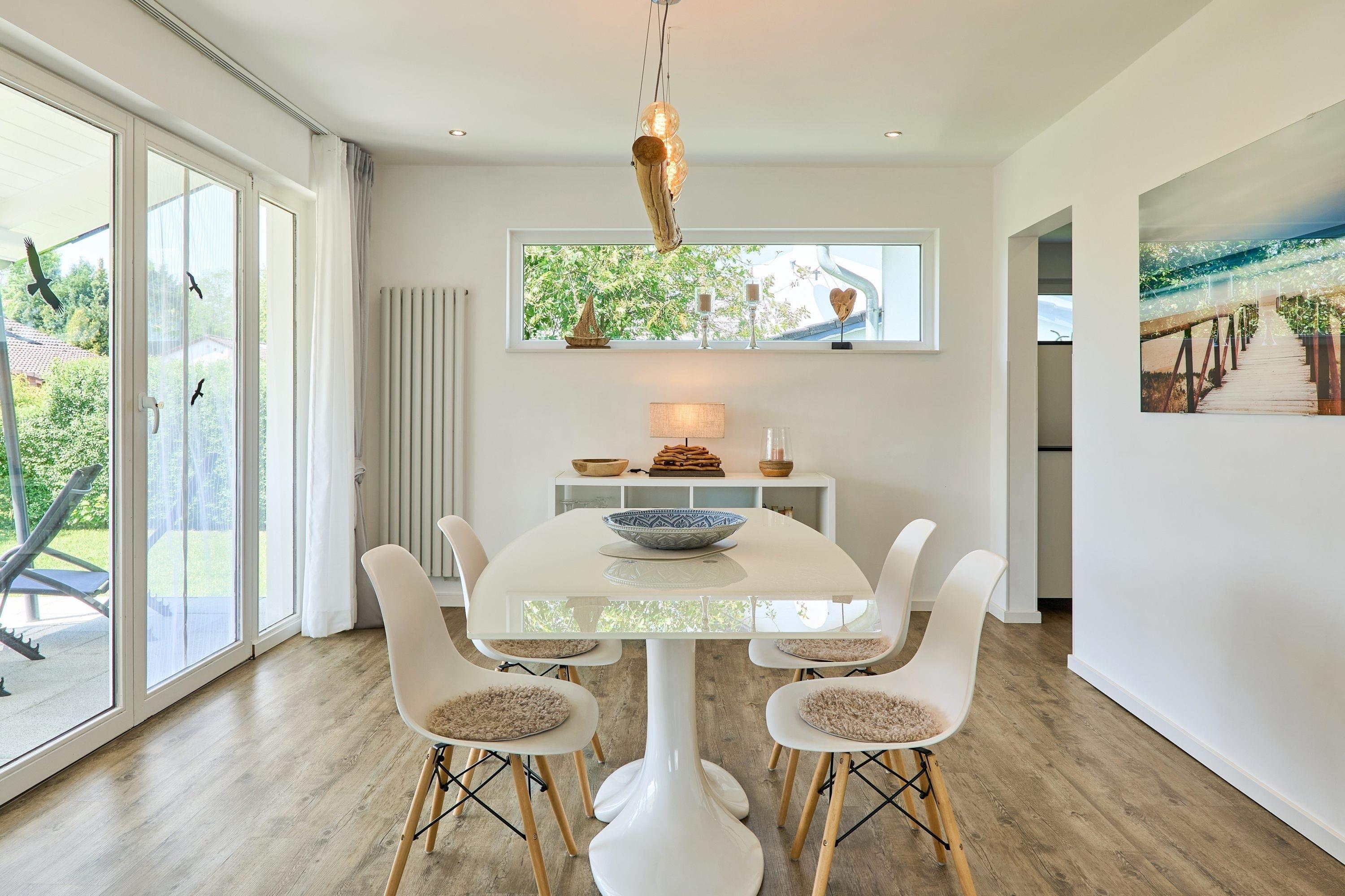 Am Ende von dem Flurbereich gelangen Sie in das herrlich, lichtdurchflutete Wohnzimmer. Hier stehen Ihnen eine Sofaecke, ein TV, eine Relax Liege, ein Lesesessel sowie ein großer Esstisch mit 4 Stühlen zur Verfügung. Über den Flurbereich erreichen Sie die Terrasse mit Überdachung sowie den großen, eingezäunten Garten.