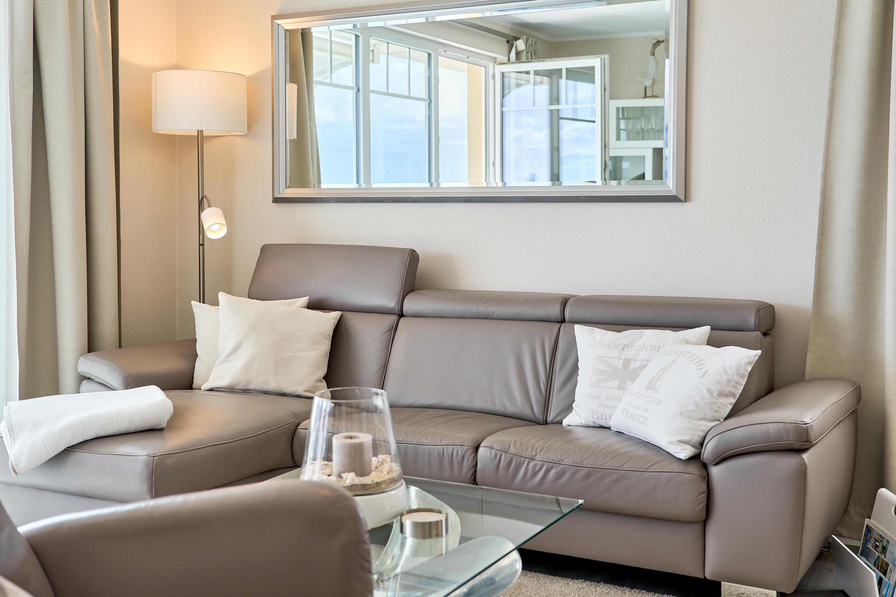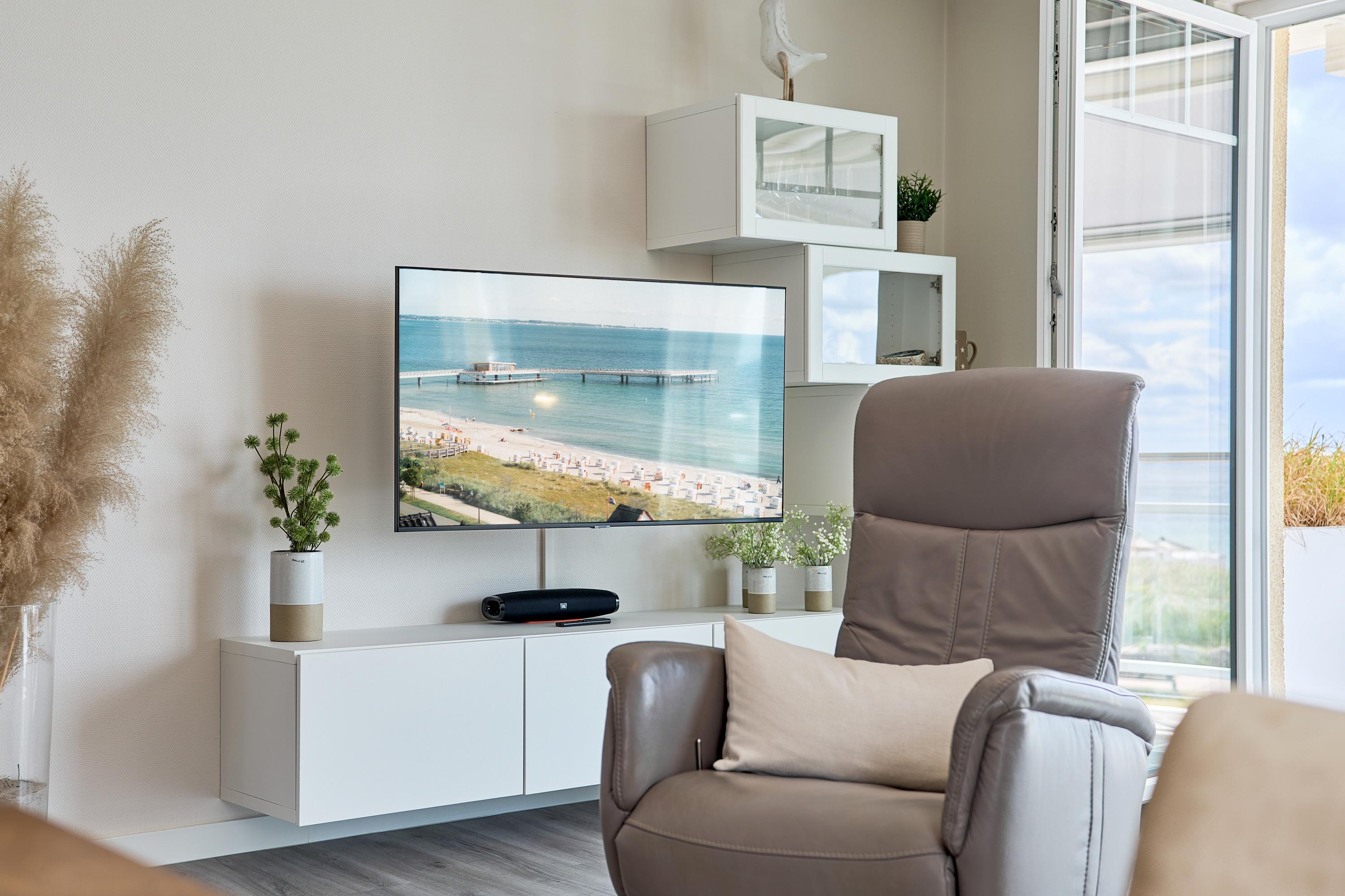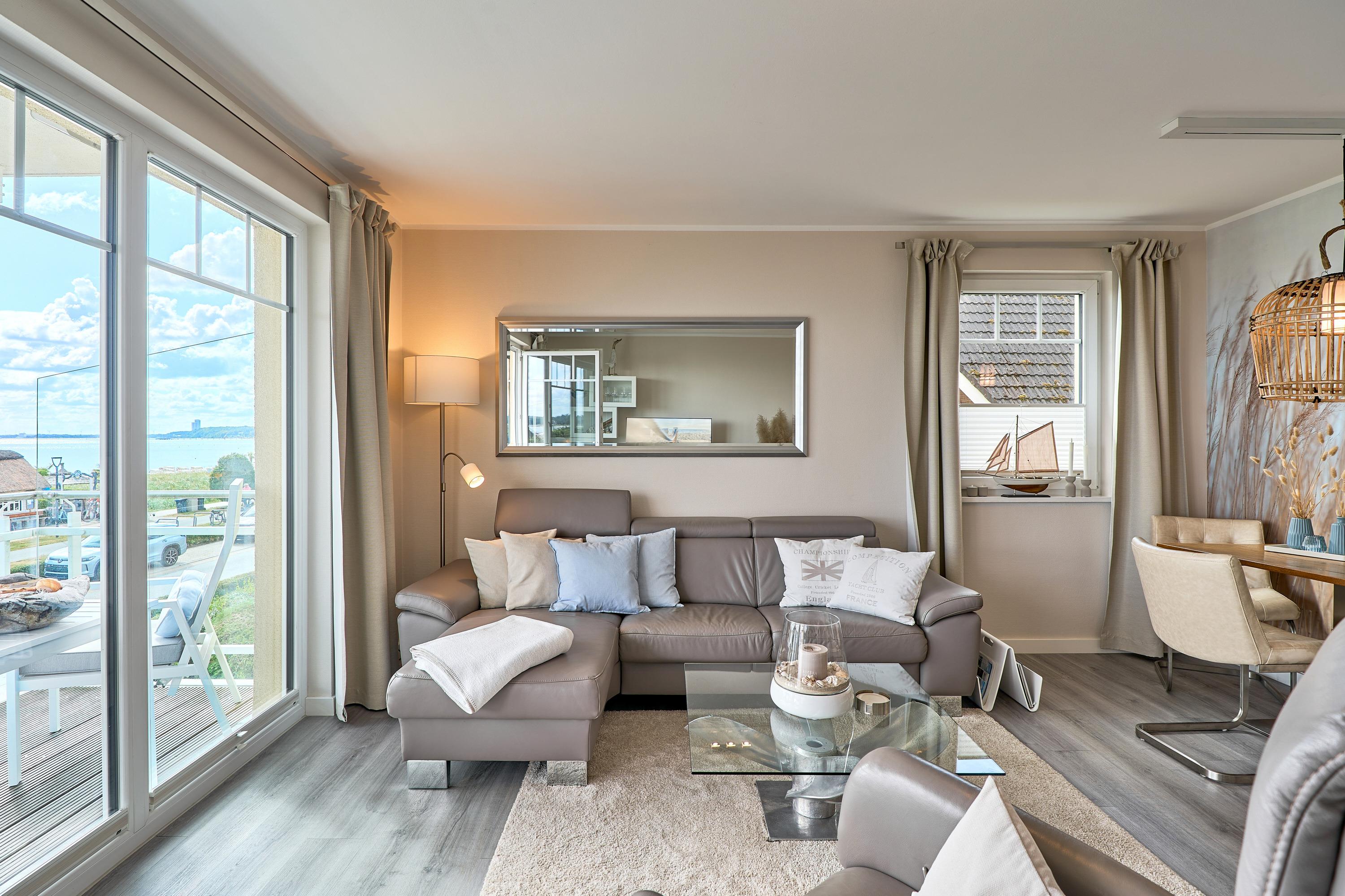 Die schöne Ferienwohnung Maison Baltique ist modern und freundlich eingerichtet. Vom offenen Wohn-Essbereich haben Sie einen direkten Blick auf die Ostsee. Die Küchenzeile ist mit einer Kaffeemaschine sowie einer Nespresso Maschine und einem Wasserkocher ausgestattet. Geschirrspüler, Kombigerät Backofen mit Mikrowelle, Ceran-Kochfeld und Kühlschrank sind für Sie vorhanden. Der Wohn- und Essbereich verfügt über einen Essplatz mit Meerblick sowie einen gemütlichen Sitzbereich mit Eck-Couch und einen bequemen Relax-Sessel sowie einem Schreibtisch. Smart-TV, kostenloses WLAN und Bluetooth-Lautsprecher stehen für Sie zur Verfügung. Das Tageslicht Badezimmer verfügt über eine Regendusche sowie einen Handtuchheizkörper und ist mit einer Waschmaschine und Fußbodenheizung ausgestattet. Das Schlafzimmer verzaubert mit einem bequemen Boxspringbett (1,80x2,00m), einem geräumigen Kleiderschrank sowie einem Flat TV. Beide Balkone sind möbliert. Ein Sonnenschutz steht für Sie zur Verfügung. Der Balkon zur Meerseite verfügt zudem über eine elektrische Markise.