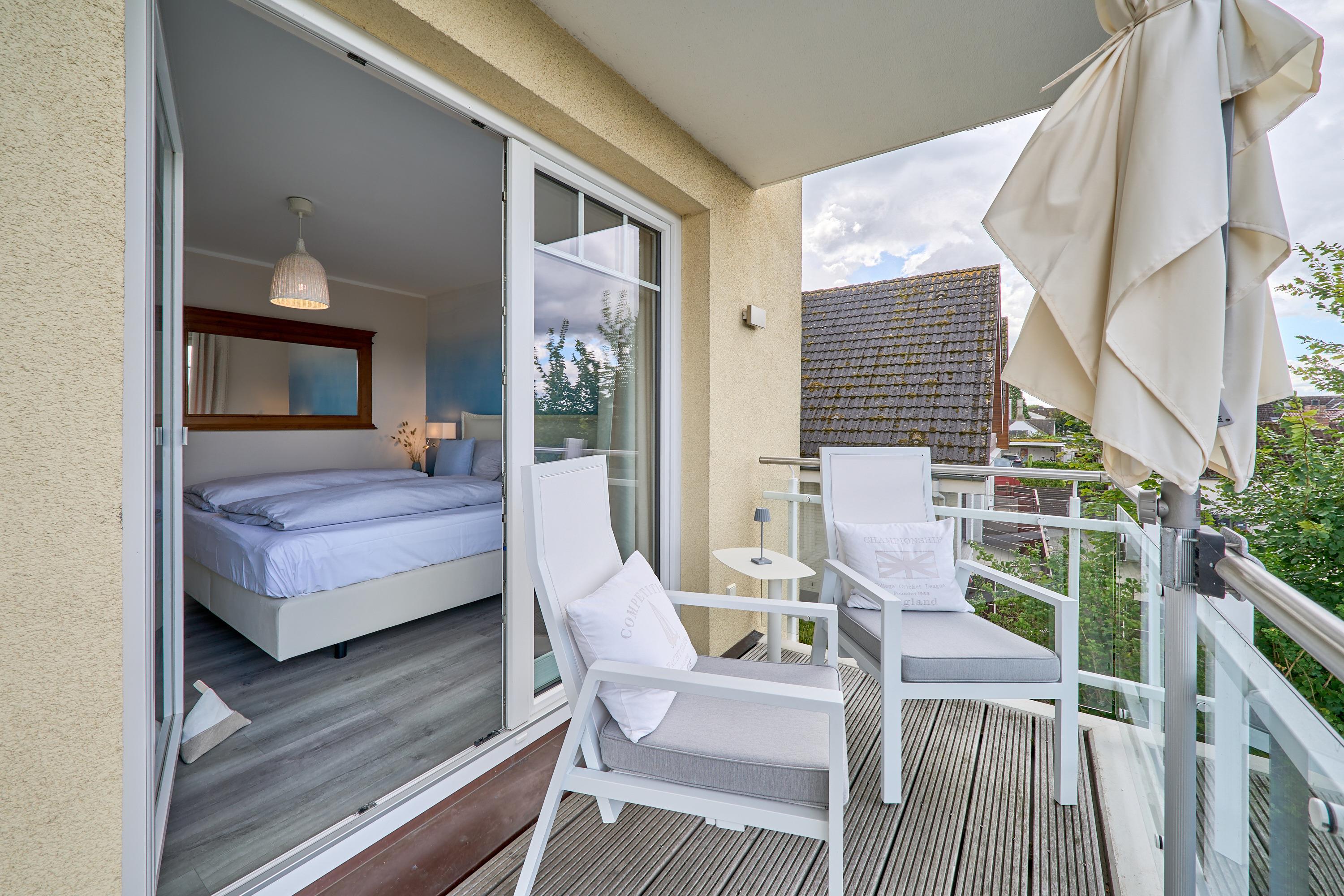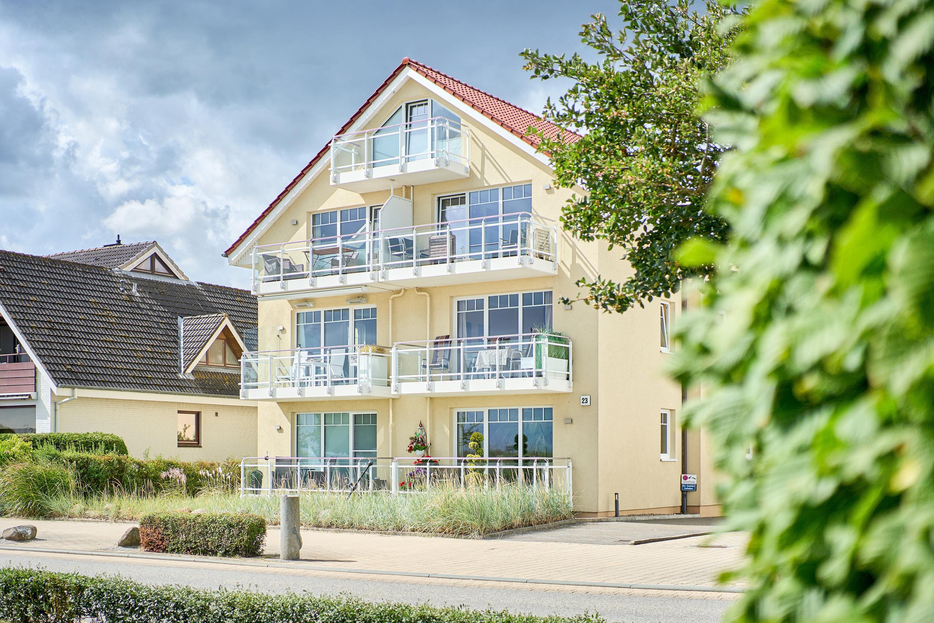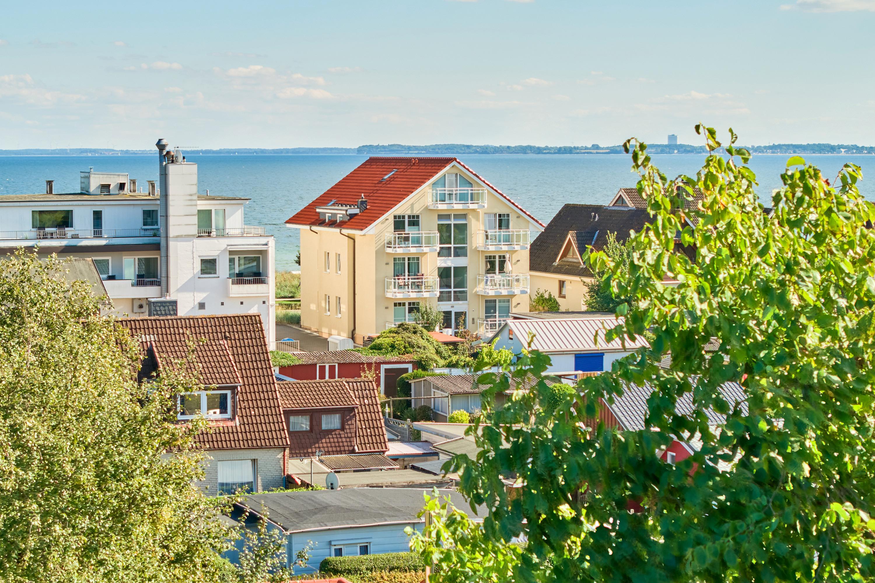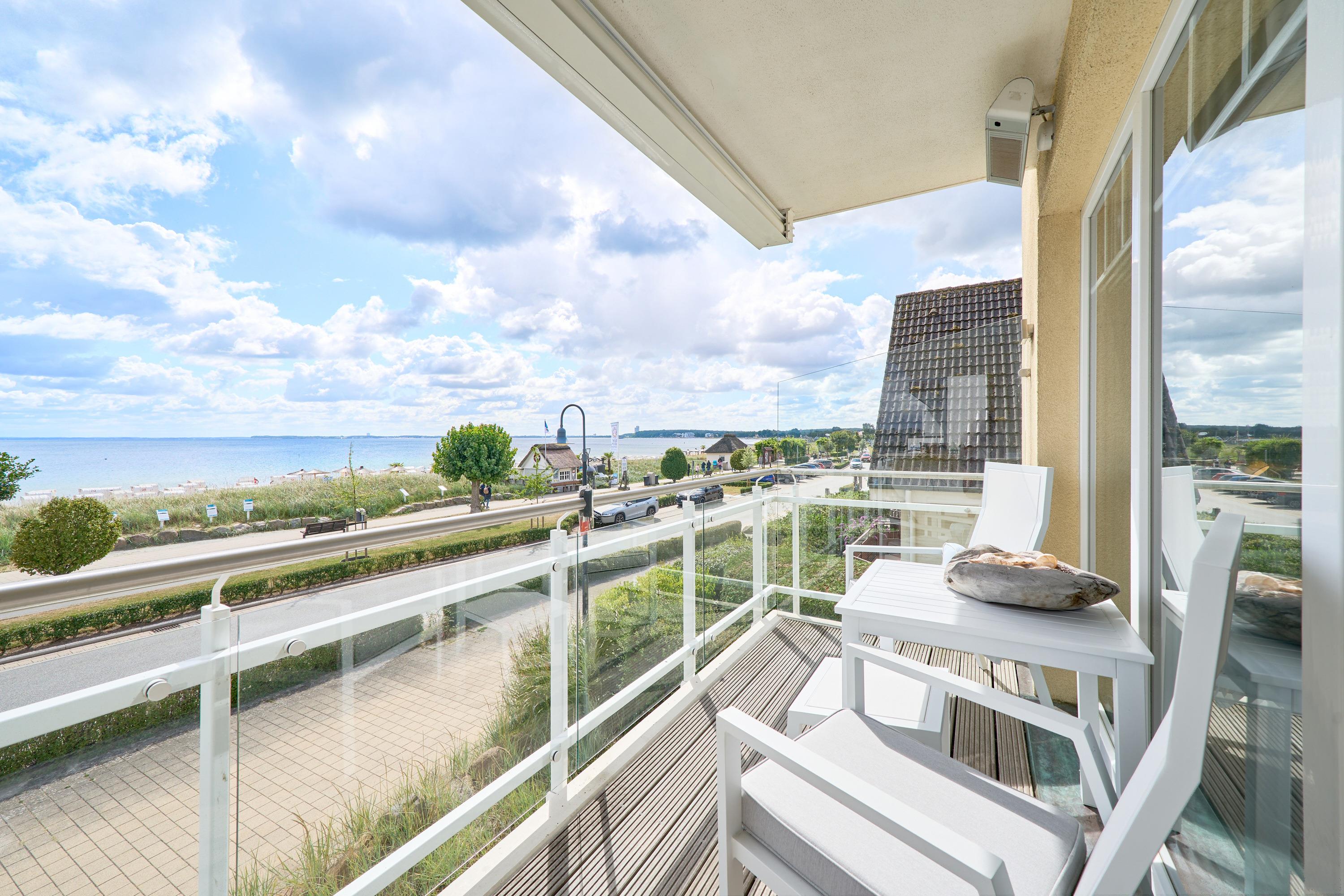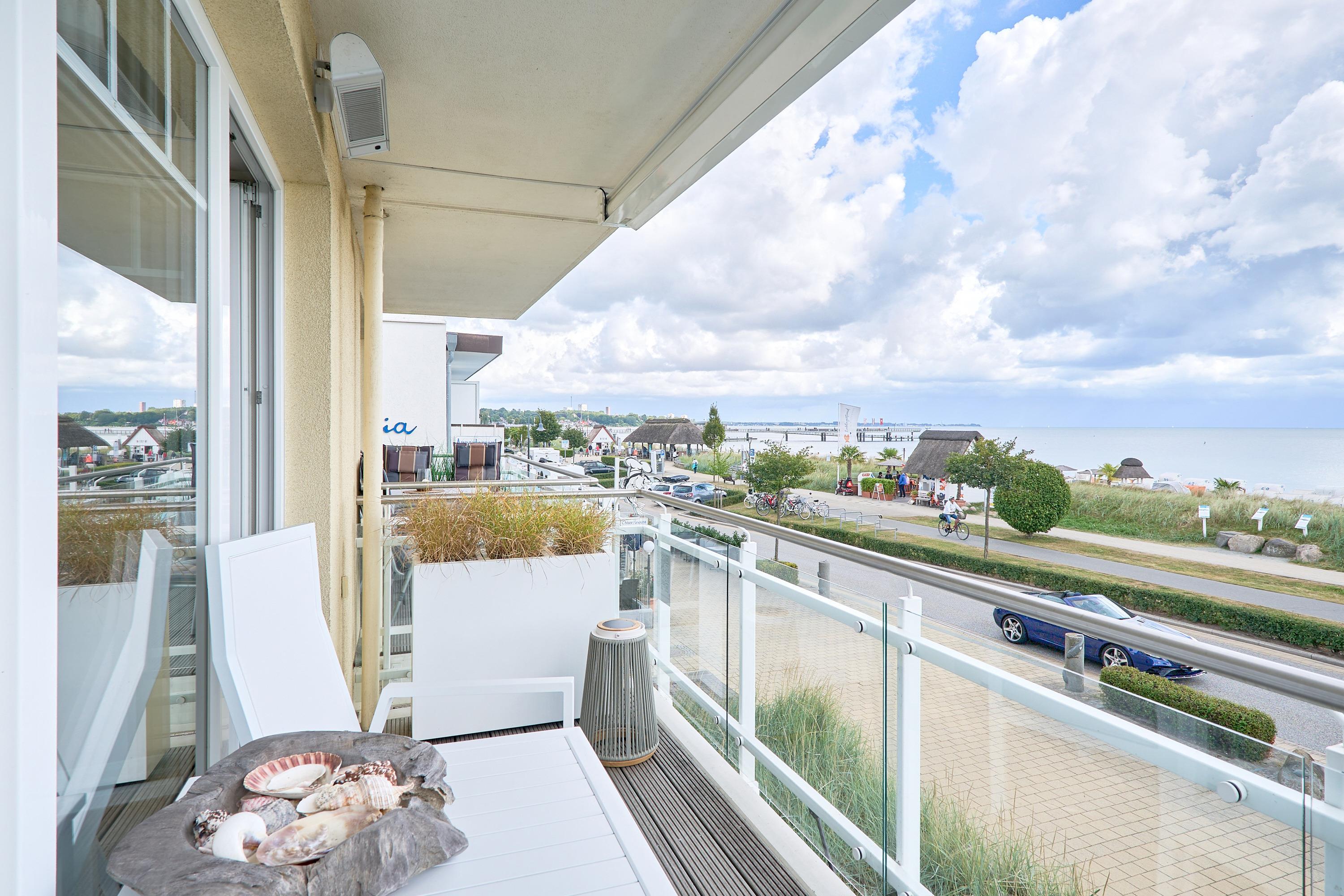 Sehr schöne 2-Zimmer-Ferienwohnung, ca. 60m², mit 100% Ostseeblick und zwei Balkonen im 1. OG in Haffkrug mit Duschbad, Waschmaschine, Carport Stellplatz mit E-Bike Ladestation für bis zu 2 Personen.