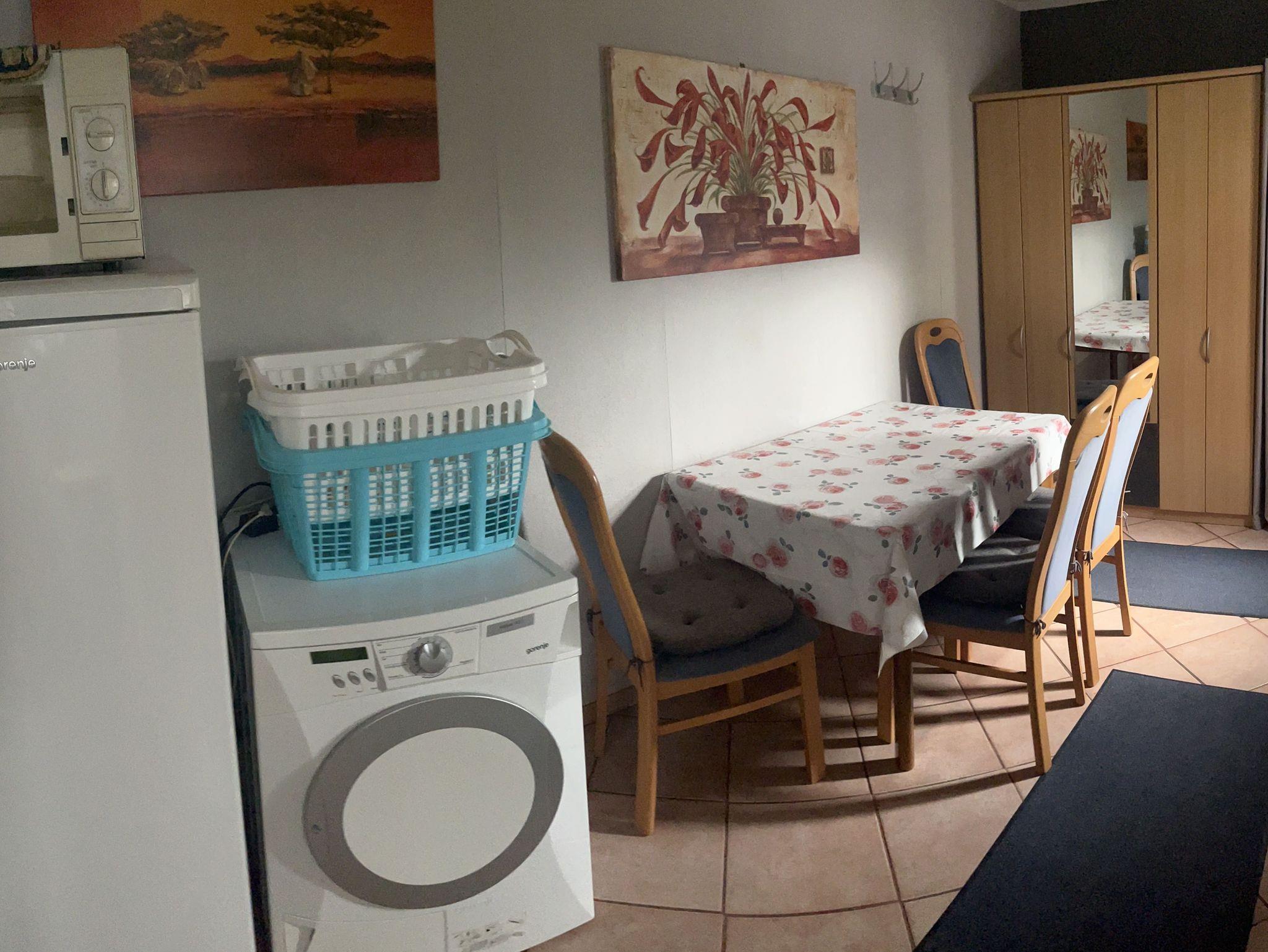 In der Diele befindet sich zudem ein weiterer großer Kühlschrank, ein Trockner, sowie eine Heißluftfriteuse und ein Sandwichtoaster. Außerdem gibt es Gerätschaften für die Reinigung, sowie Bügelbrett und Bügeleisen.