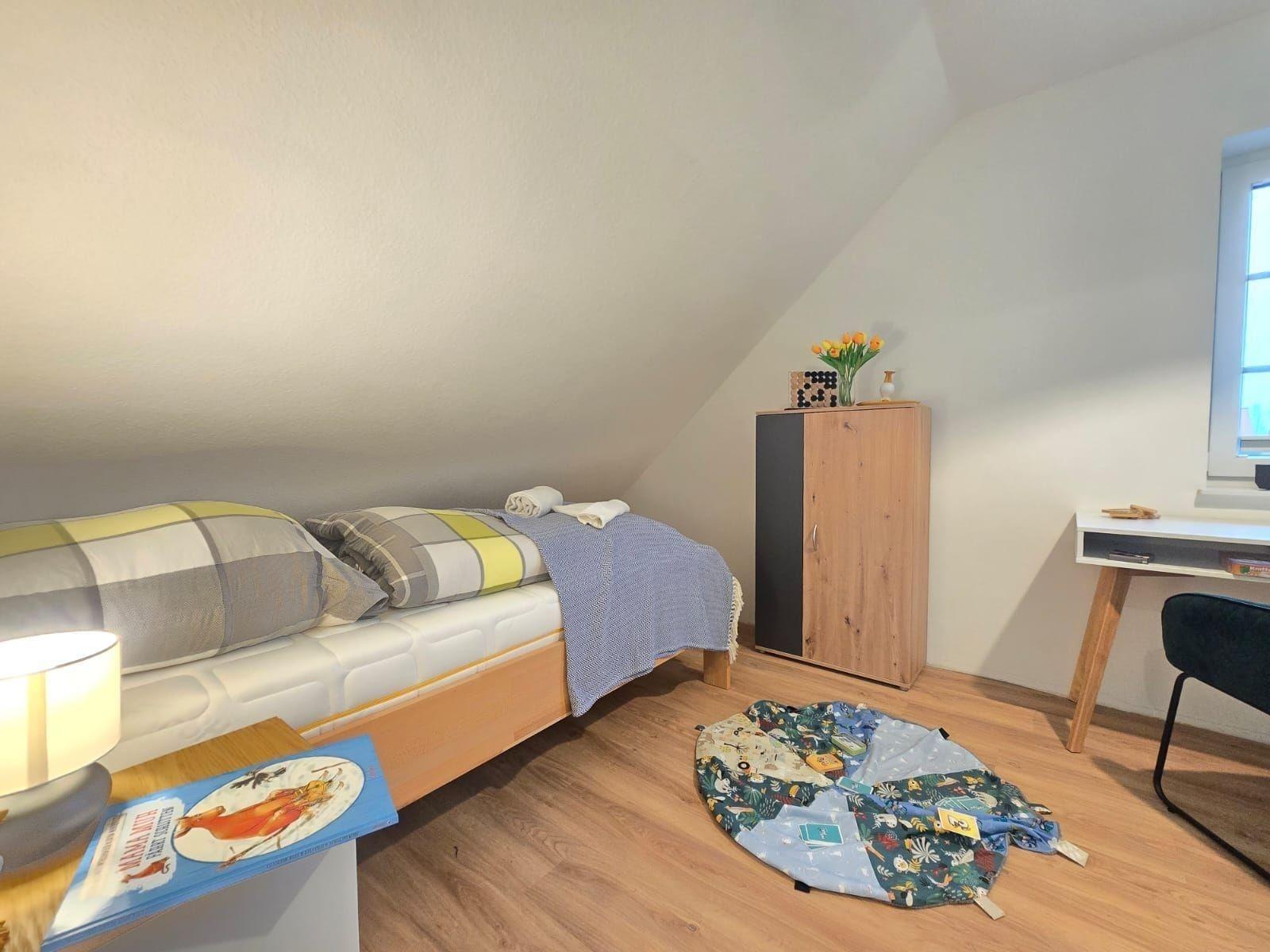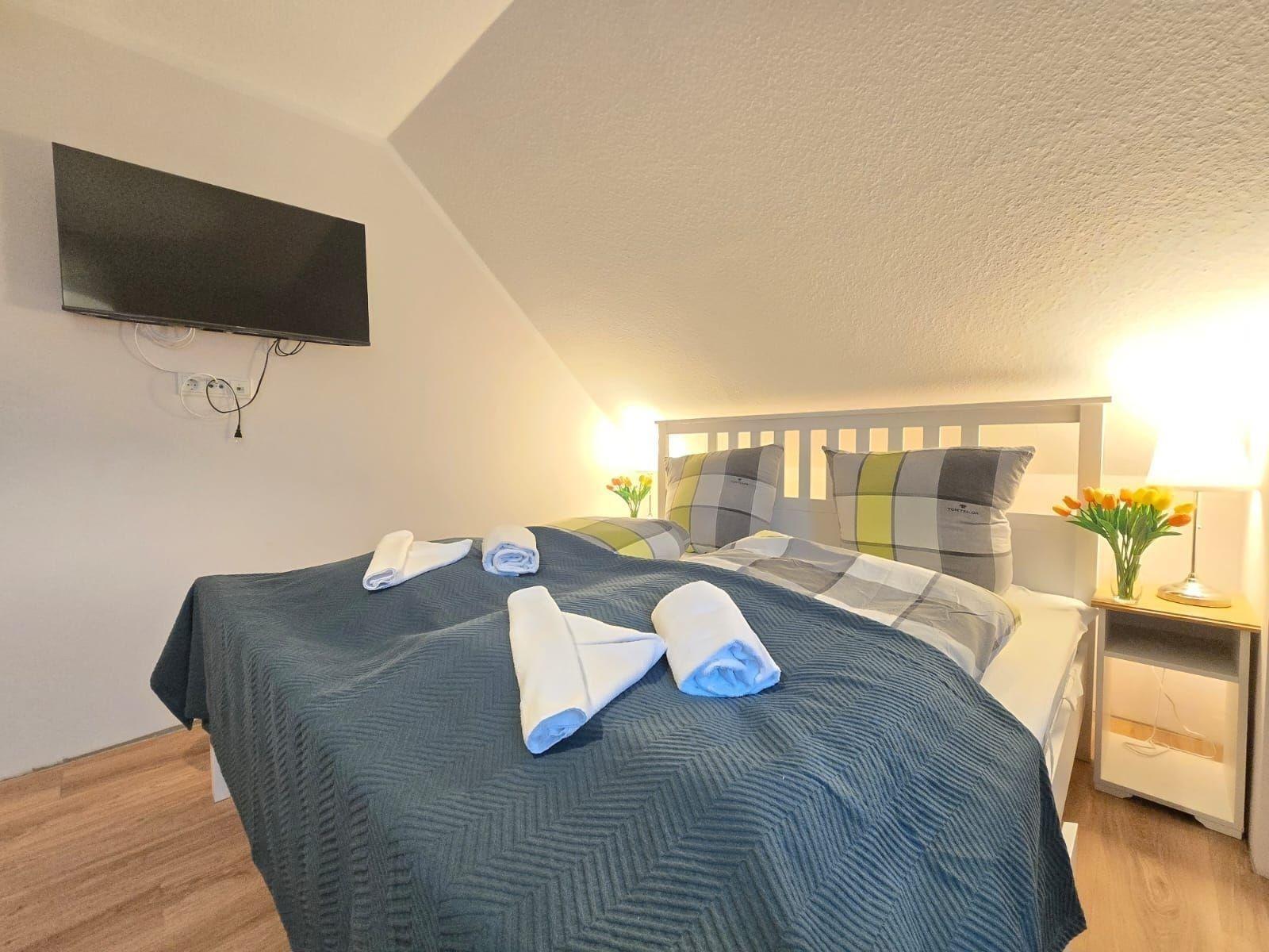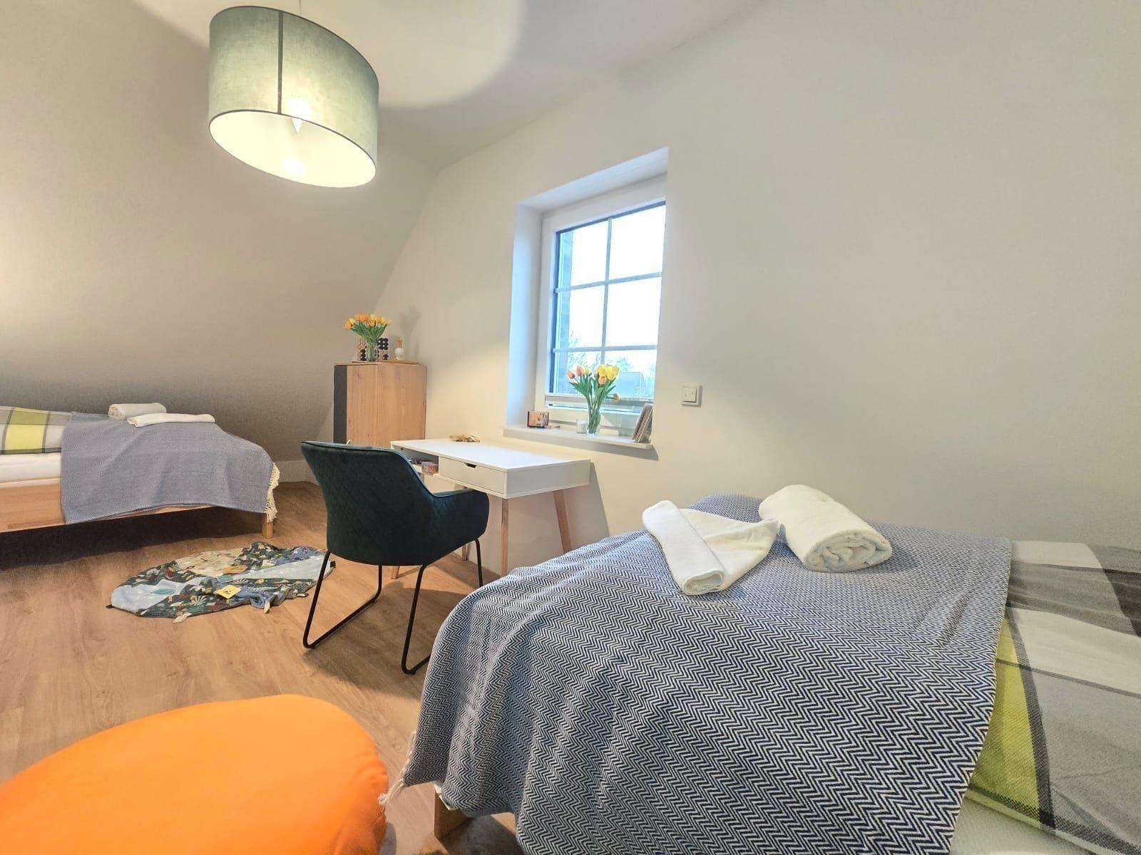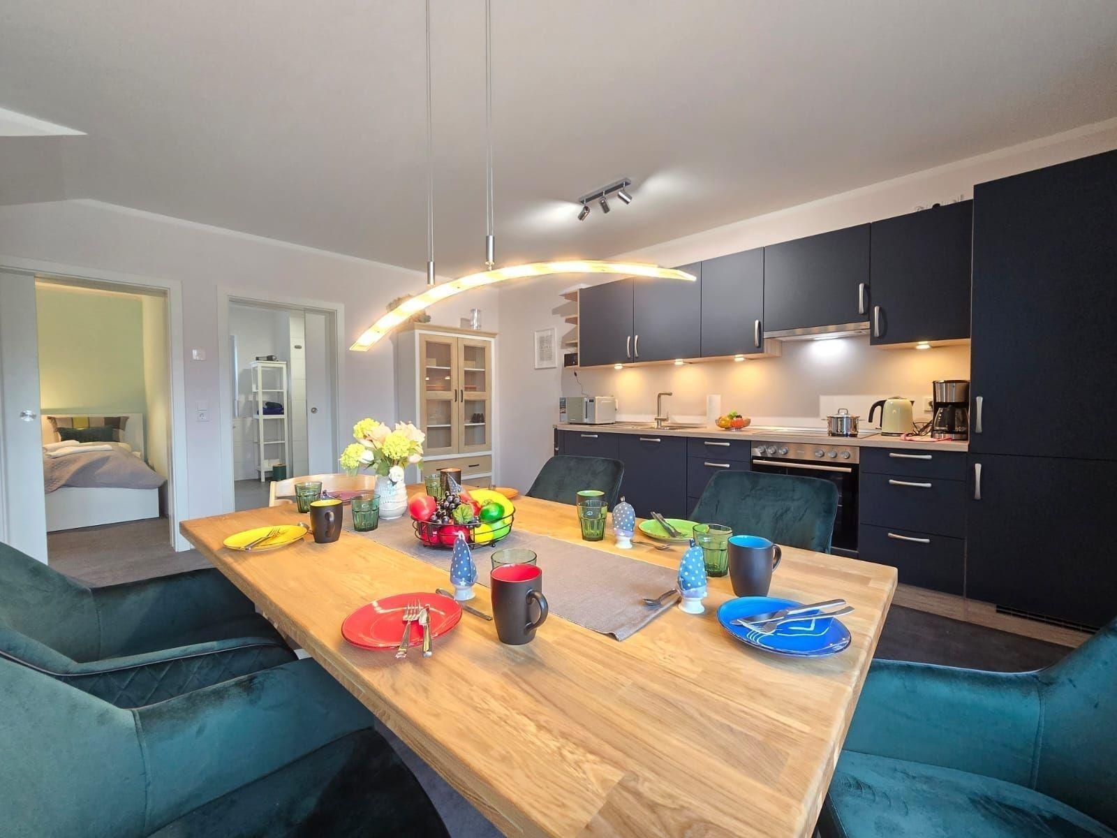 Die Ferienwohnung bietet großzügigen Raum und moderne Ausstattung für einen komfortablen Aufenthalt. Sie verfügt über drei Schlafzimmer, darunter ein Doppelbett und vier Einzelbetten, die ideal für Familien und Gruppen geeignet sind. Die offene Küche ist voll ausgestattet mit Geschirrspüler, Elektro-/Gasherd, Backofen und Kühlschrank, was das Zubereiten von Mahlzeiten zum Vergnügen macht. Für gemütliche Abende stehen eine HiFi-Anlage und ein DVD-/Blu Ray-Player zur Verfügung.