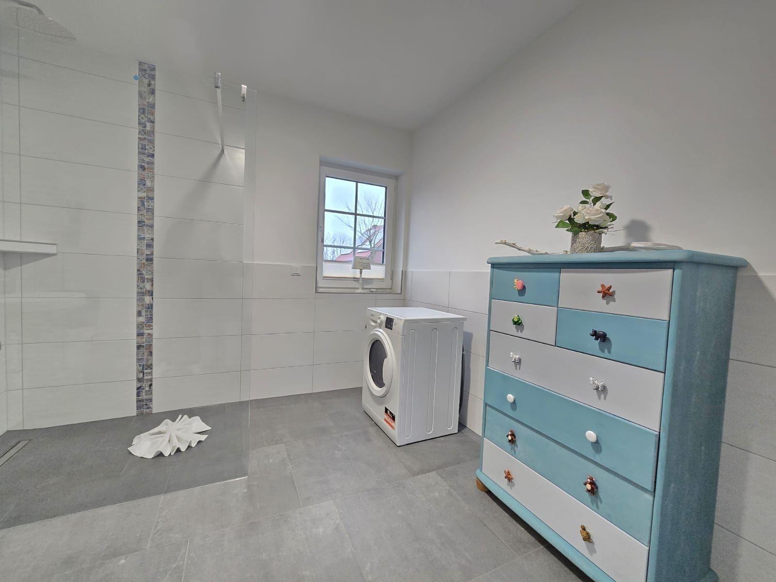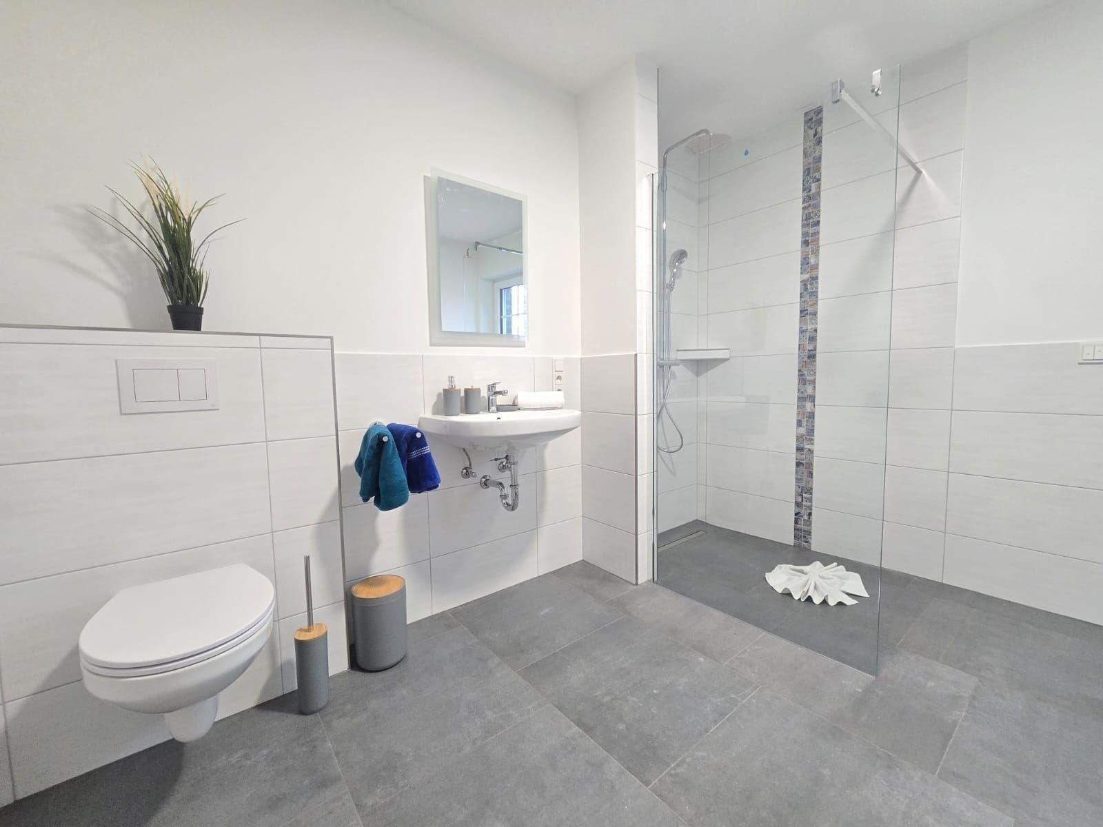 Die Ferienwohnung bietet eine moderne und komfortable Ausstattung, die für eine Vielzahl von Gästen geeignet ist. Mit drei Schlafzimmern, zwei Doppelbetten und zwei Einzelbetten steht ausreichend Platz zur Verfügung. Die beiden Badezimmer sind mit bodengleichen Duschen und einem Fenster ausgestattet, was für zusätzlichen Komfort sorgt. Die offene Küche überzeugt durch einen Geschirrspüler, Elektro-/Gasherd, Backofen, Mikrowelle und Kühlschrank. Praktische Annehmlichkeiten wie WLAN, Waschmaschine und ein Parkplatz runden das Angebot ab. Für Familien sind Kinderhochstuhl, Kinderspielzeug und ein Kindertoilettensitz vorhanden. Barrierefreiheit und Allergikerfreundlichkeit gewährleisten, dass sich jeder wohlfühlt. Das große Wohnzimmer mit Sofa und Esstisch lädt zum Verweilen ein, während die HiFi-Anlage und der Fernseher für Unterhaltung sorgen. Fußbodenheizung und ein Starterset mit Pflegeprodukten sorgen für ein angenehmes Ambiente.