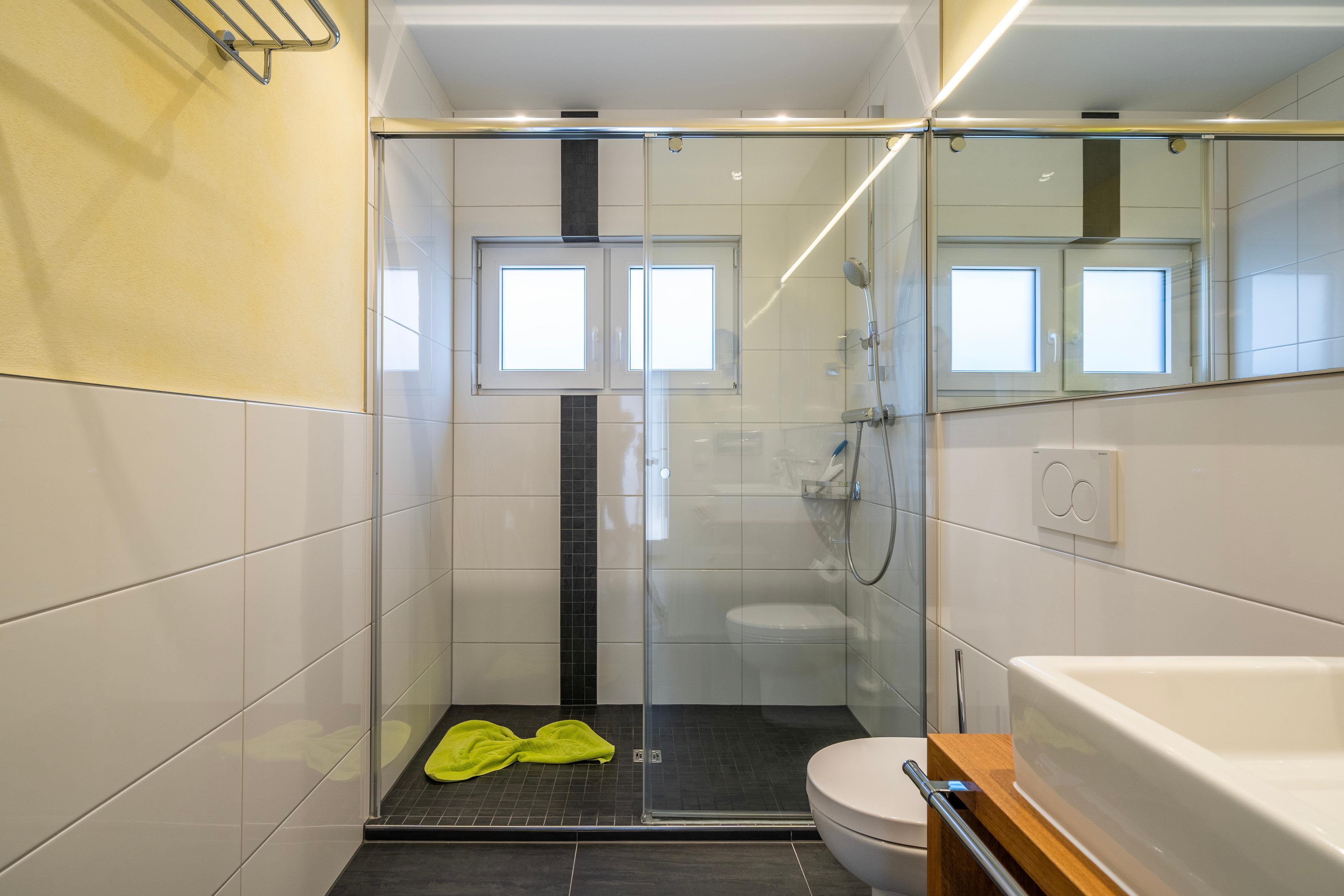- begehbare Glasdusche, WC, Fön