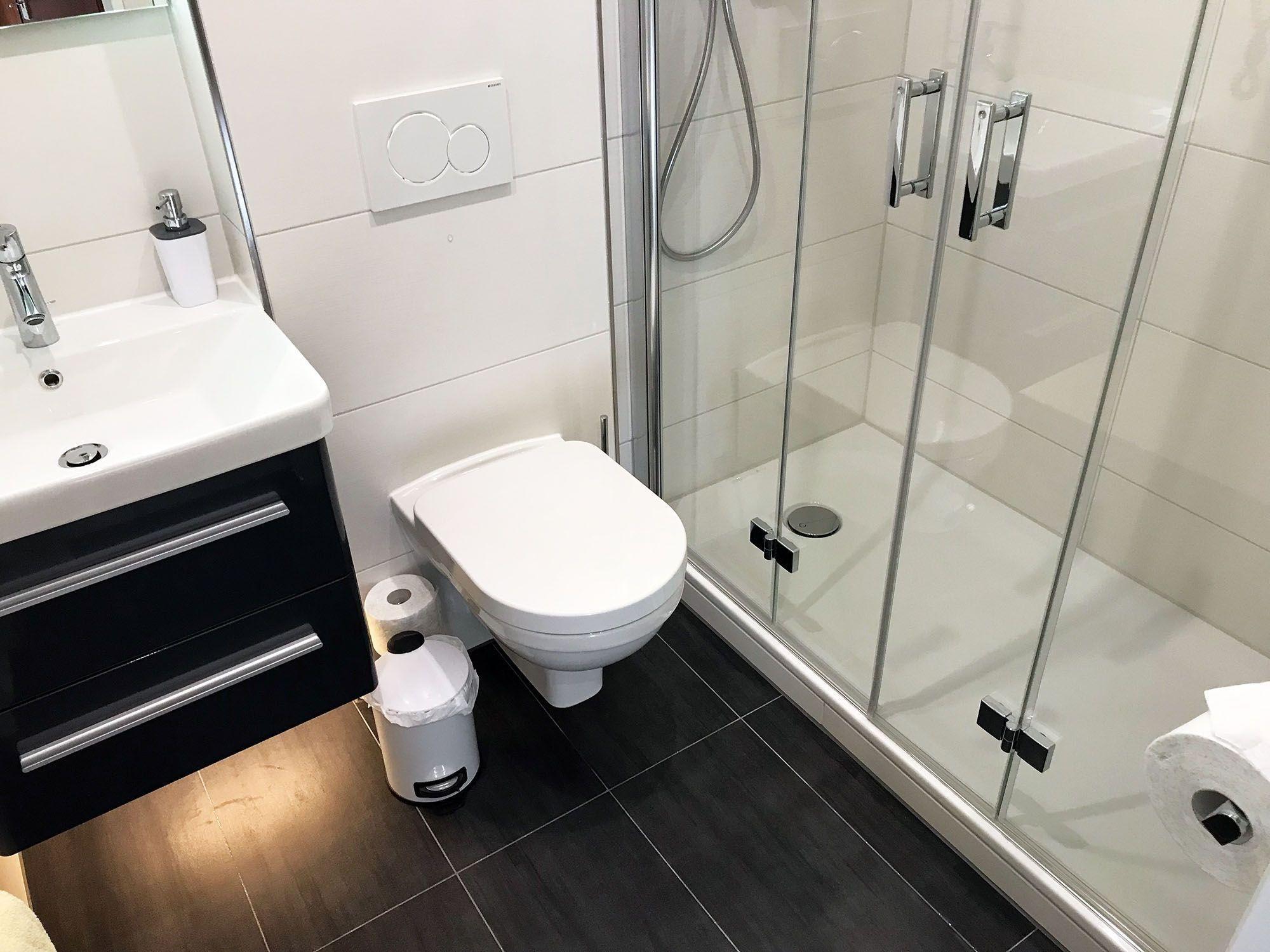 Den Tag starten Sie am Besten mit einer Erfrischung unter der großen Regenwalddusche. Für das Styling stehen Haartrockner, Kosmetikspiegel und ein beleuchteter Badspiegel zur Verfügung!