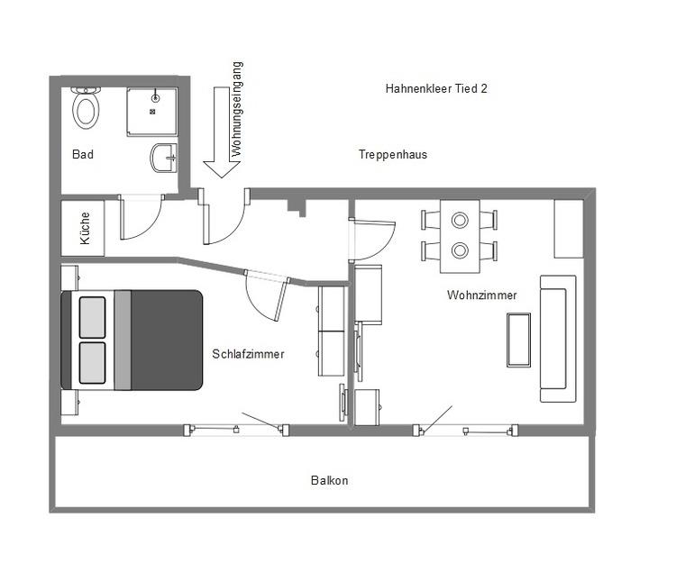 Sollten Sie mit mehreren Personen zusammen Ihren Urlaub verbringen wollen, so steht ihnen unsere Ferienwohnung Hahnenkleer Tied 1 direkt darunter gerne zusätzlich buchbar zur Verfügung.