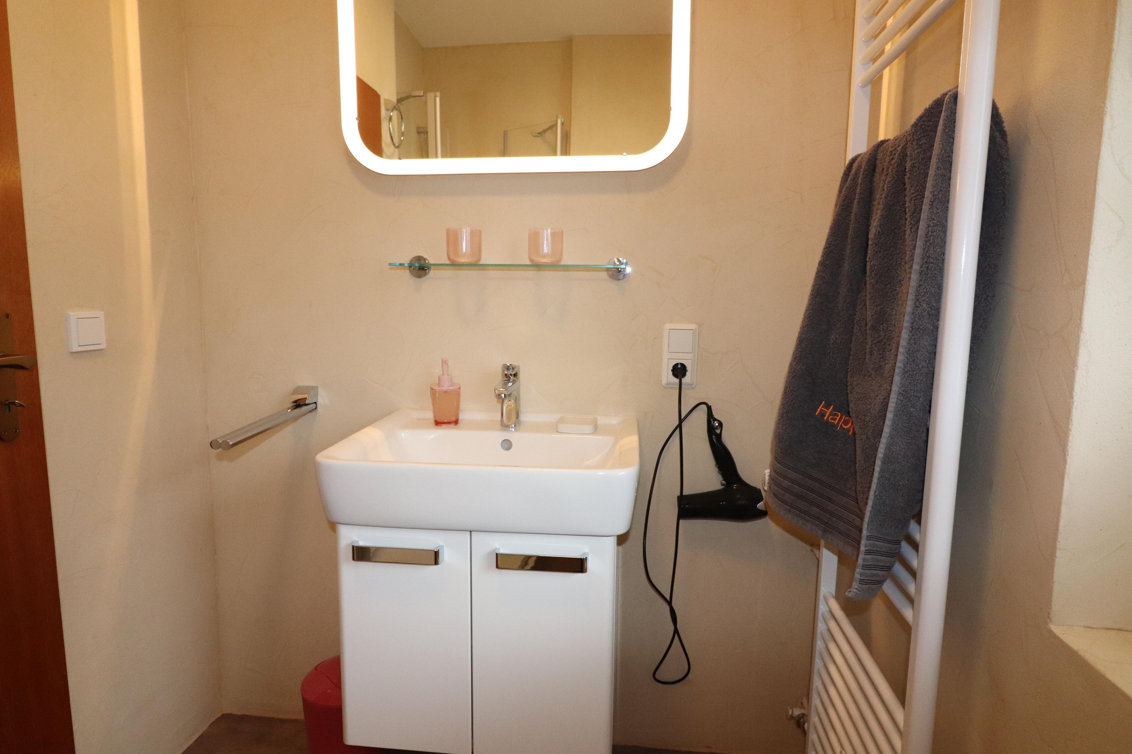 Auch das Bad ist frisch saniert und hat jetzt eine schöne flache Dusche. Fön ist vorhanden.