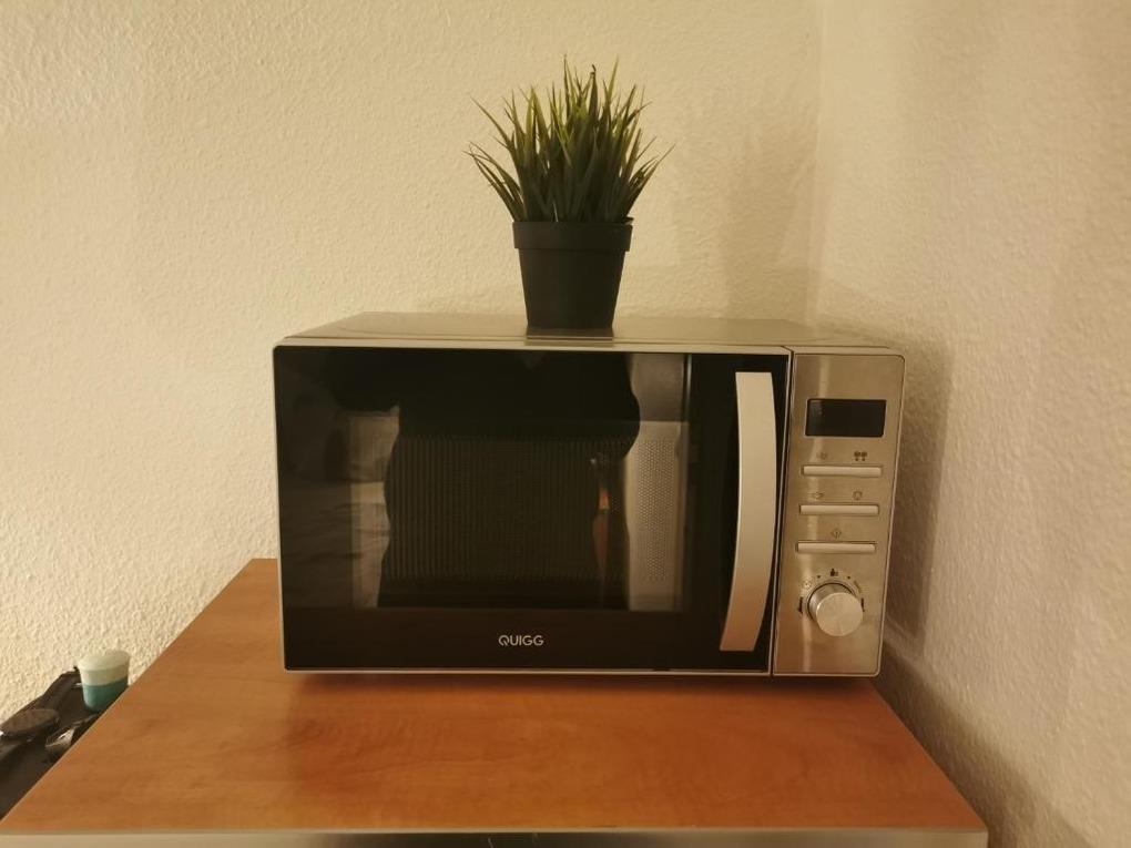Die Küchenzeile ist ausgestattet mit einem Kühlschrank und einer Mikrowelle, einer Herdplatte sowie einer Kaffeemaschine und einem Wasserkocher.